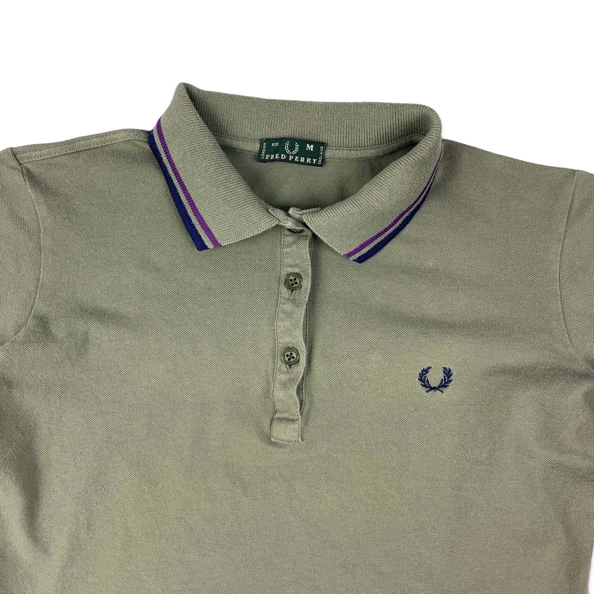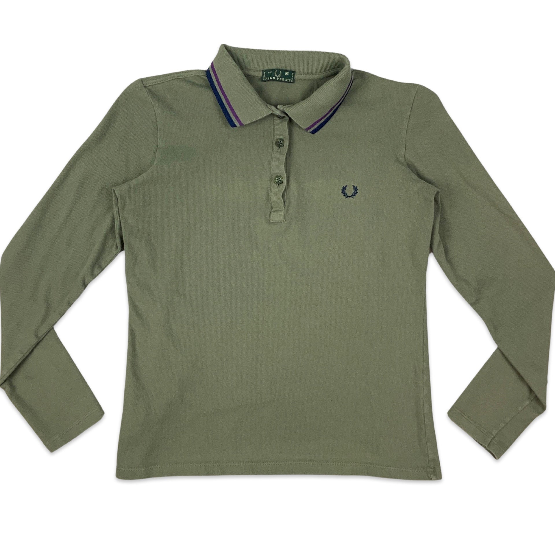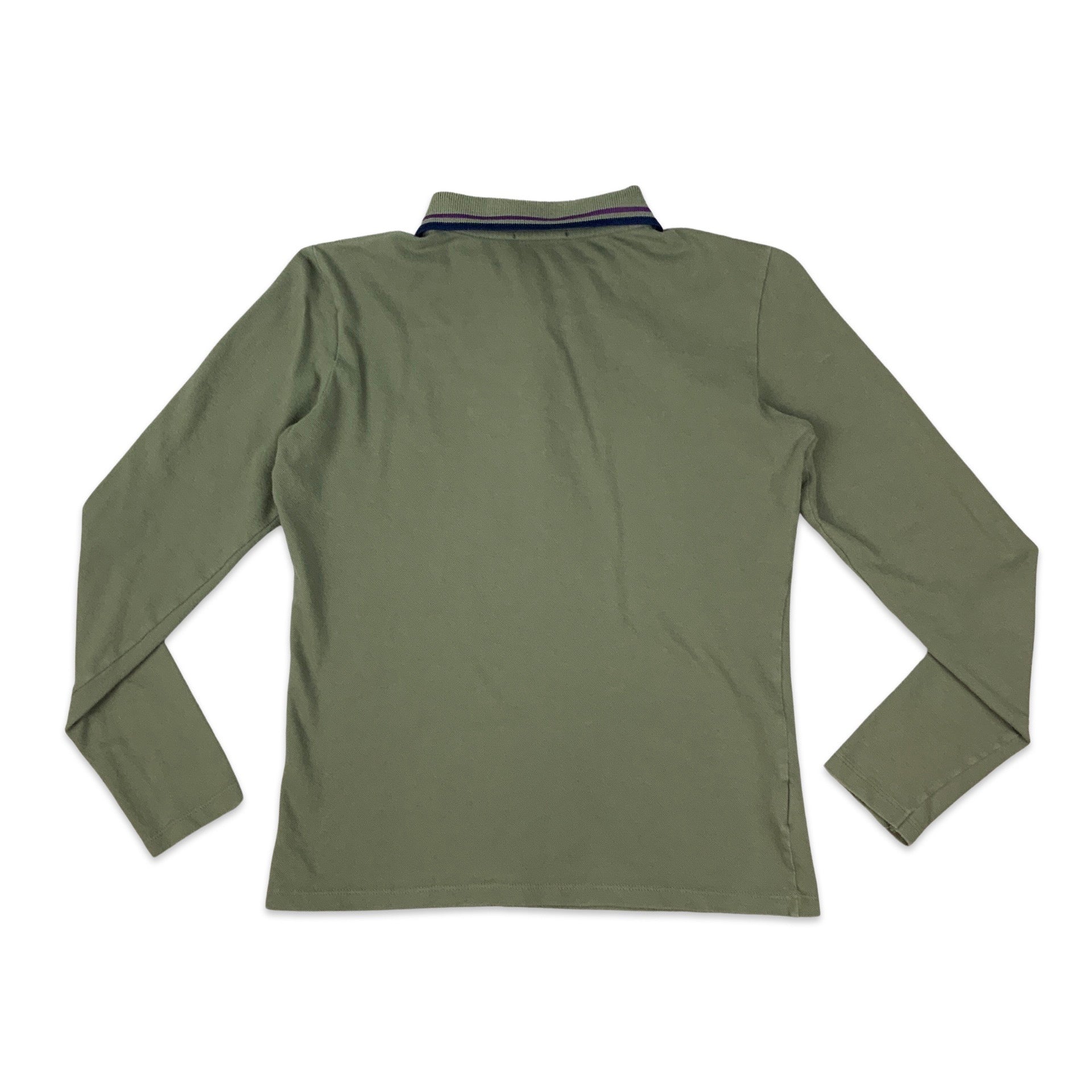 Vintage men’s Fred Perry rugby shirt. Green with navy and purple stripes on collar. 3 button down neck fastening. 95% Cotton, 5% Elastane.