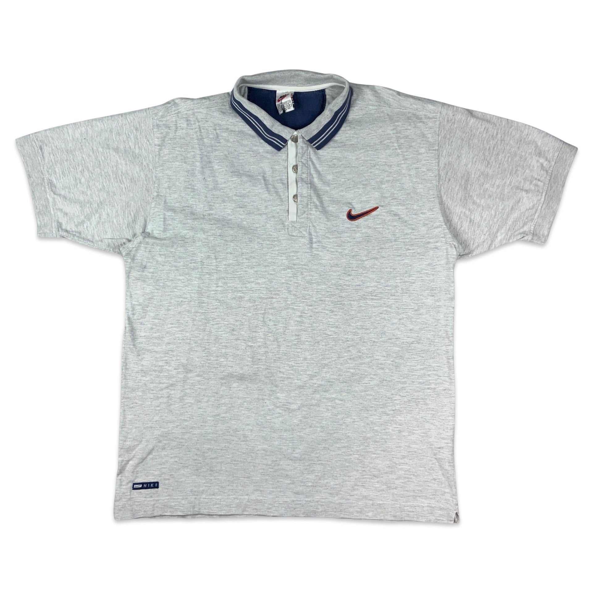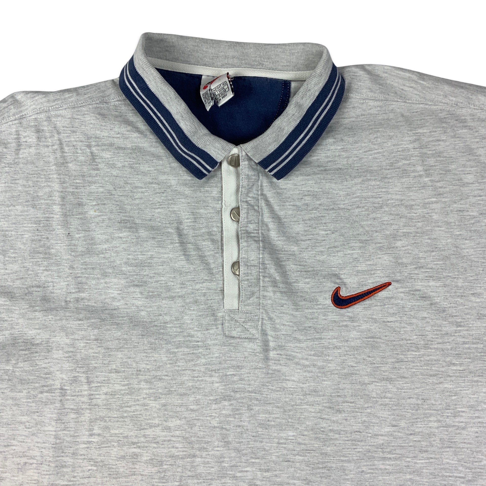 Men’s 90s Nike oversized polo shirt. Light grey with navy striped collar and navy & Orange Nike tick. Silver Nike 3 button up collar.