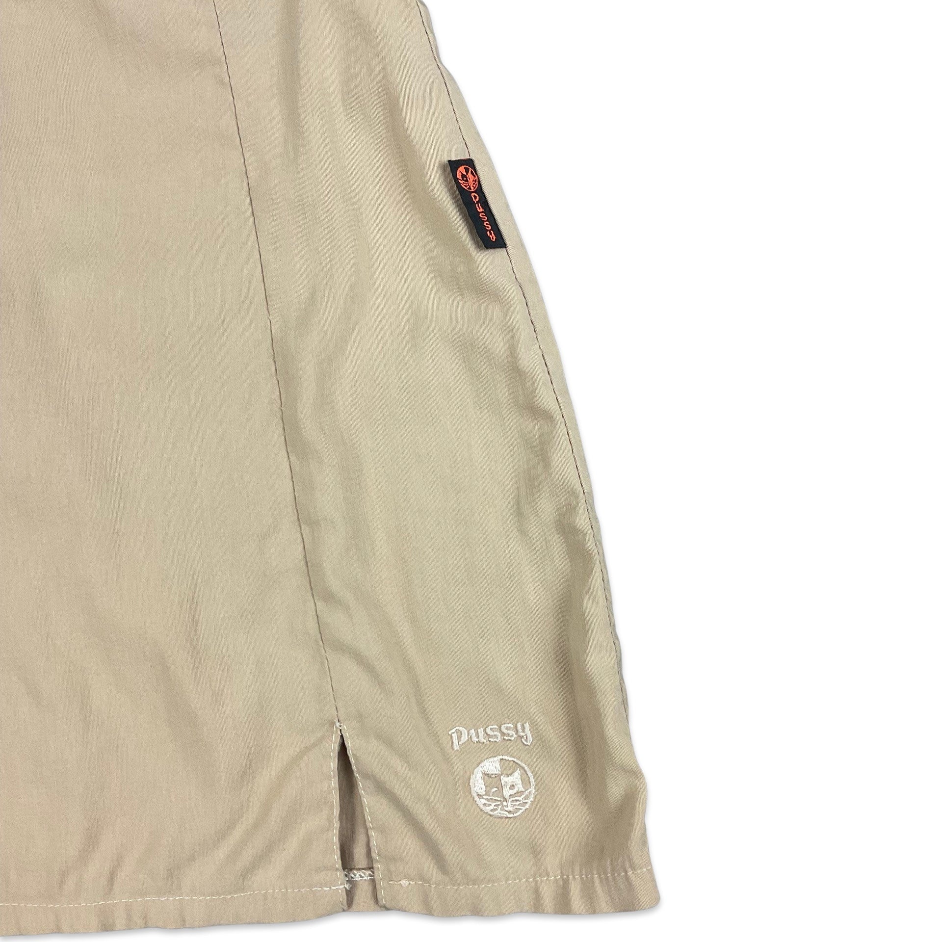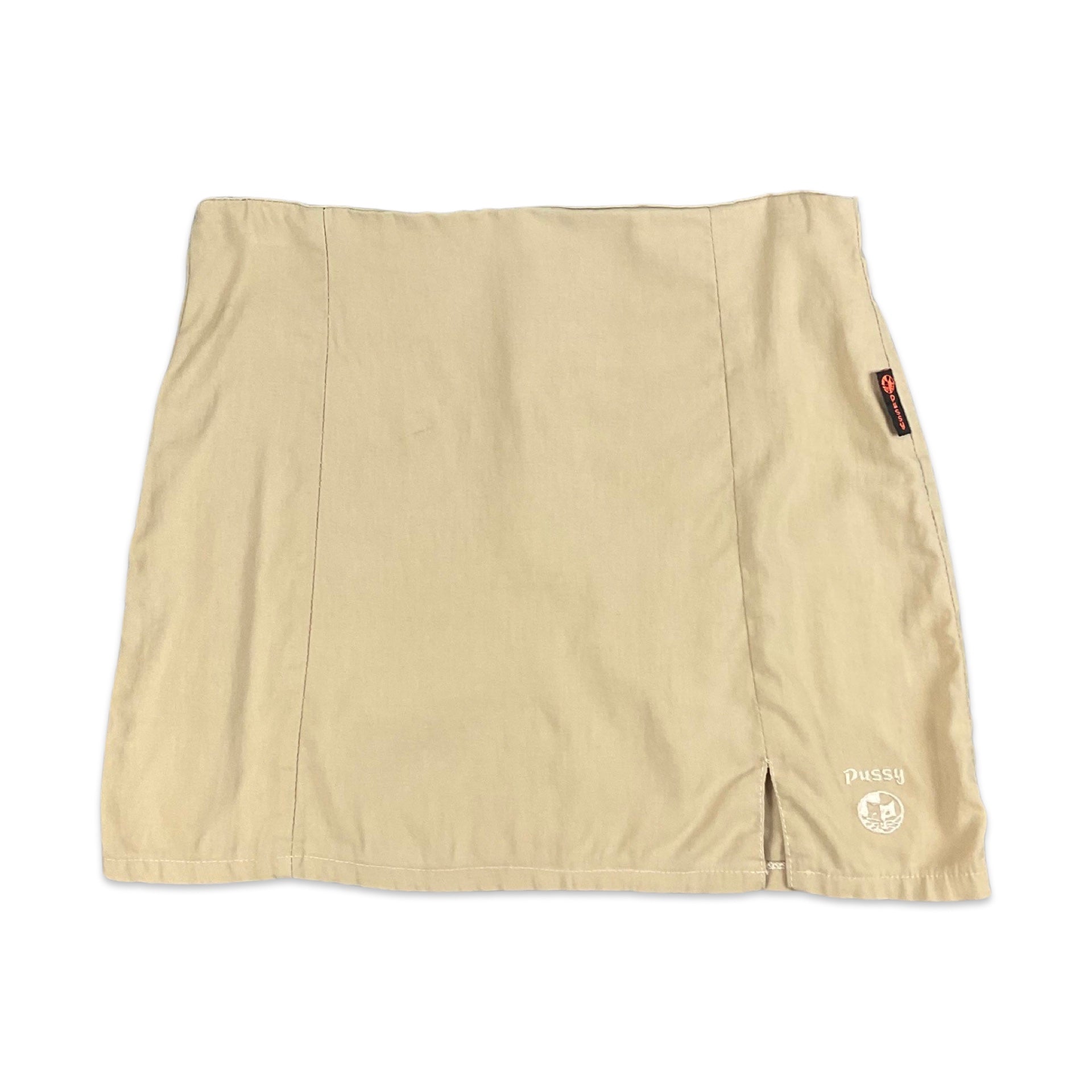 Women’s 90s beige bodycon mini skirt with small hem slit on front. Embroidered ‘Pussy’ and cat face on front. White top stitch. Back zip fastening. Stretchy fabric.