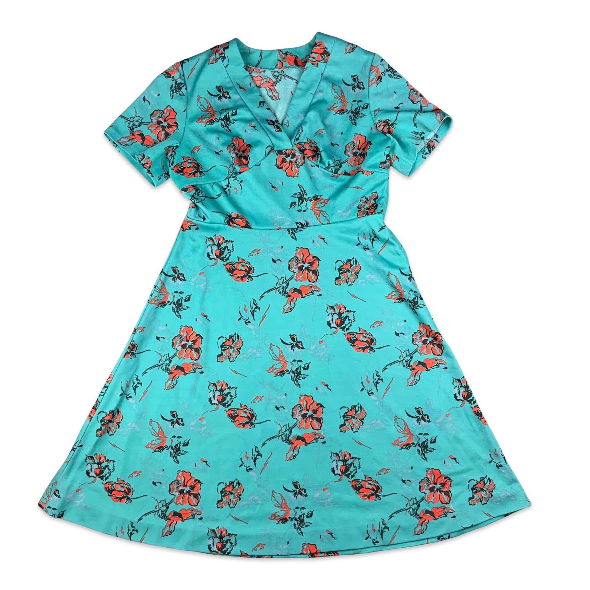 Vintage 70s Teal Orange Floral Print A-Line Dress 16