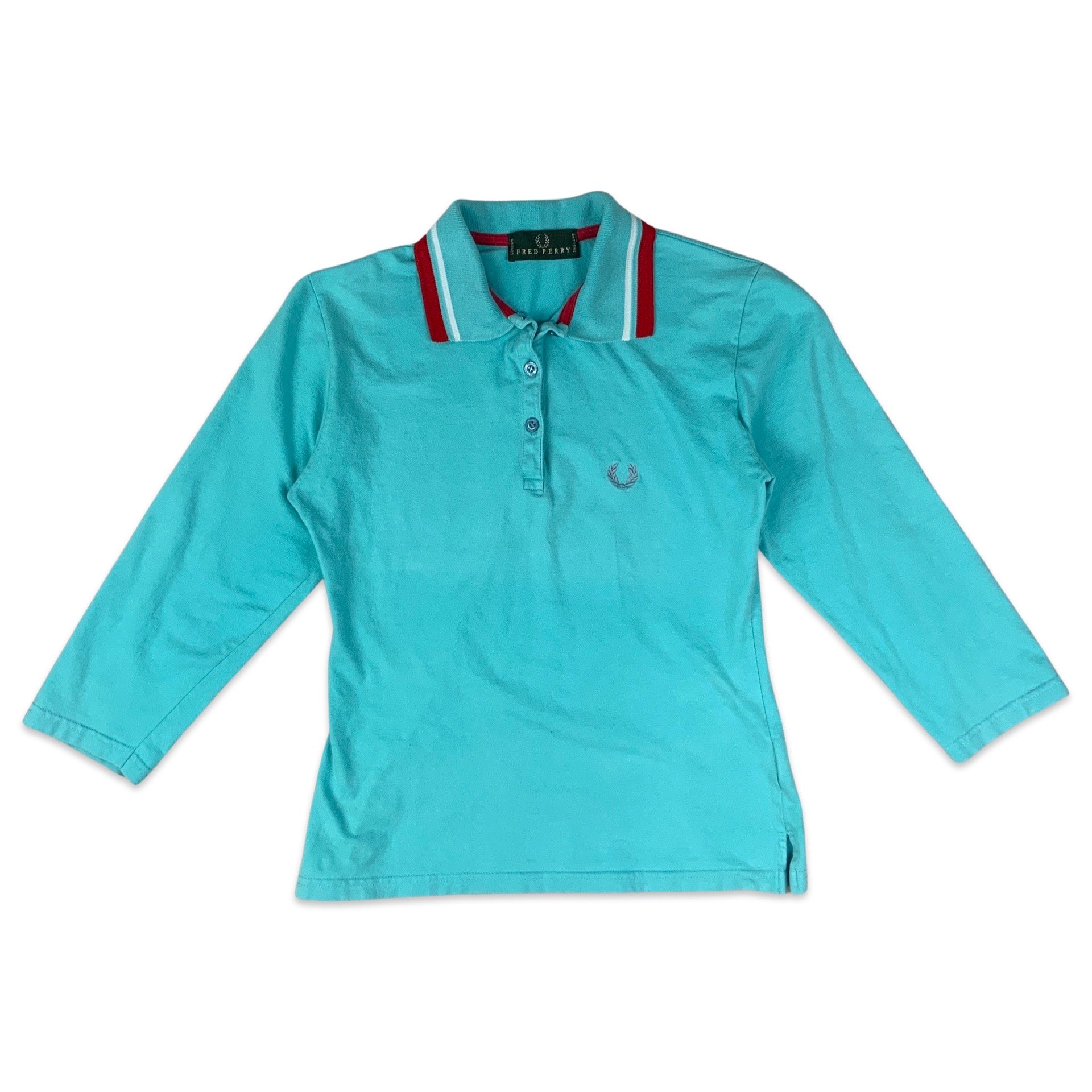 Women’s 90s vintage Fred Perry rugby shirt. Bright blue colour with red and white striped, 3 button up collar. 3/4 sleeves.