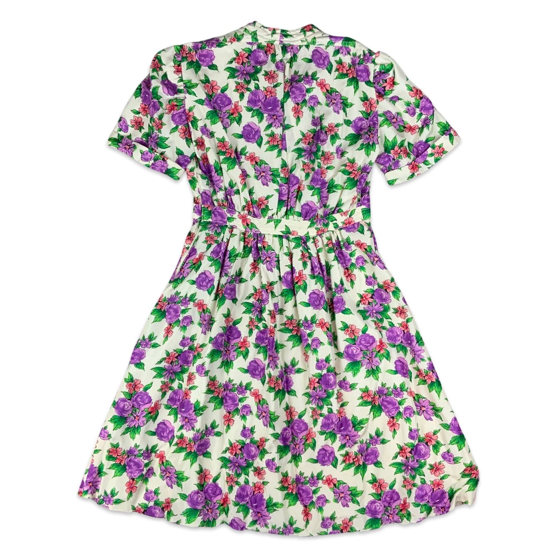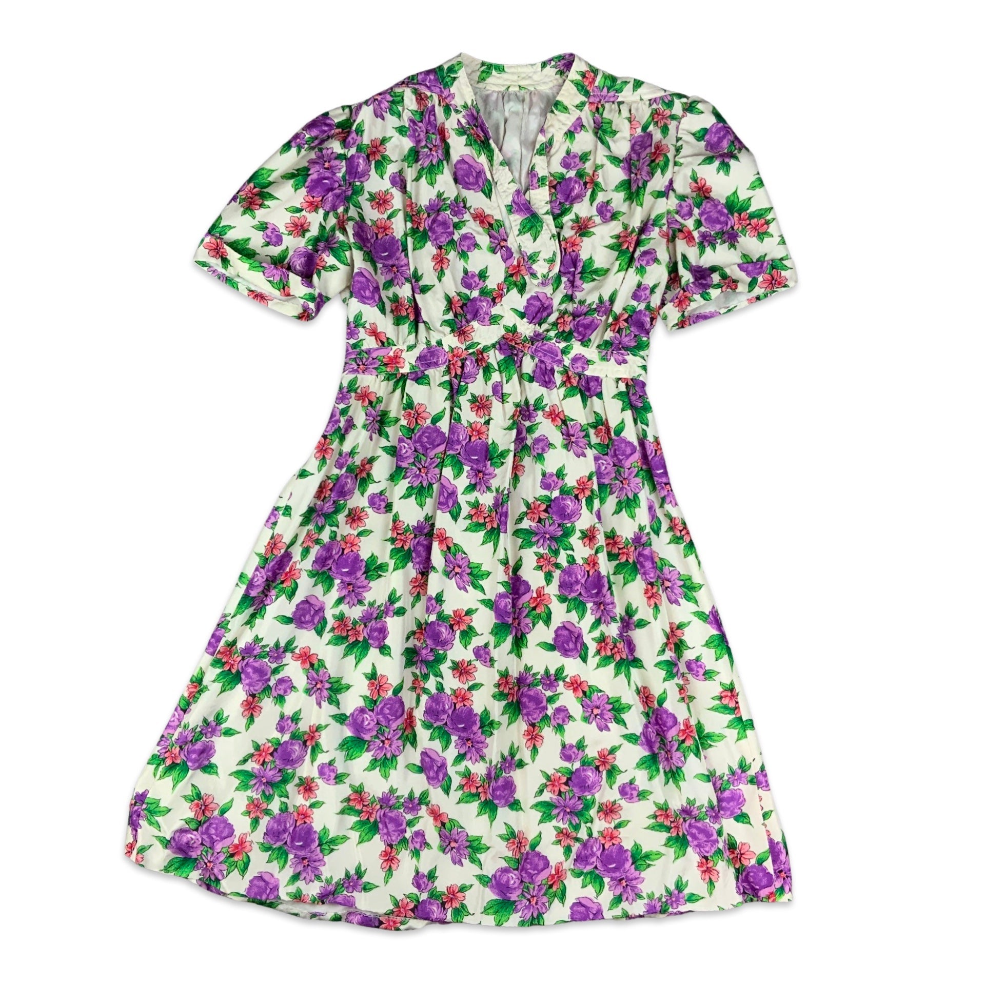 Vintage 70s White Purple Pink and Green Floral Print Dress 10 12