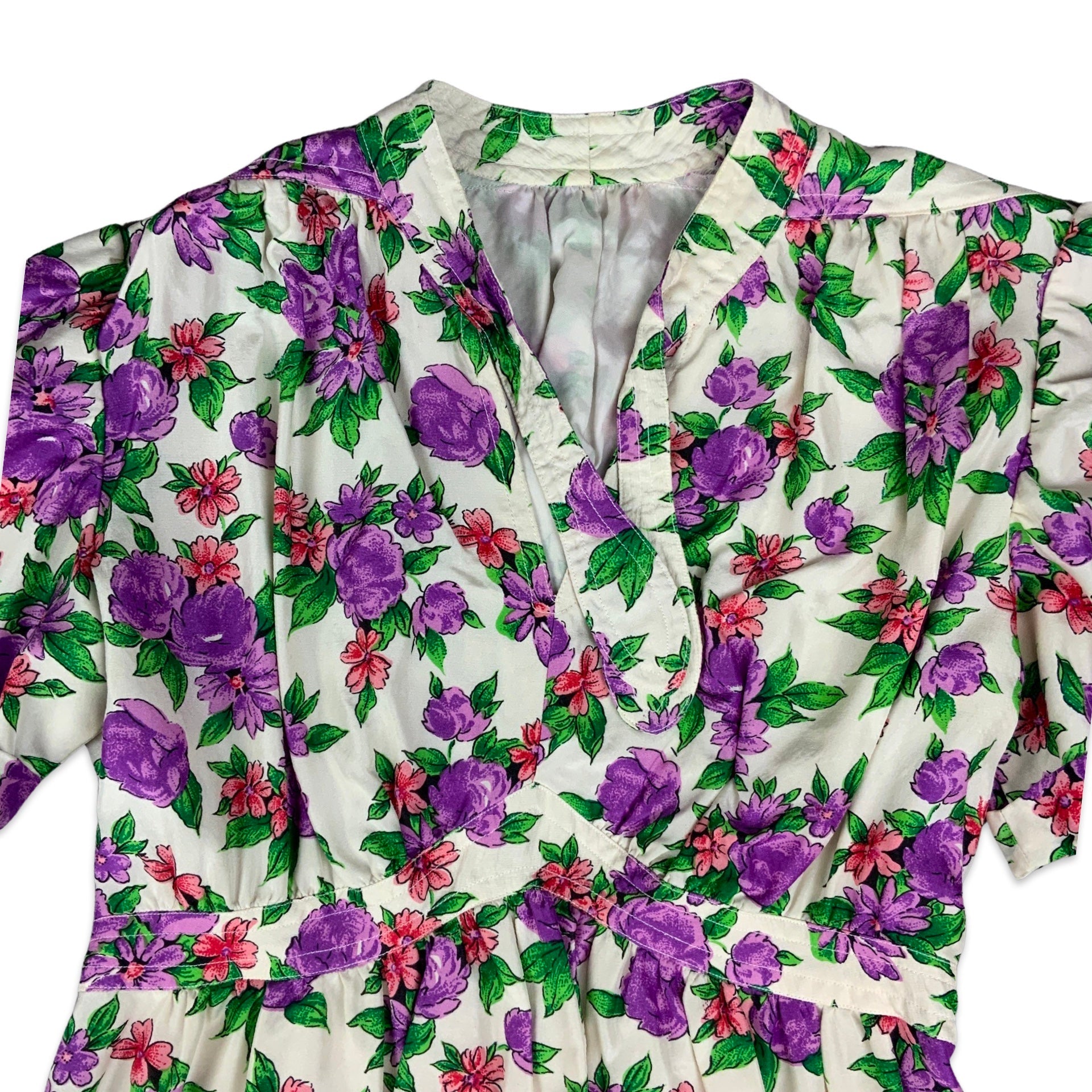 Women’s vintage floaty dress. V neck with collar tie fastening. Loose fit with gathered waistband. White fabric with purple, pink and green floral print. Satin like fabric. Side zip fastening.