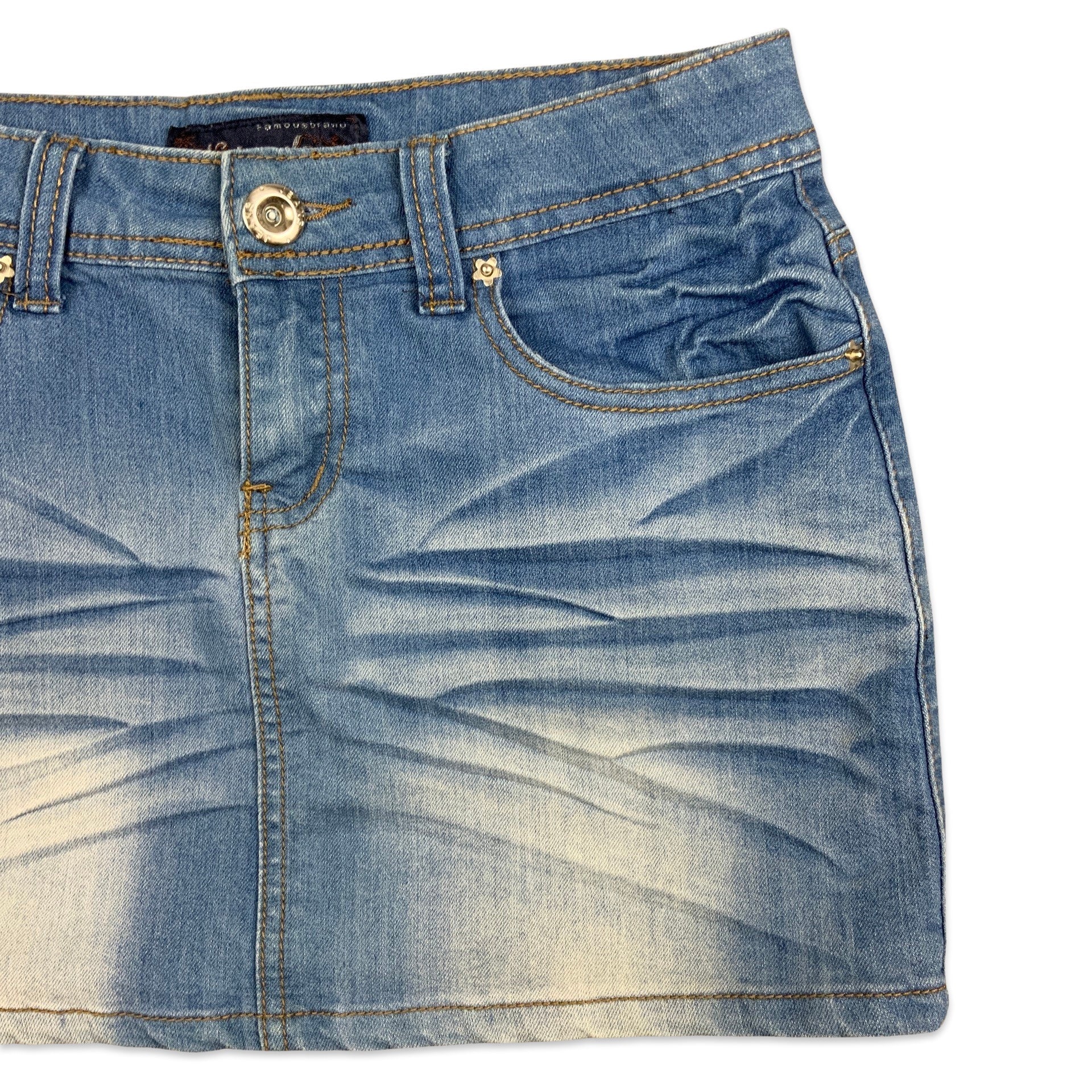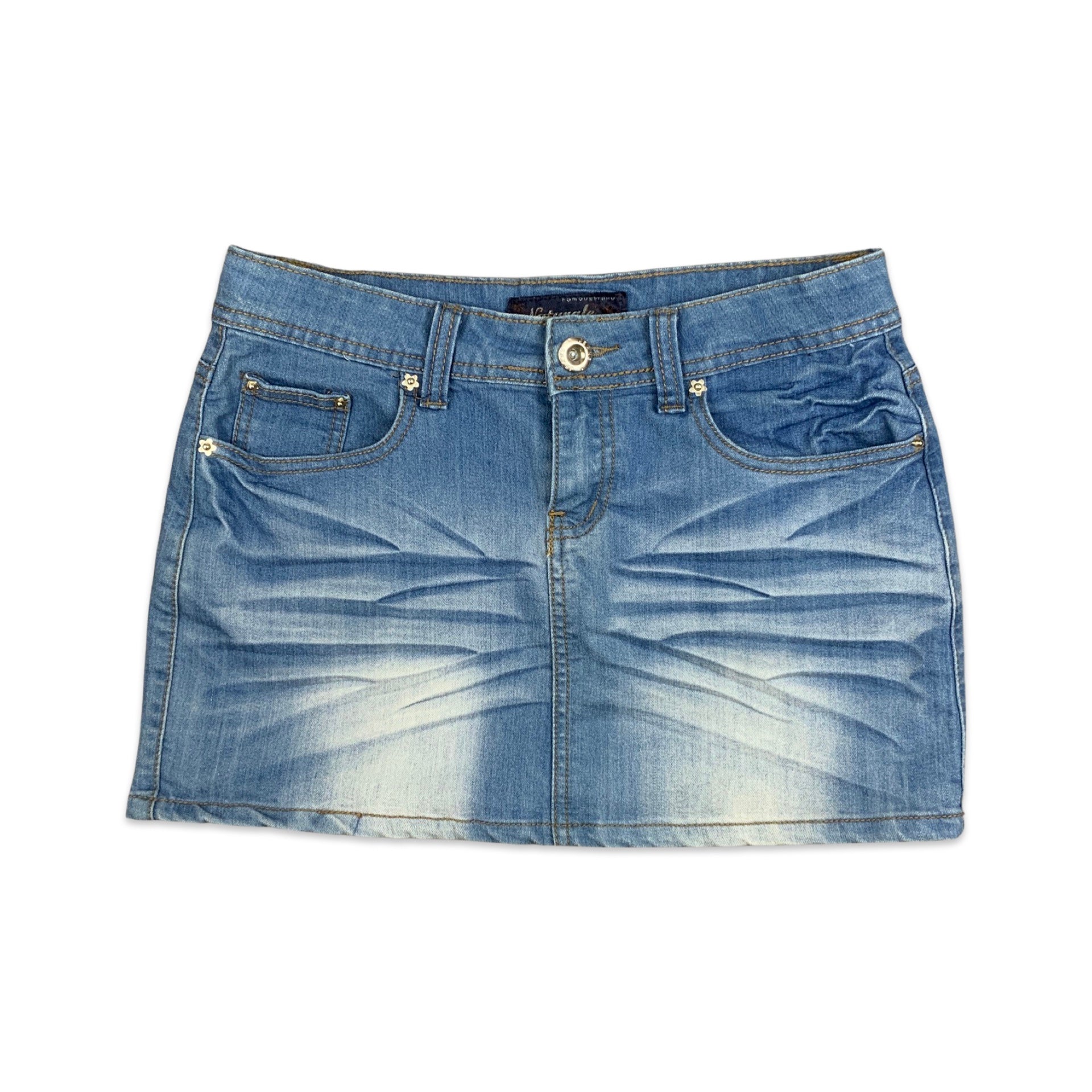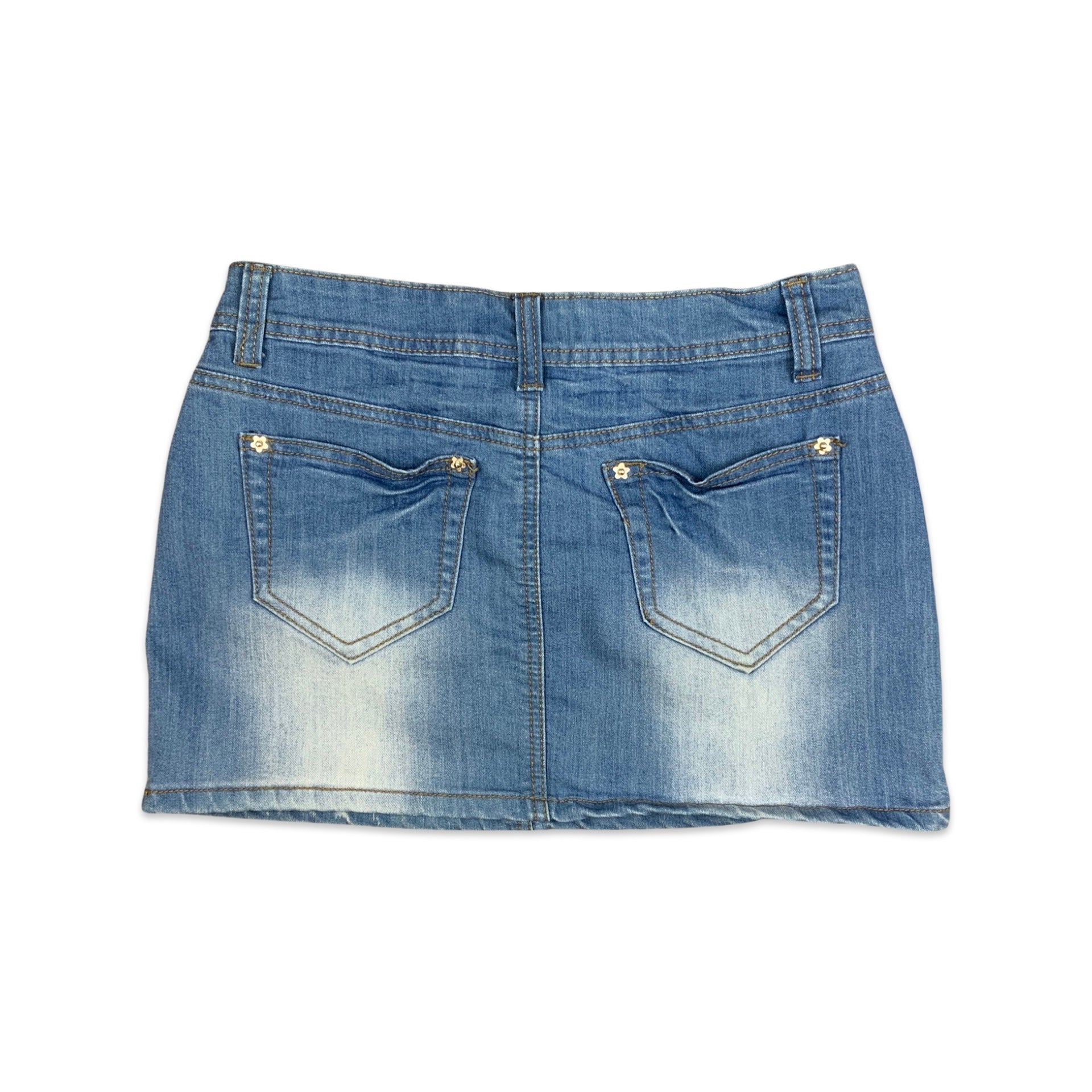 Women’s Y2K mini skirt. Mustard top stitching with silver flower rivets. Front button and zip fastening. White whiskering detail.