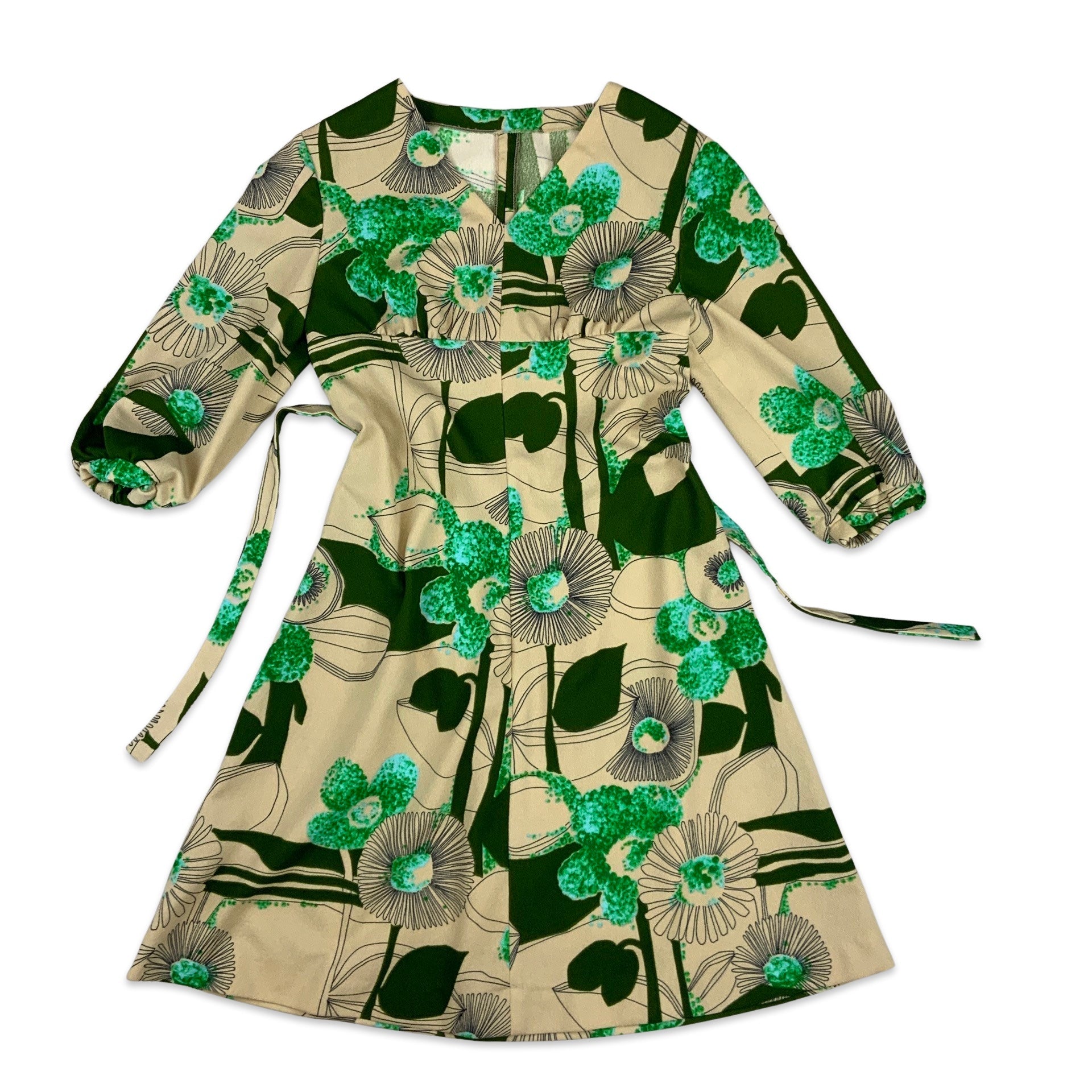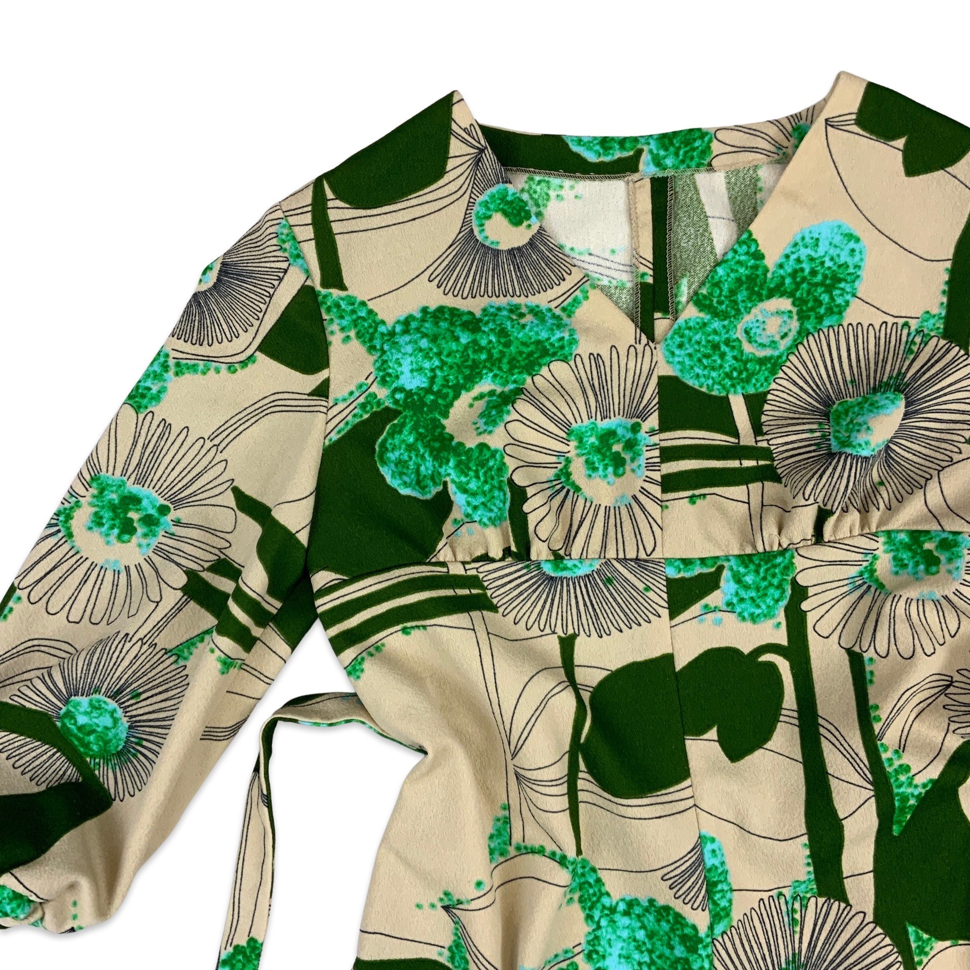 Vintage 1970s midi beige dress with large graphic floral print in green and blue. V neck, empire line, balloon half sleeves, tie waist. A perfect special occasion dress