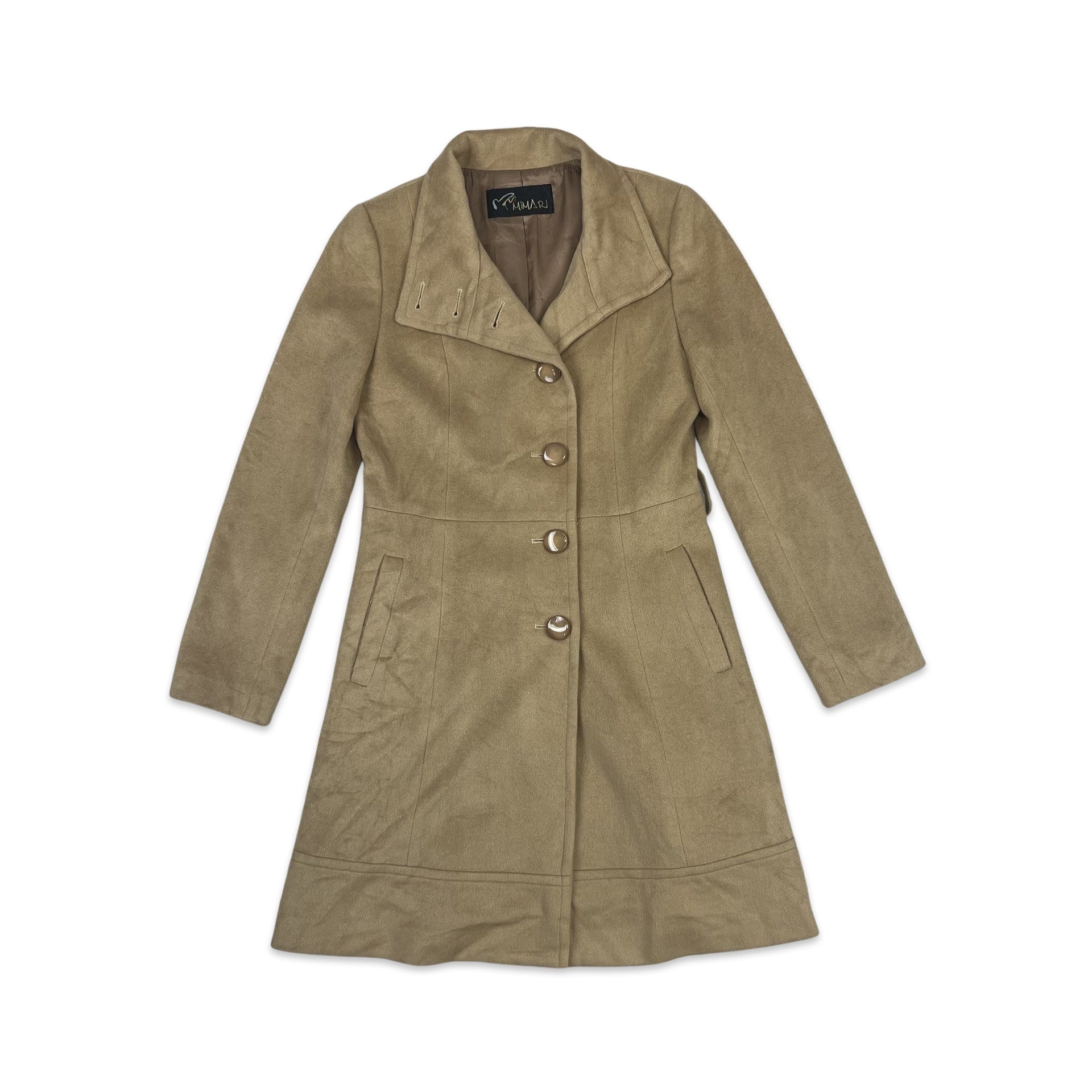 Vintage 90s midi wool coat in light brown. Button fastening, side pockets, fully lined, no belt.