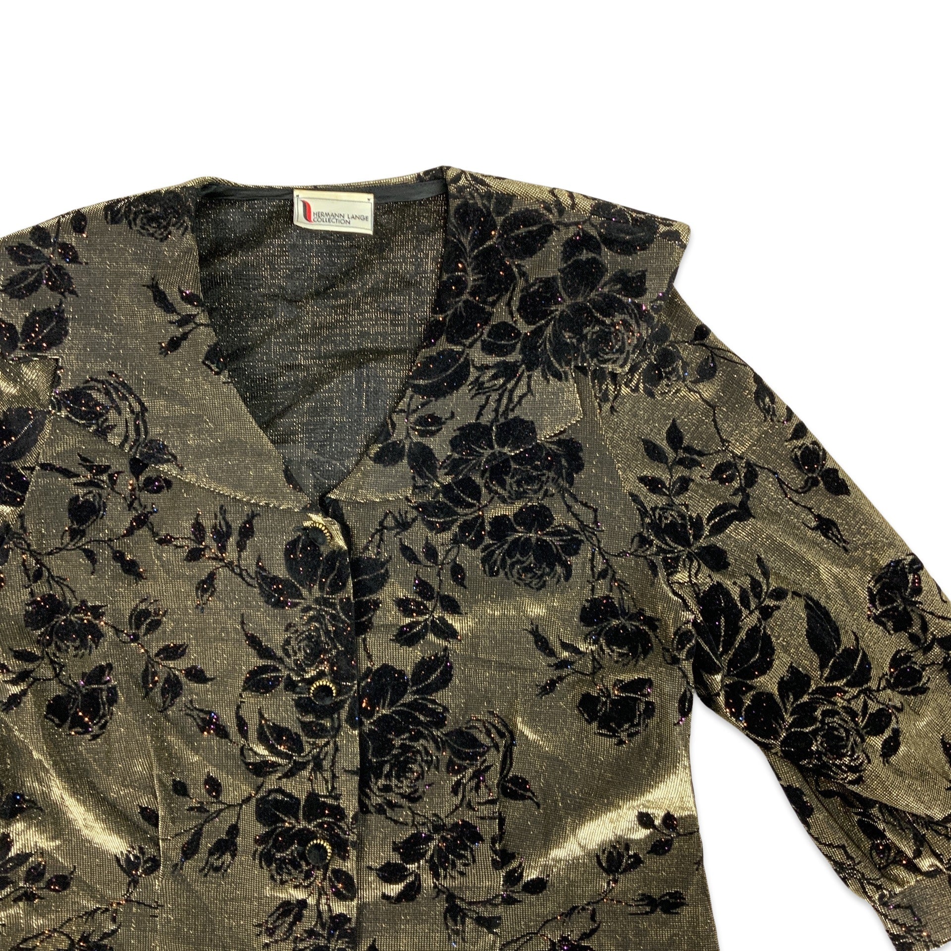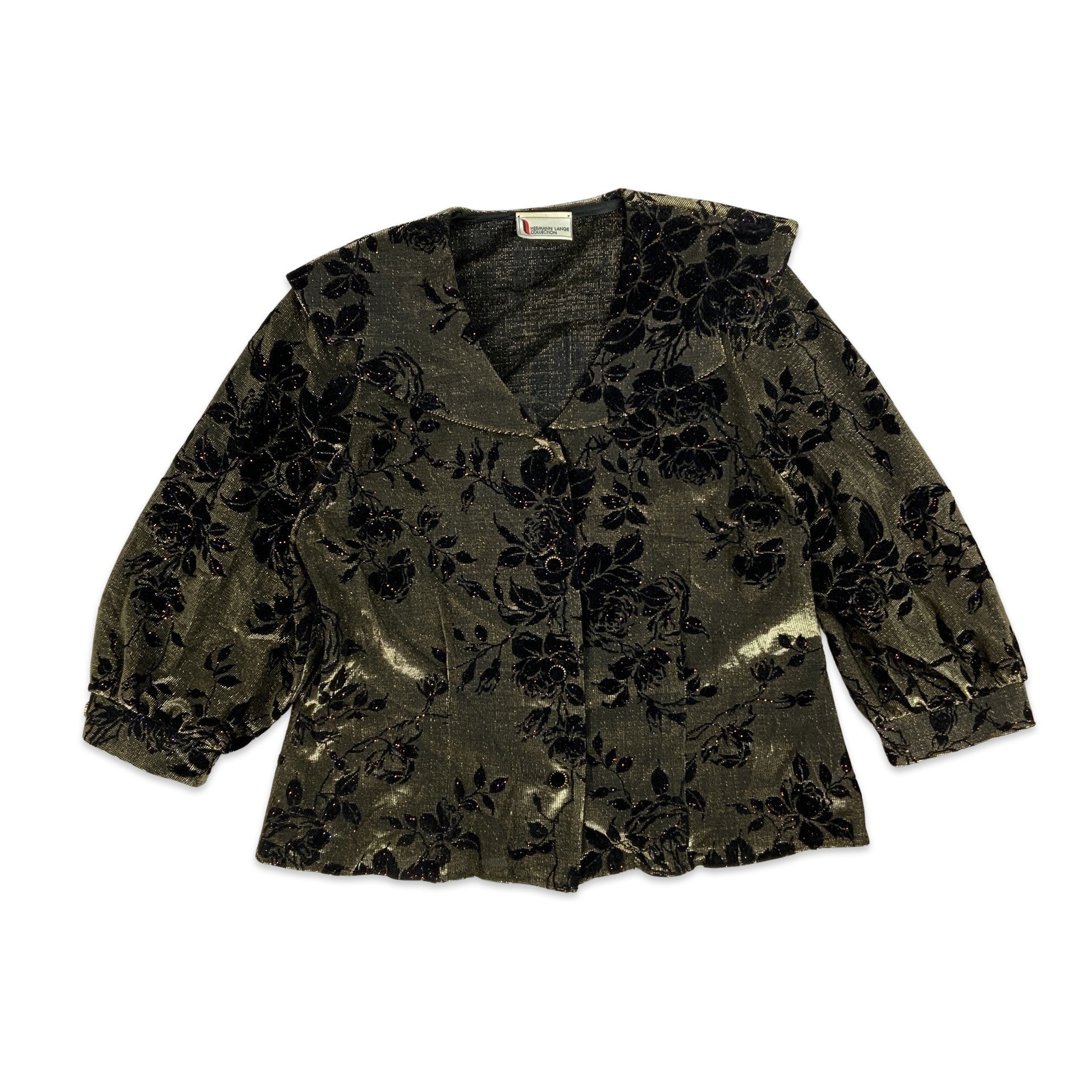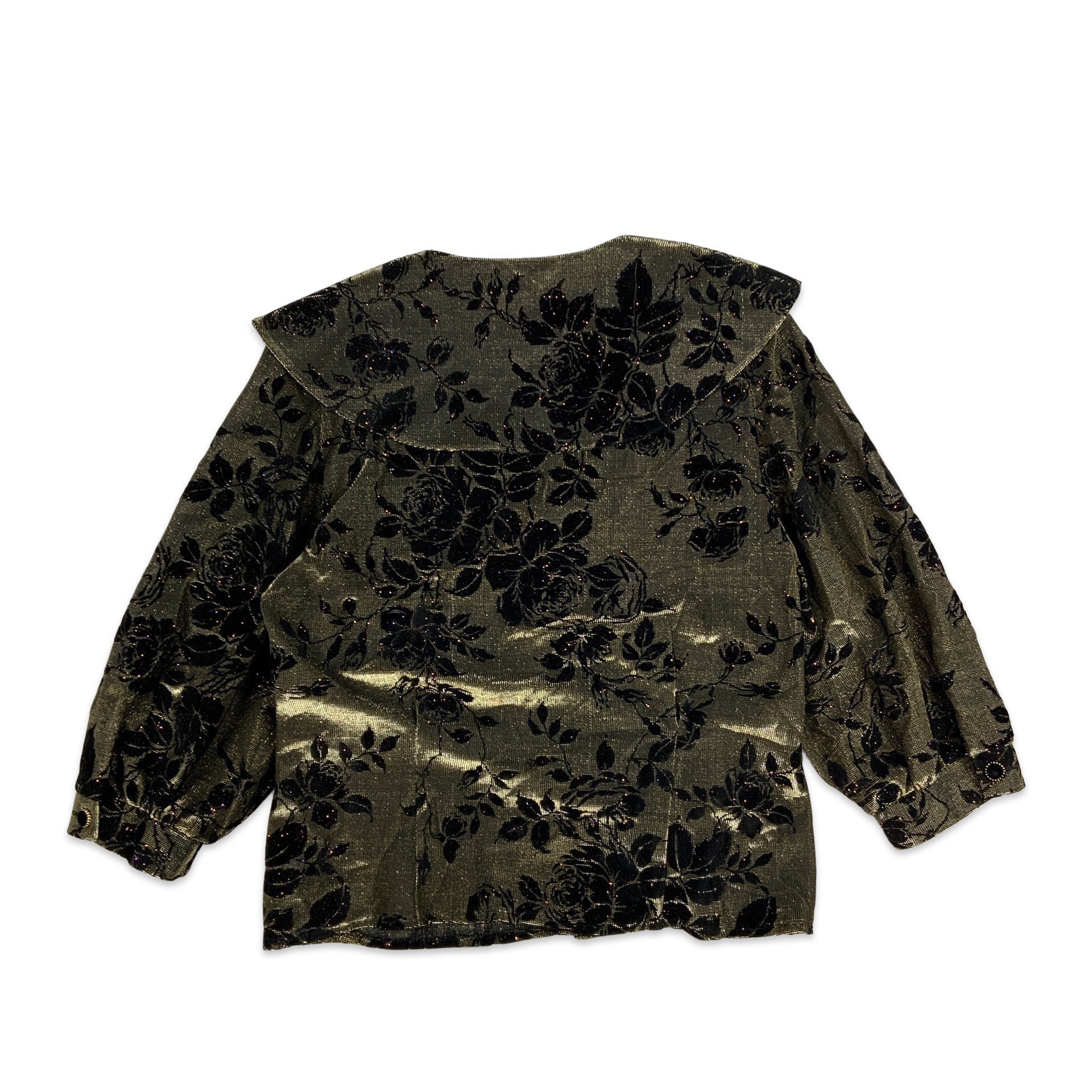 Vintage 80s style lurex brocade blouse. Peter pan collar. Balloon sleeves. Velvet floral pattern.
