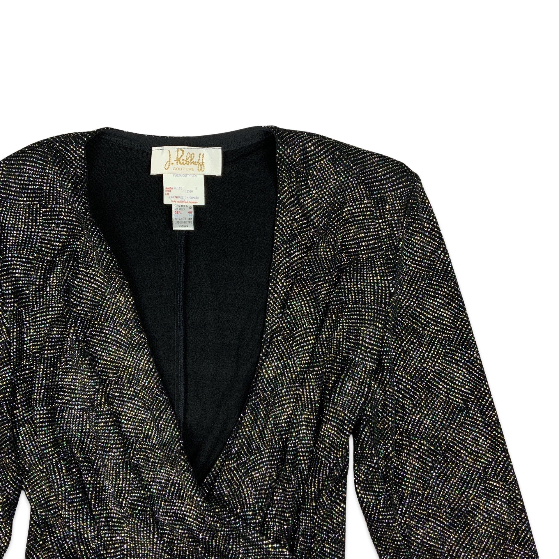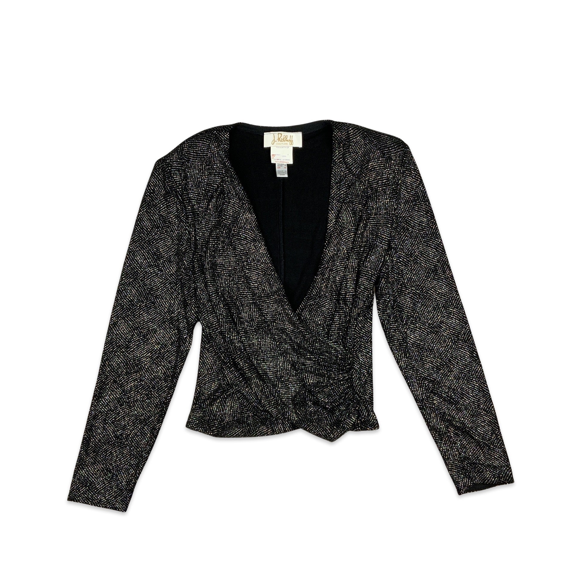 Vintage 80s black, silver and purple lurex blouse with deep v neckline. Ruched wrap detail. Shoulder pads