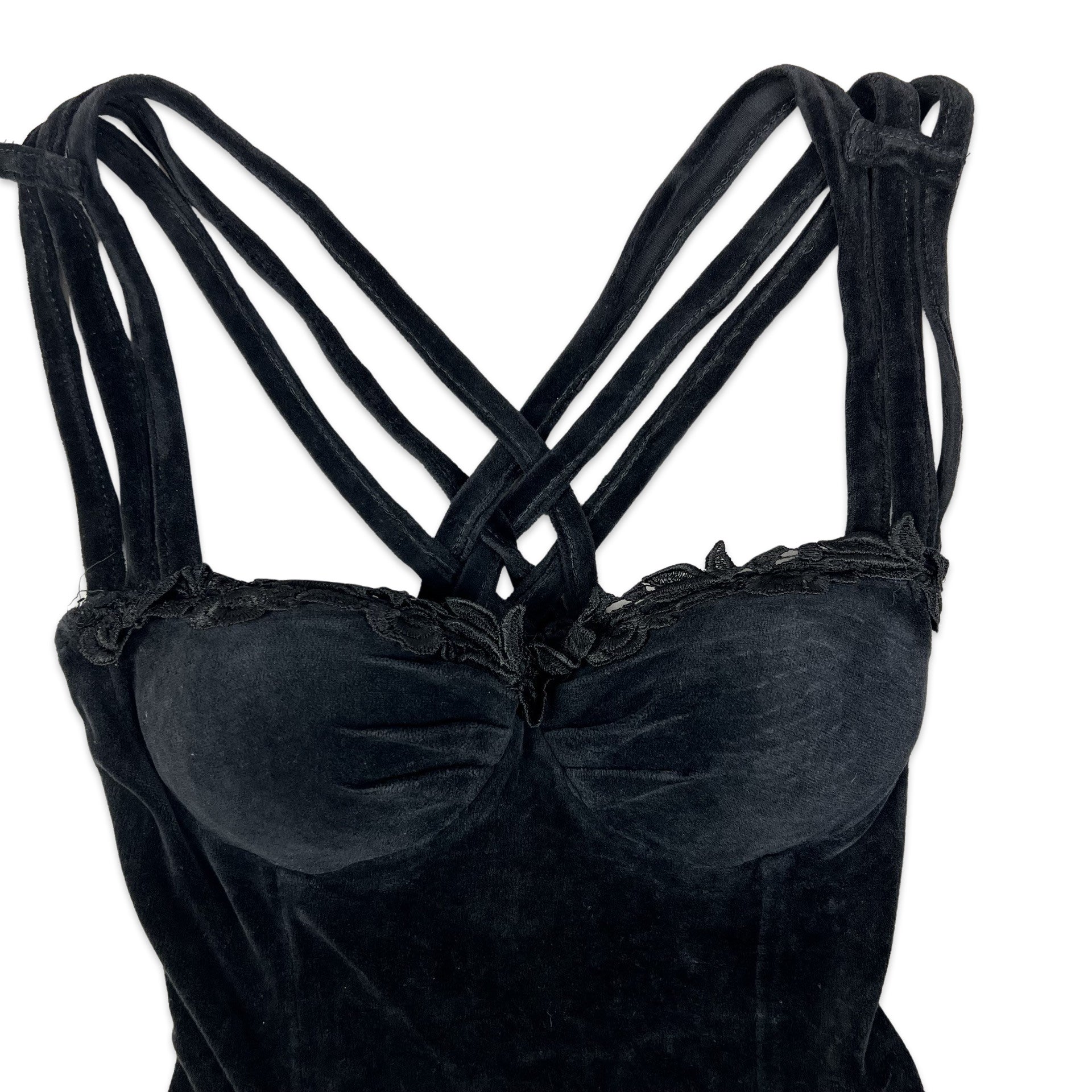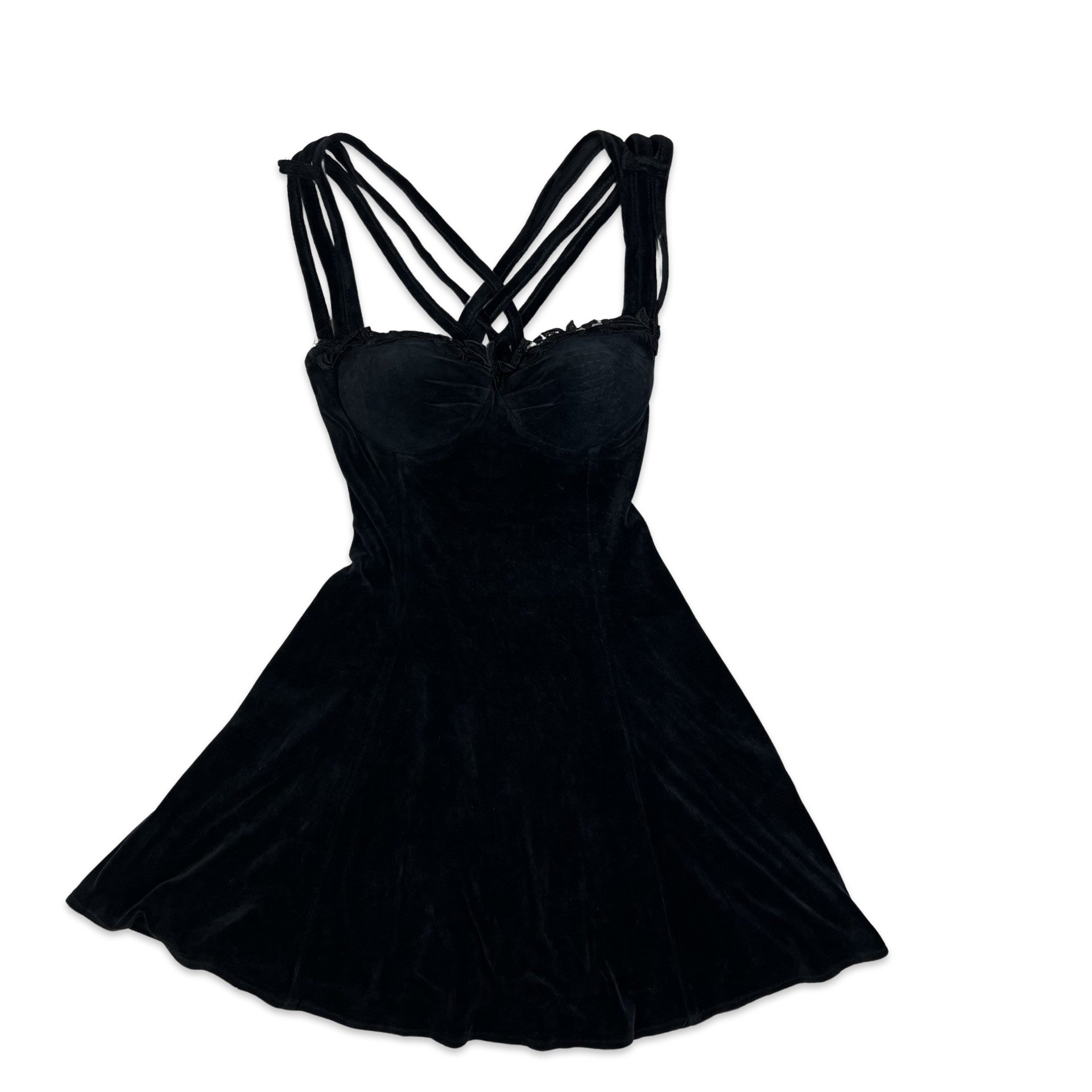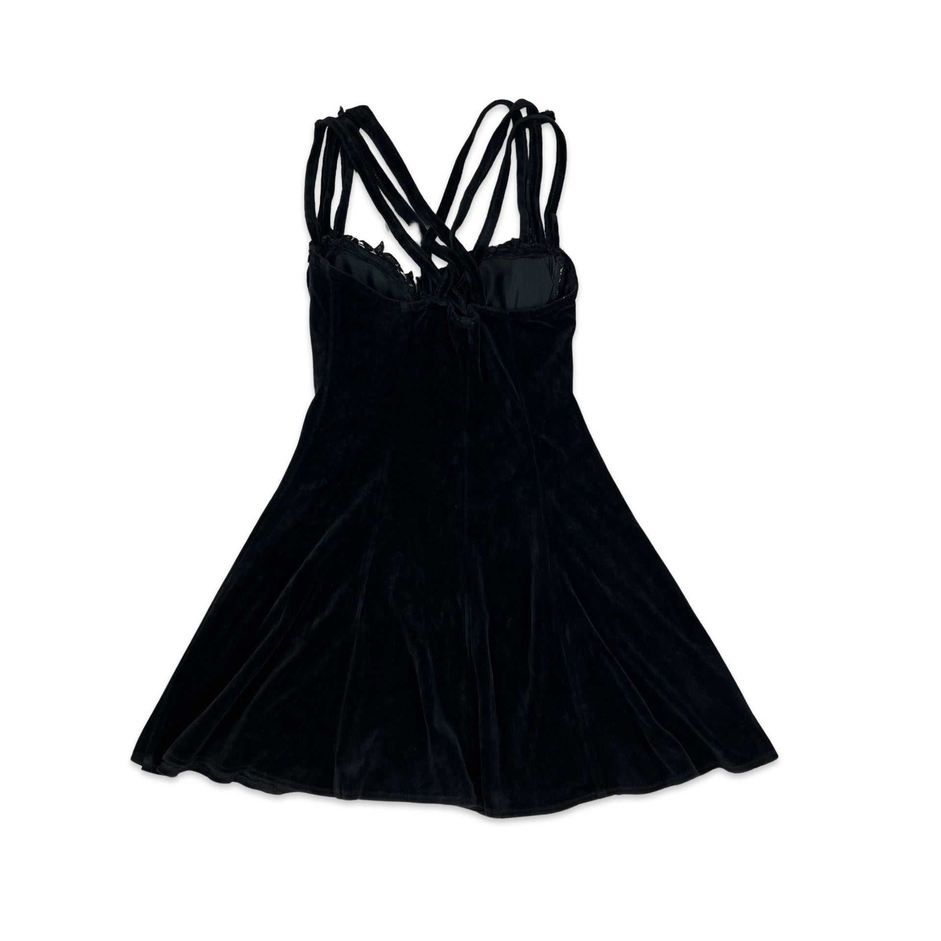 Vintage 90s style velvet skater dress with lattice cross back straps. Built in bust cups with lace detail trim.