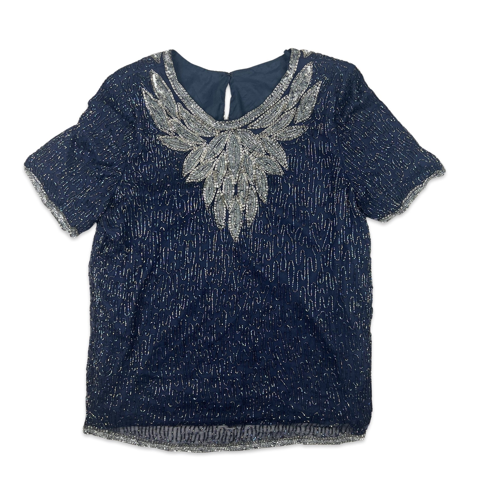 Vintage 80s Oversized Boxy Sequin Blouse Blue Silver 12 14