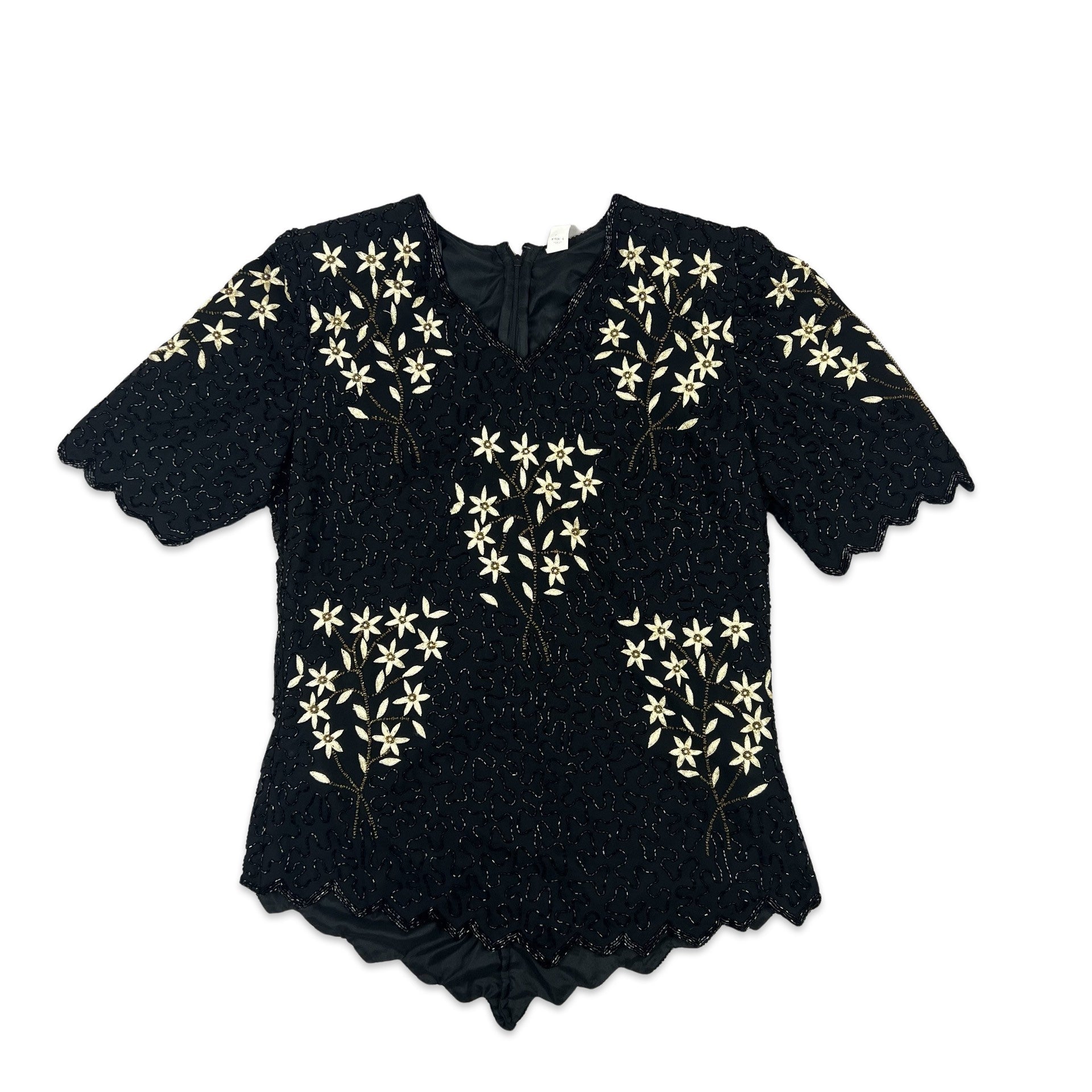 Vintage 80s style v neck sequin blouse. Floral sequin pattern. Hanky hem. Shoulder pads. Zip up back.