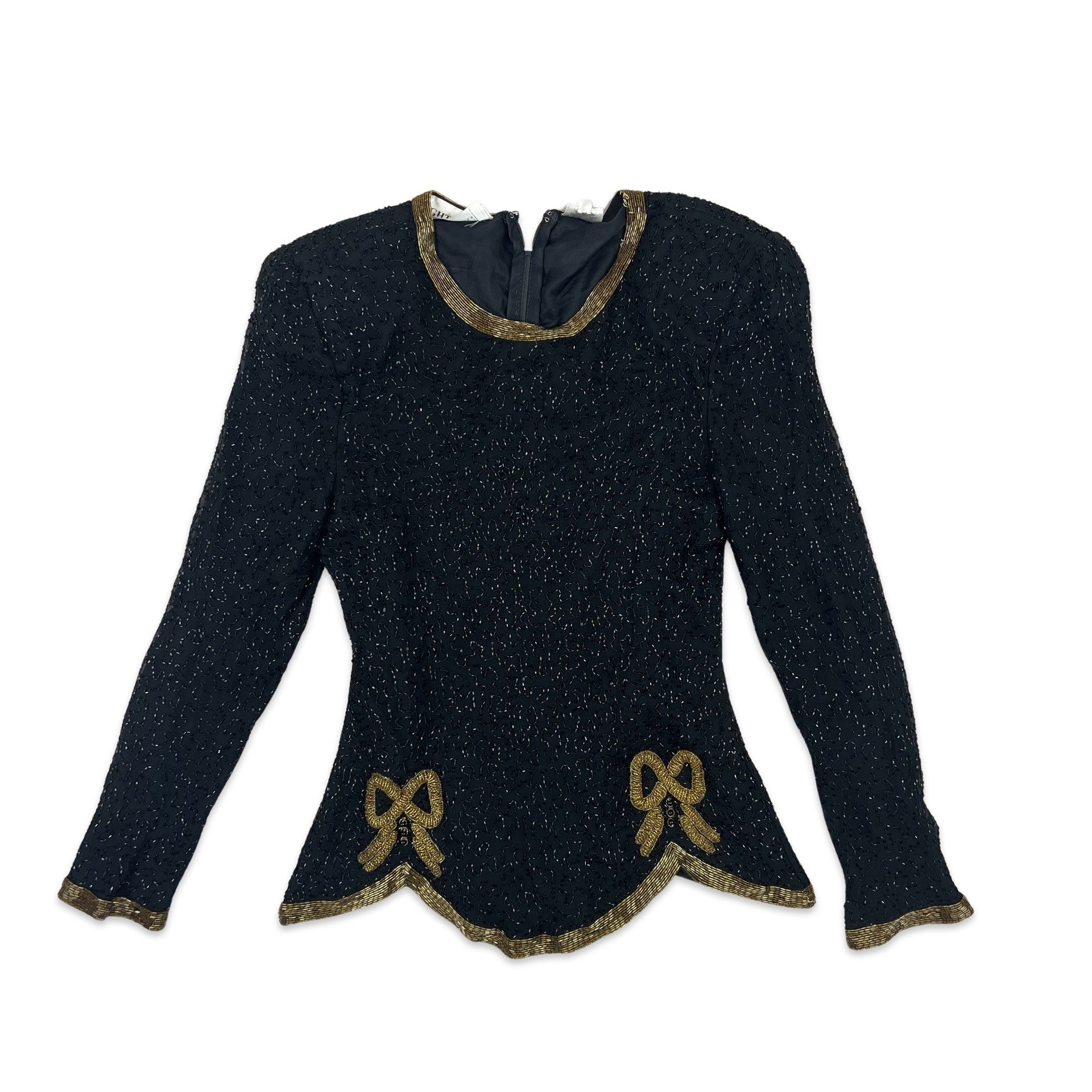Vintage 80s Night Vogue Sequin Blouse Black Gold 4 6