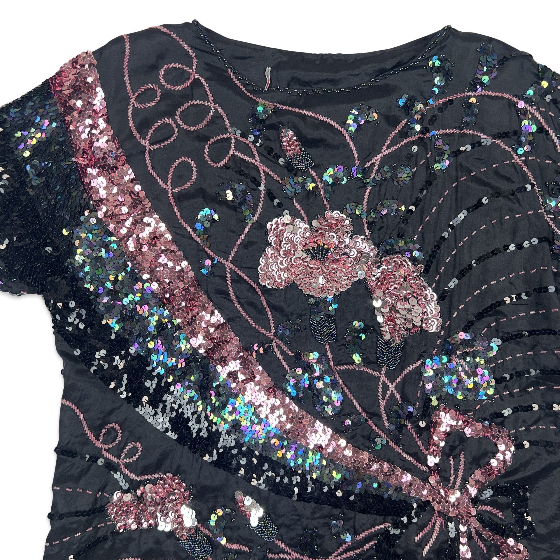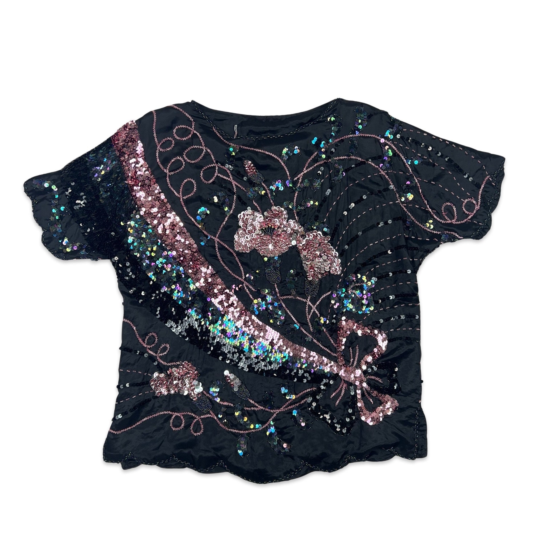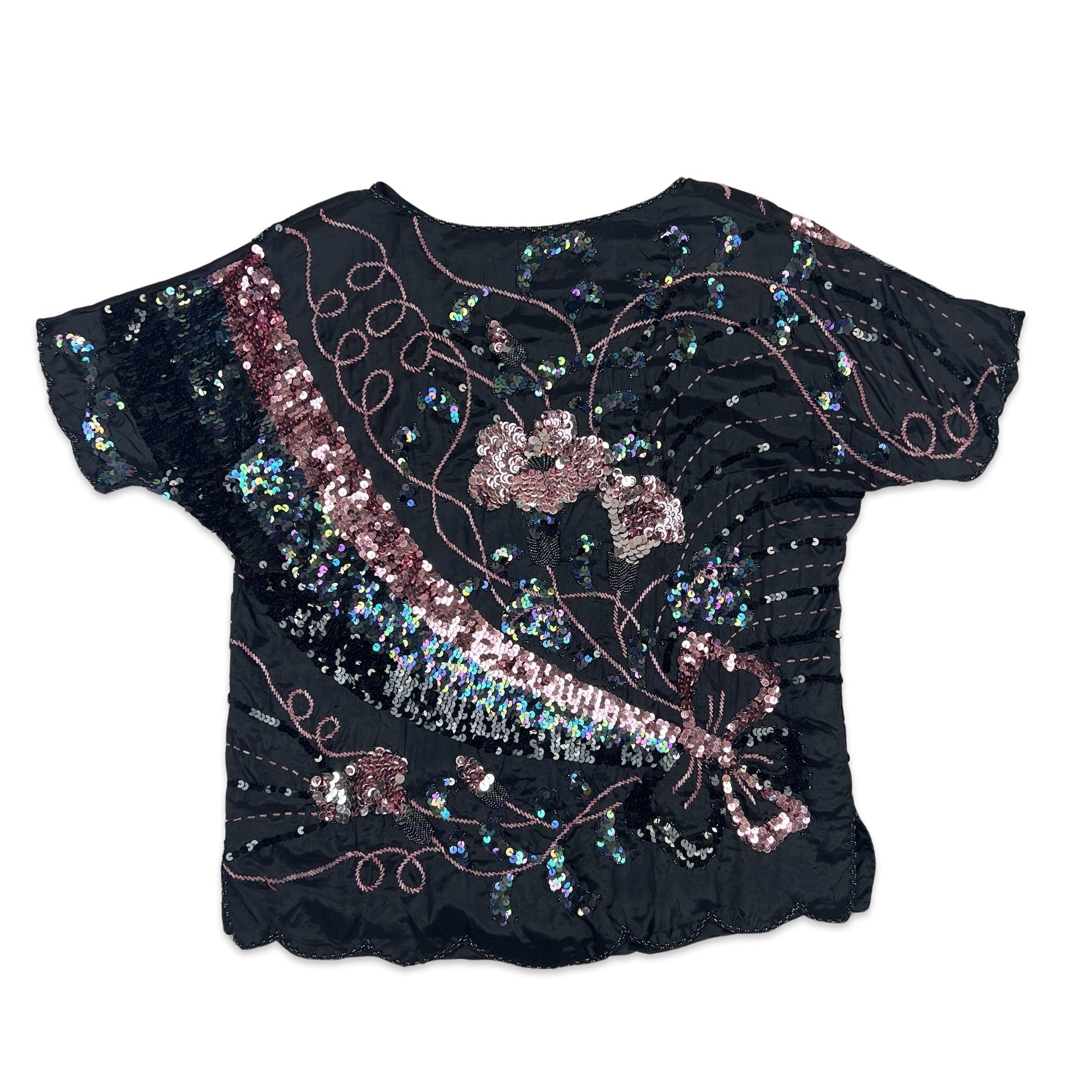 Vintage 80s style boxy oversized sequin blouse. Flower swirl pattern. Scallop hem. Bat wing style.