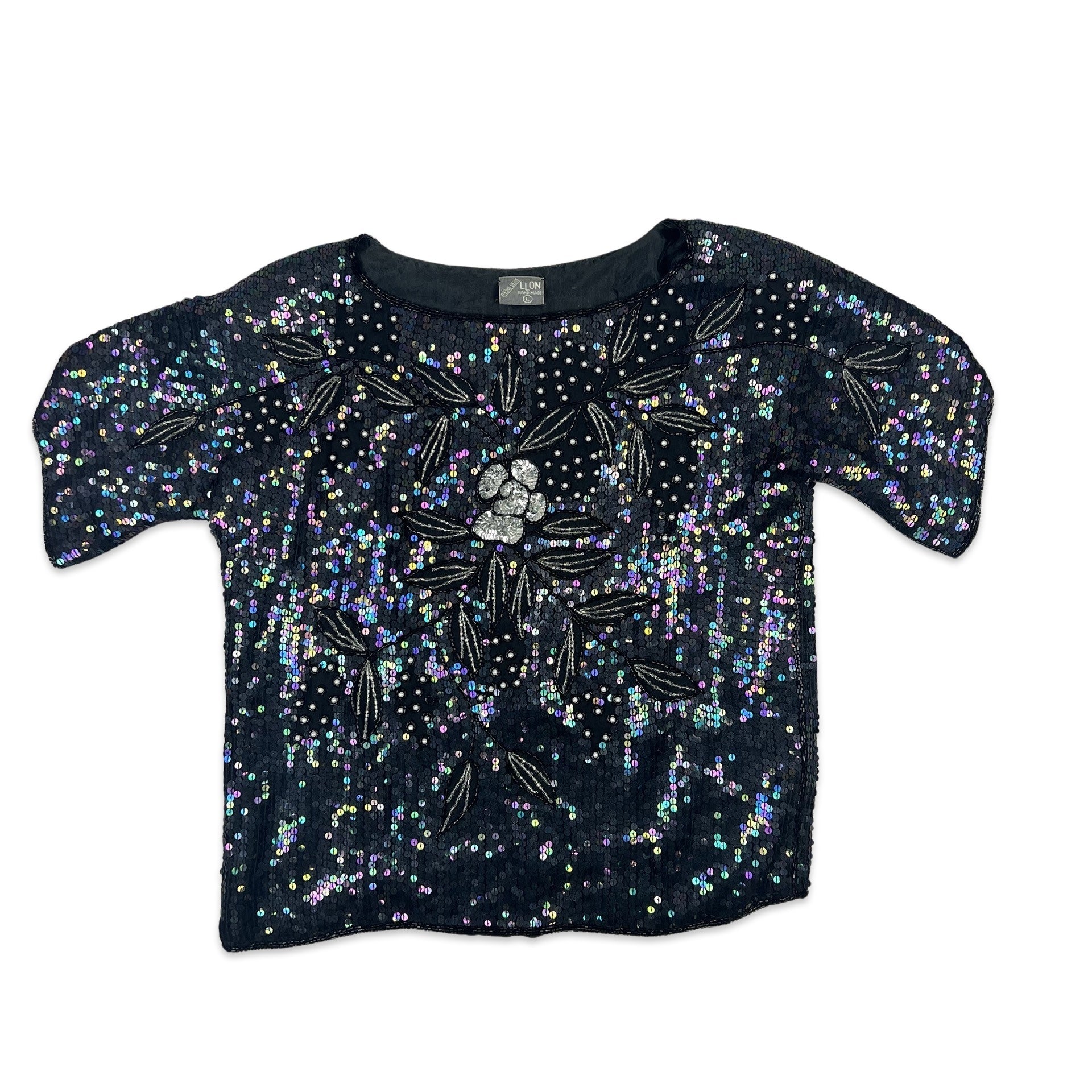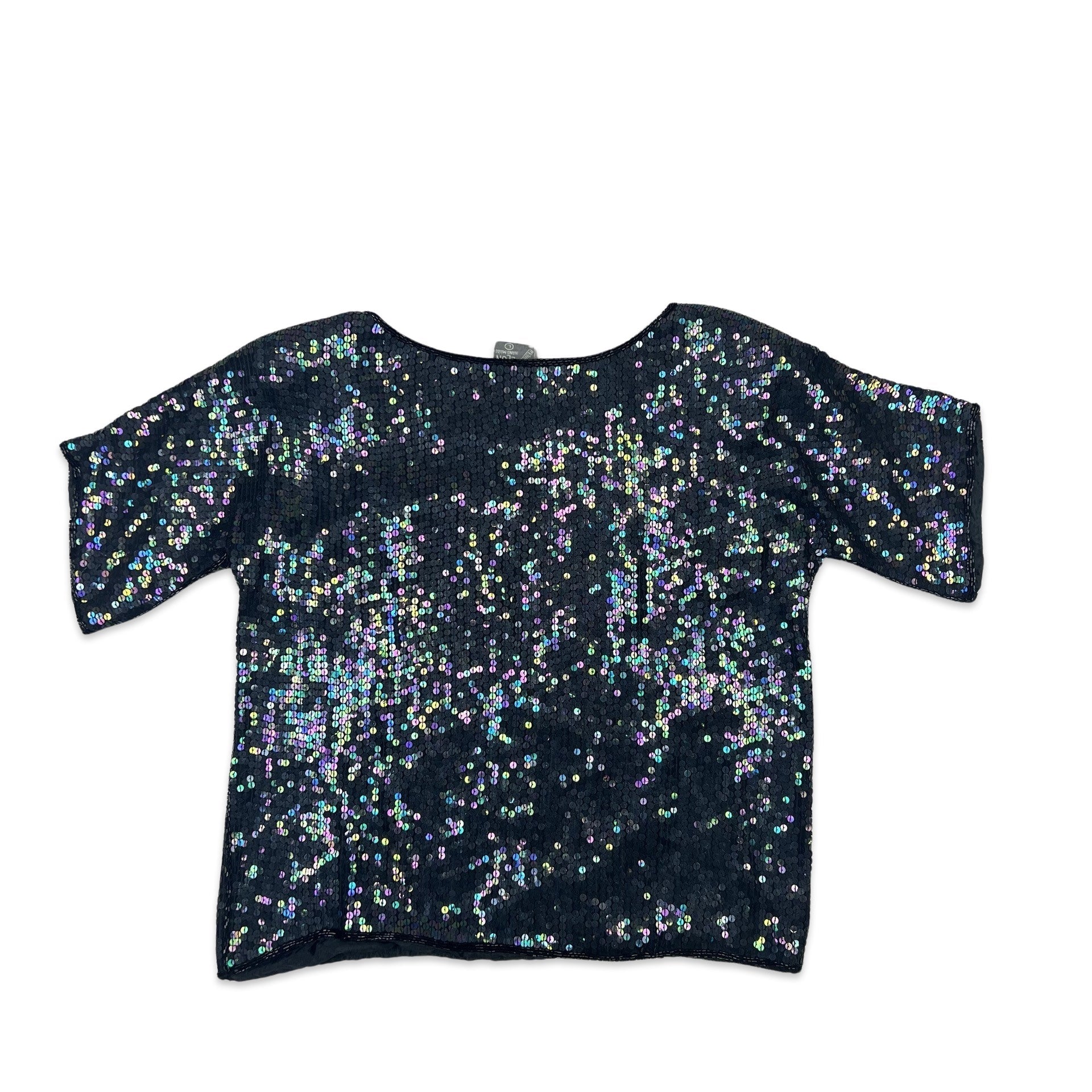 Vintage 80s Boxy Oversized Sequin Blouse Black Silver 14
