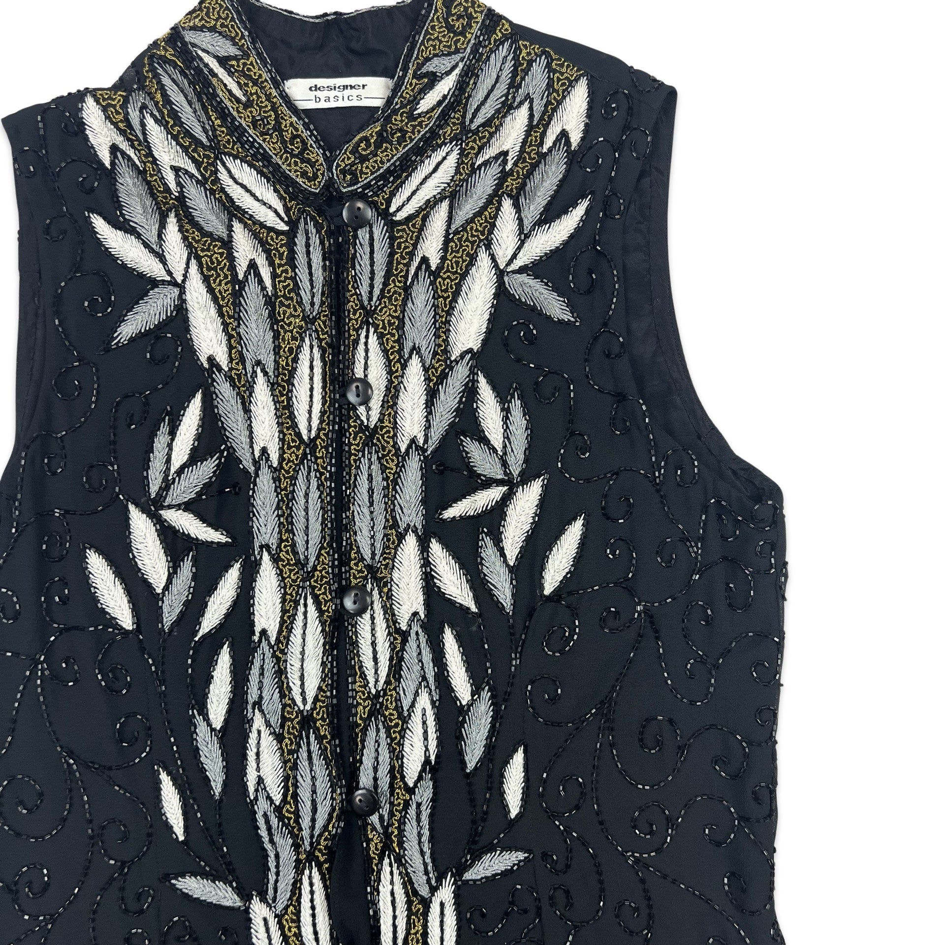 Vintage sequin blouse. High neckline. Button up. Swirl leaf pattern. Embroidered detailing.