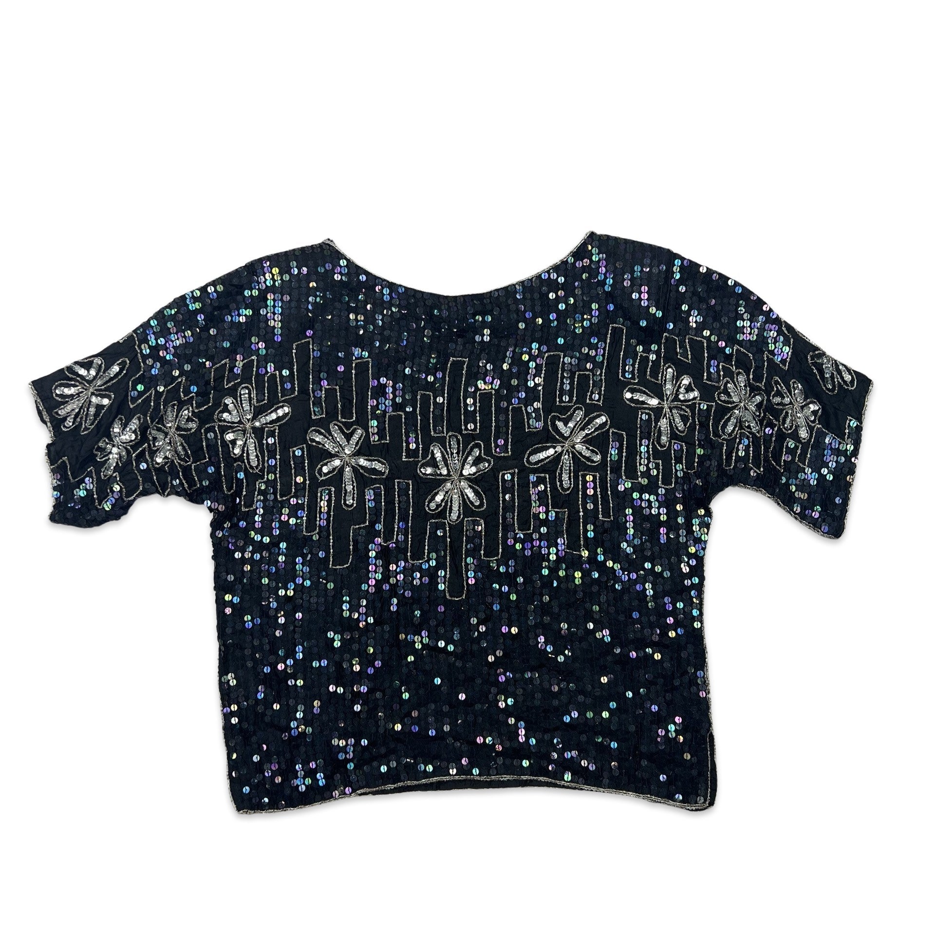 Vintage 80s style scoop neck boxy oversized sequin blouse. Flower sequin pattern. Batwing. Shoulder pads. Size splits