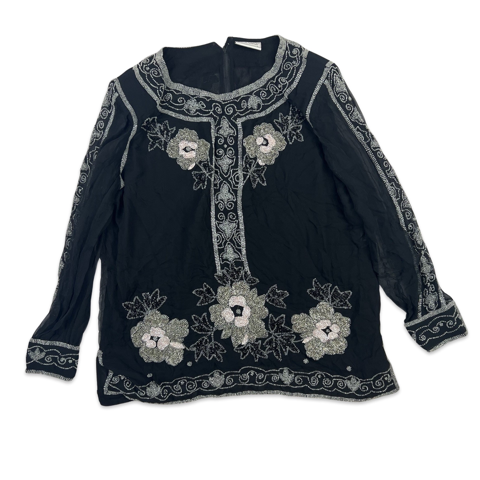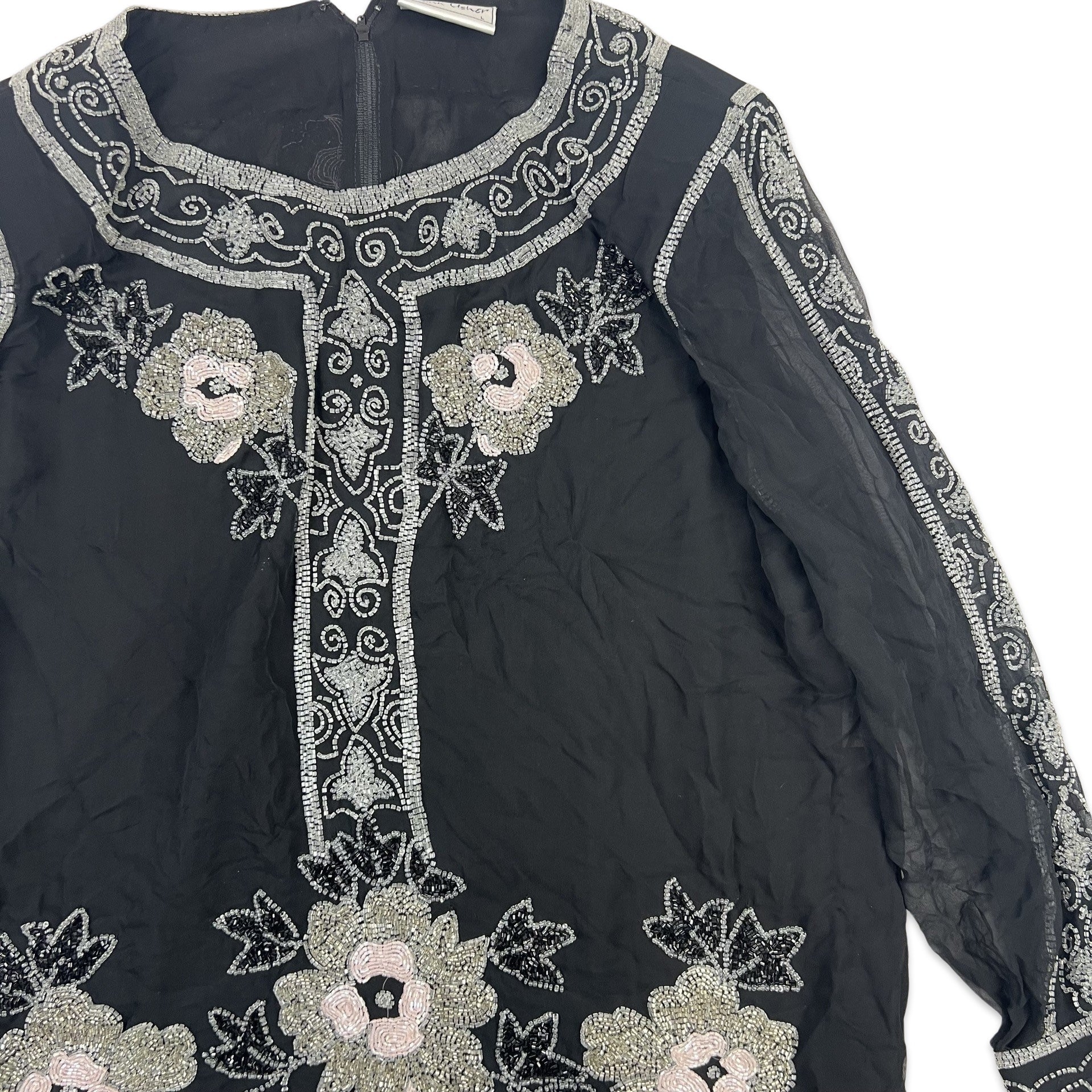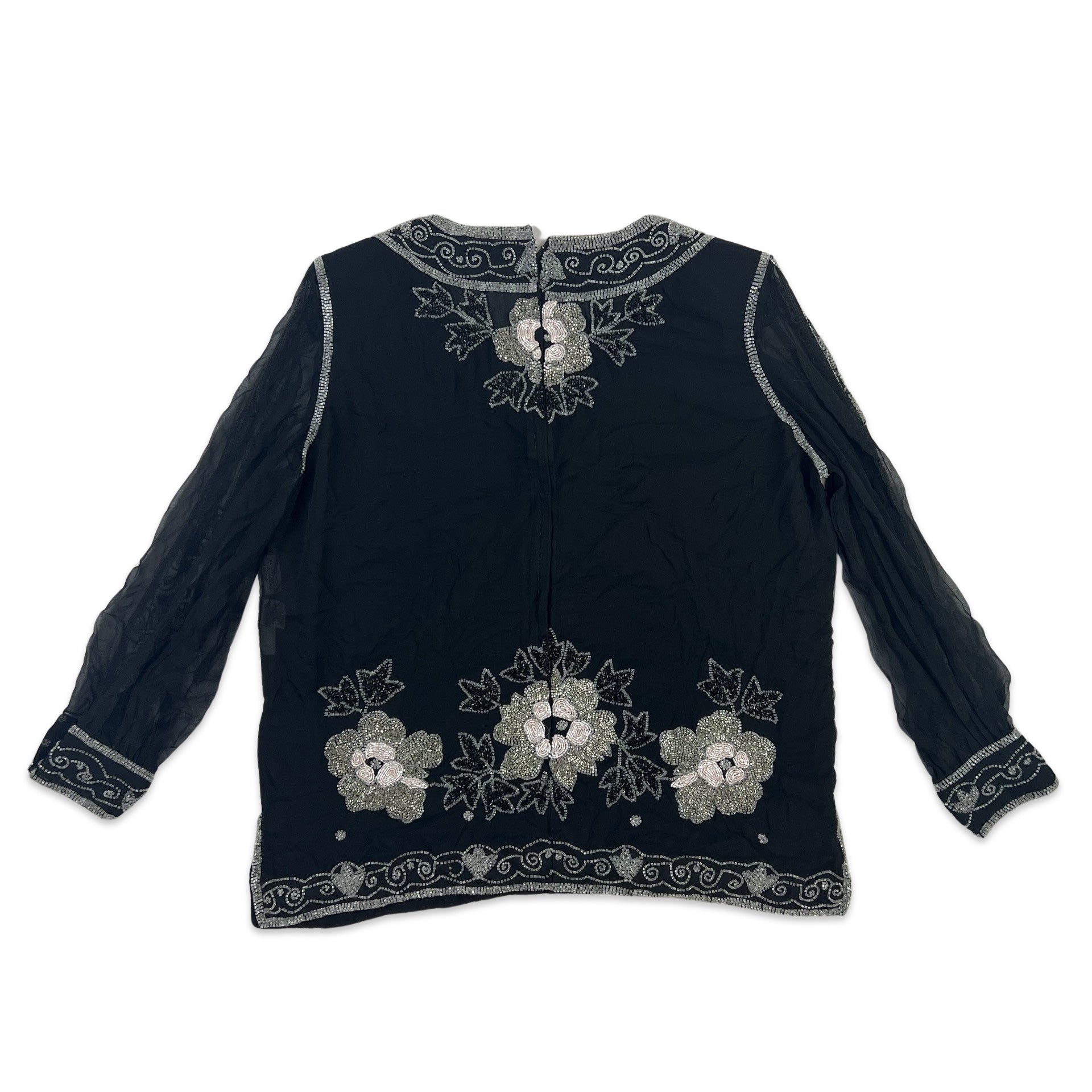 Vintage 80s style long sleeve semi sheer sequin blouse. Flower sequin pattern. Zip up back. Side splits
