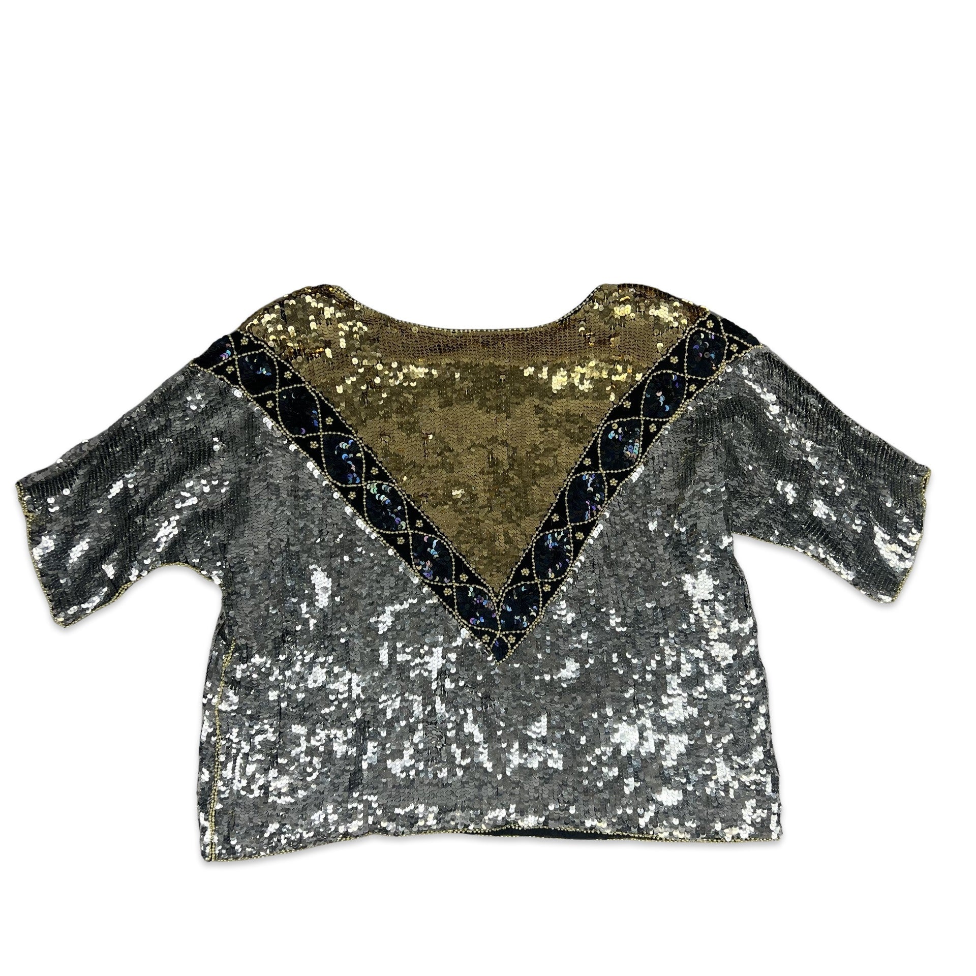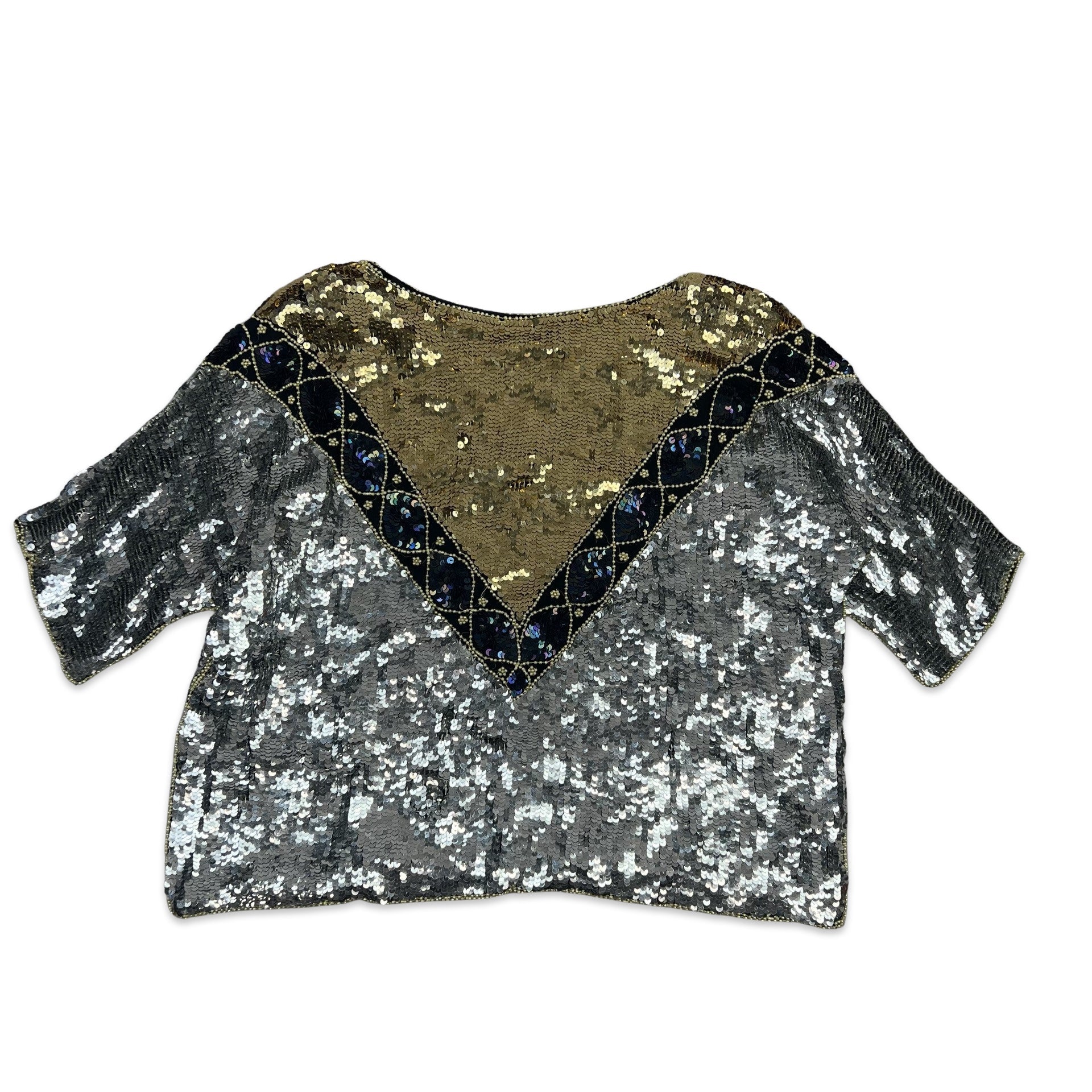 Vintage 80s Boxy Oversized Sequin Blouse Silver Gold Black 16