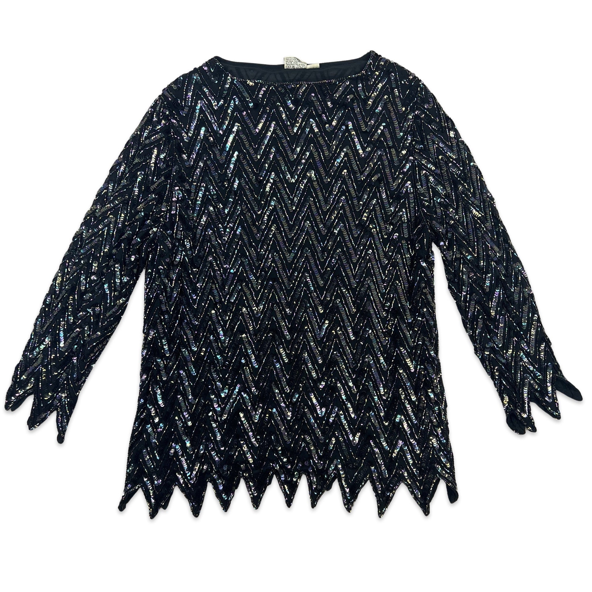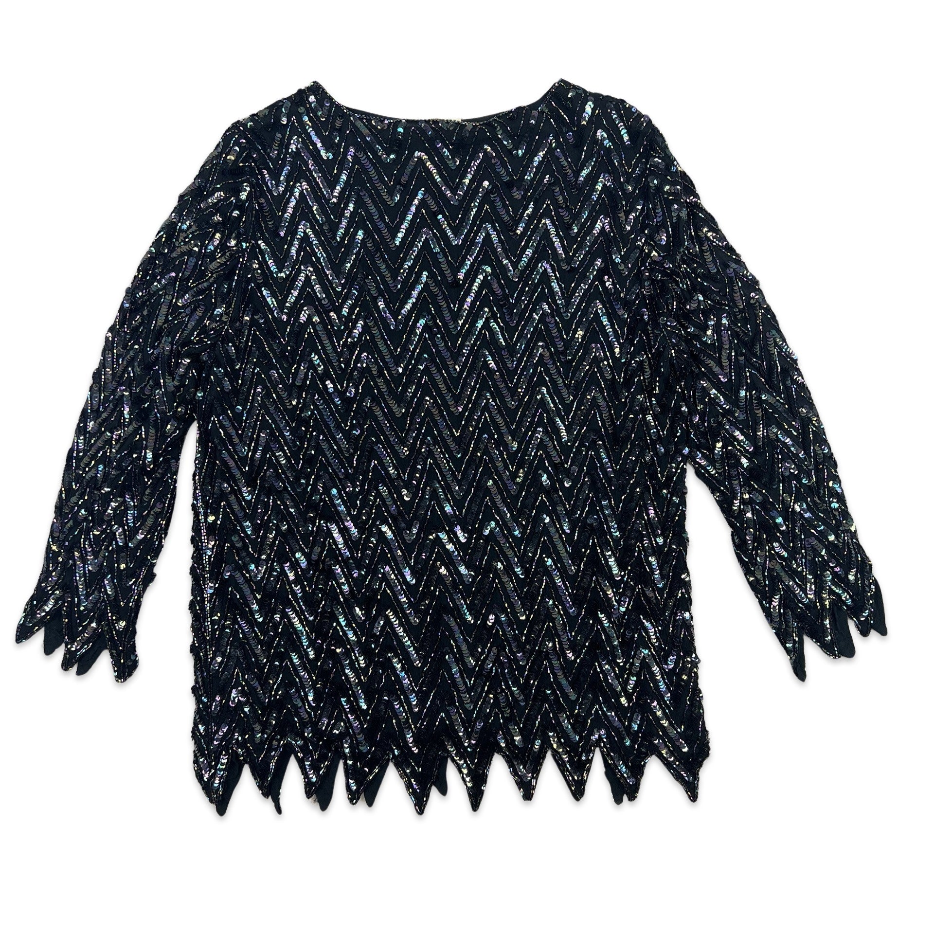 Vintage Chevron Sequin Semi Sheer Blouse Black Purple 12 14