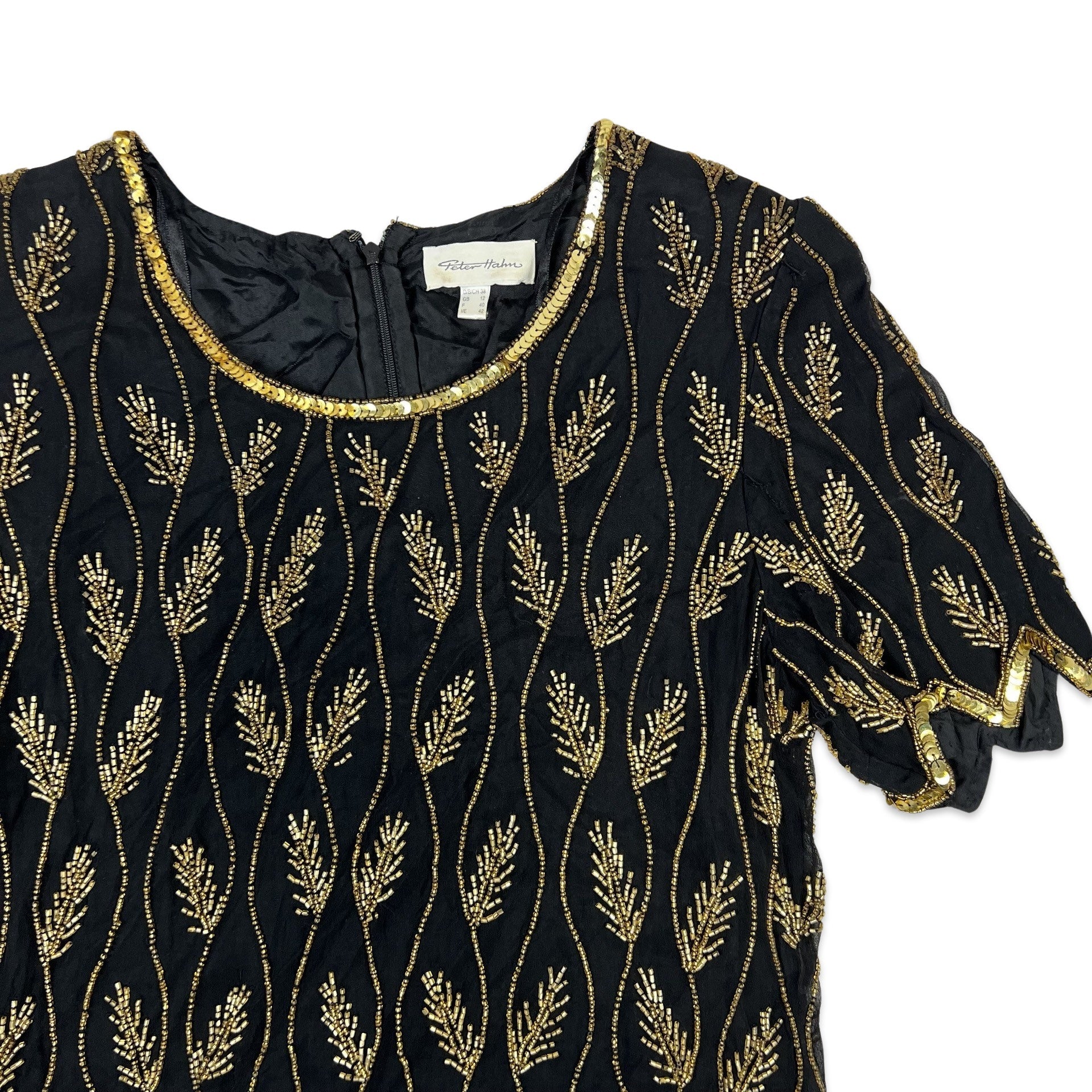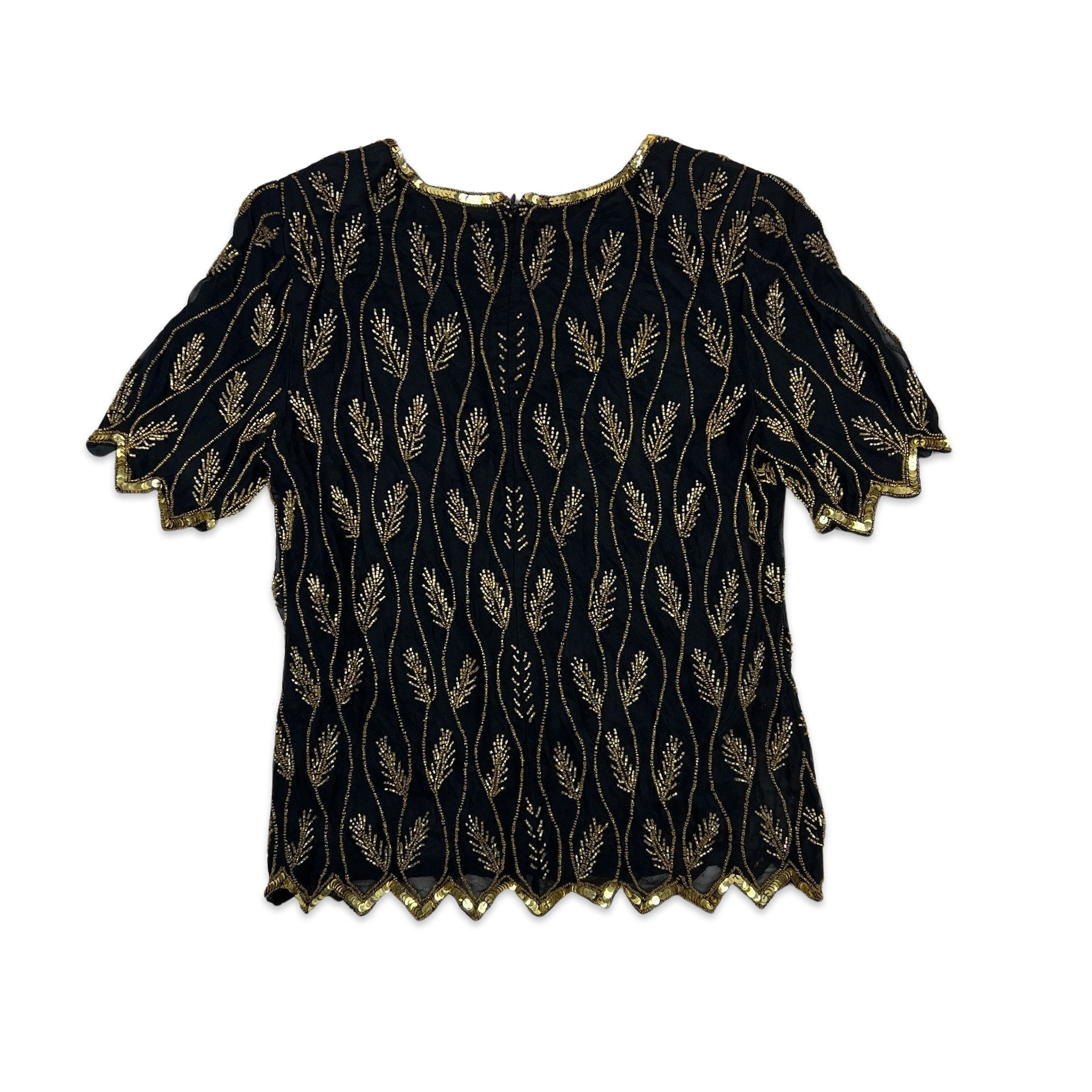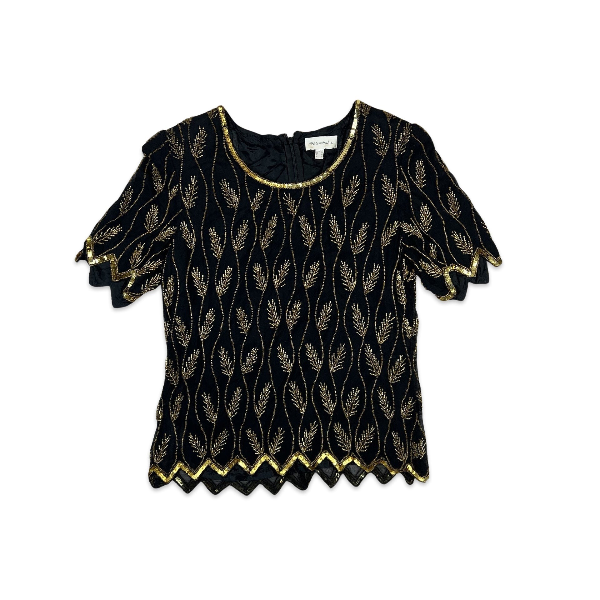 Vintage 80s Sequin Blouse Black Gold 8 10