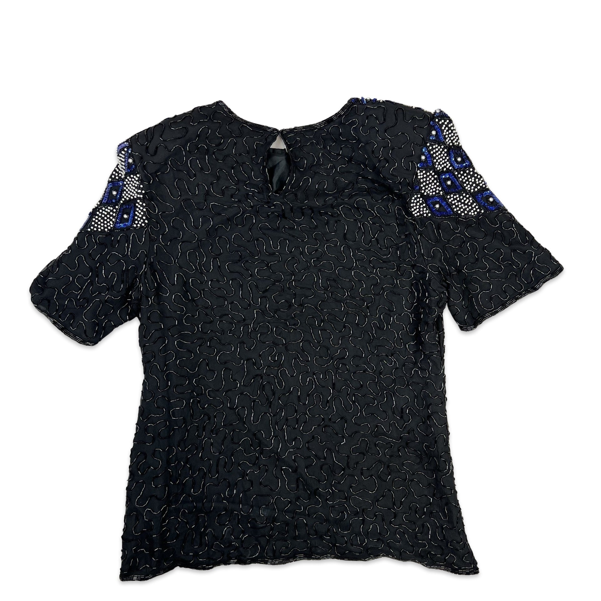 Vintage 80s Boxy Oversized Sequin Blouse Black White Blue 10 12