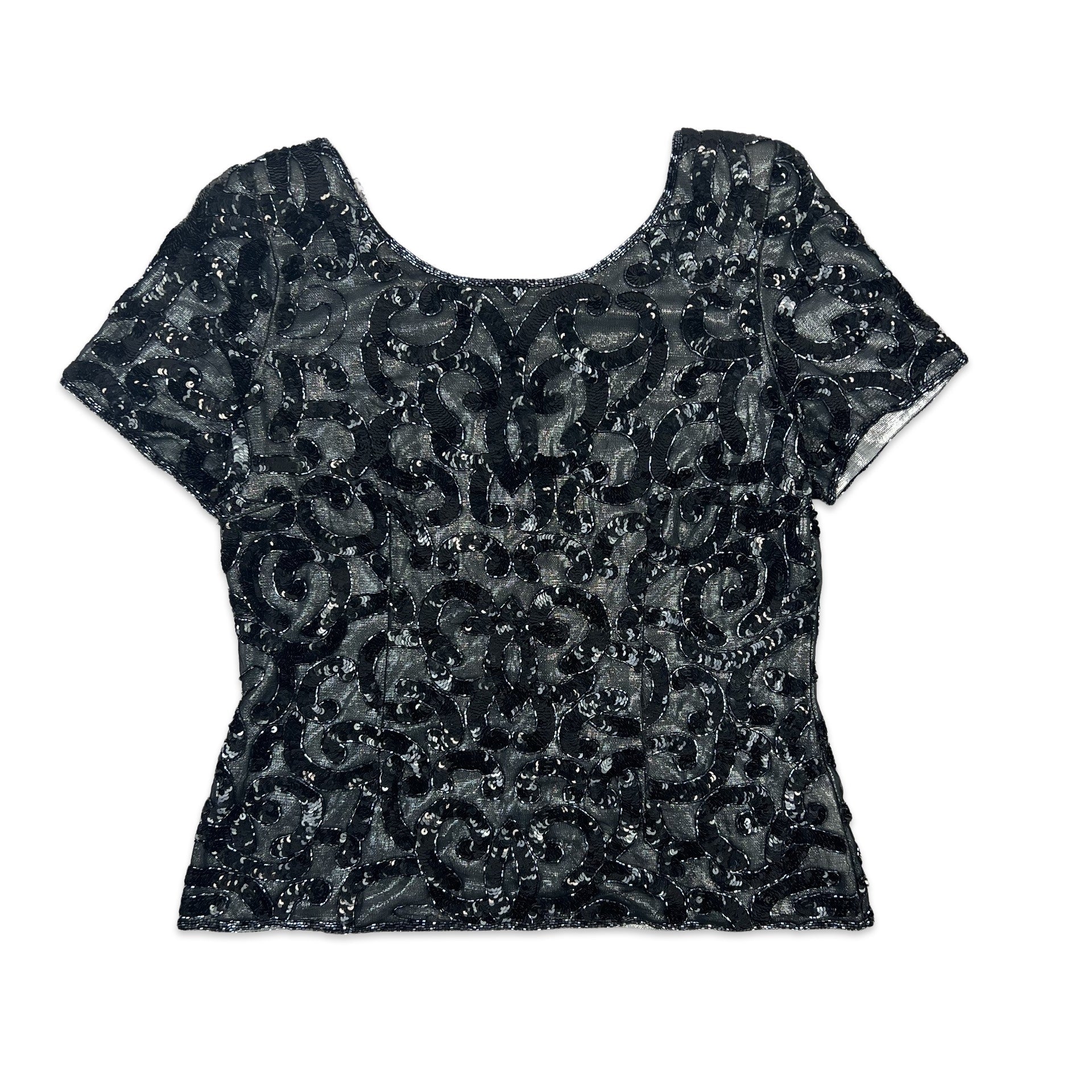 Vintage 80s Sequin Blouse Black Silver 10 12 14