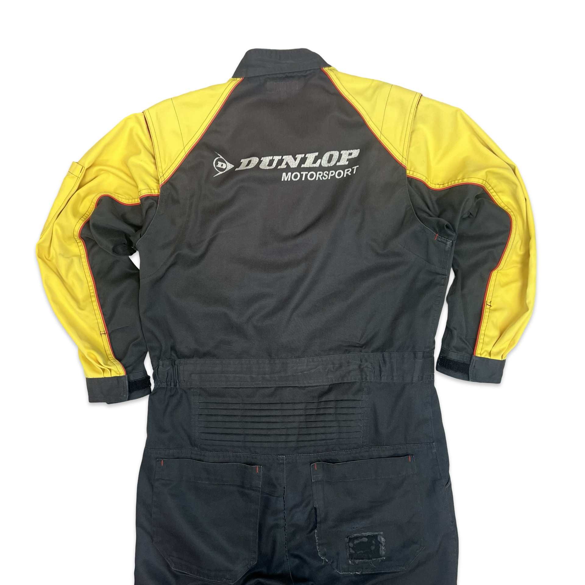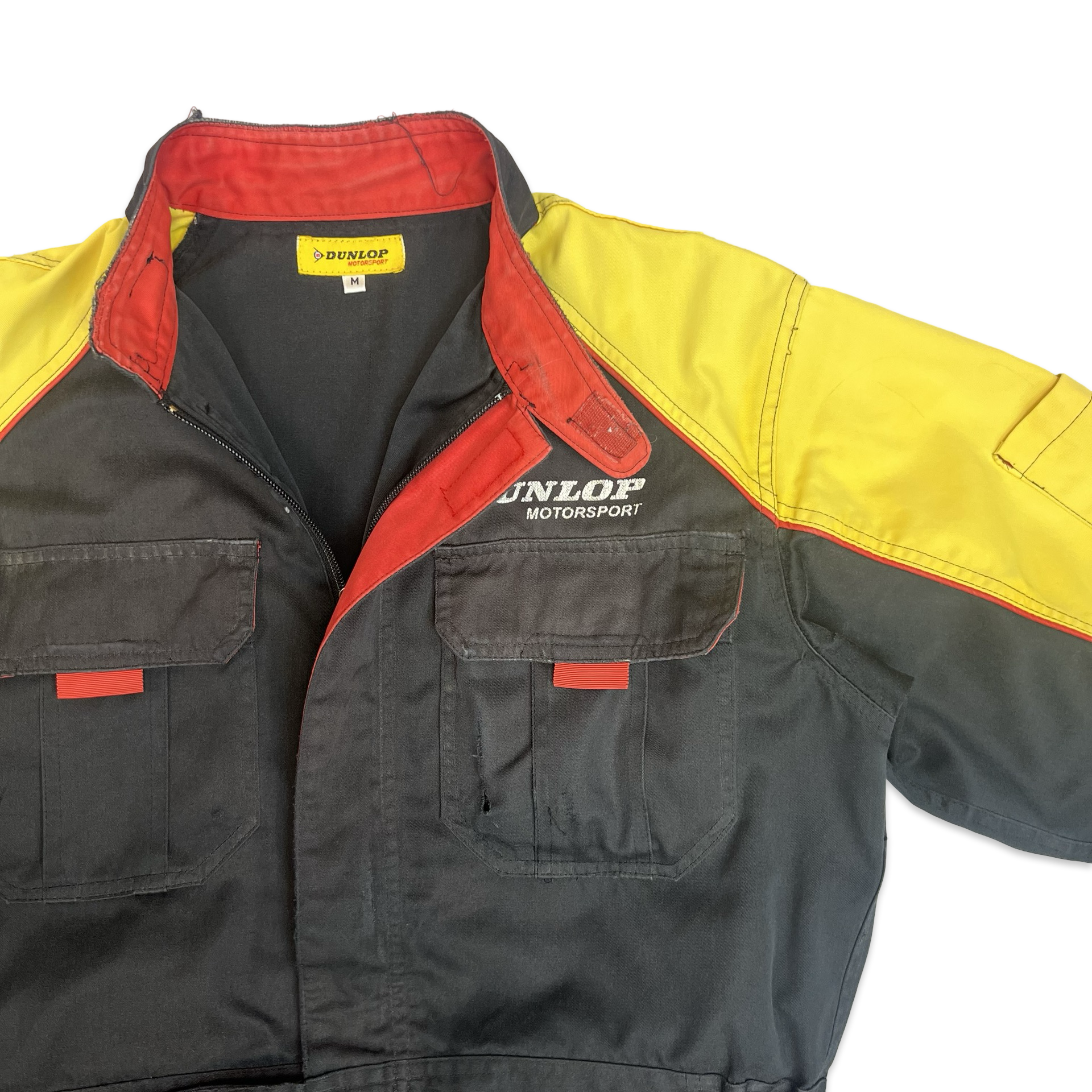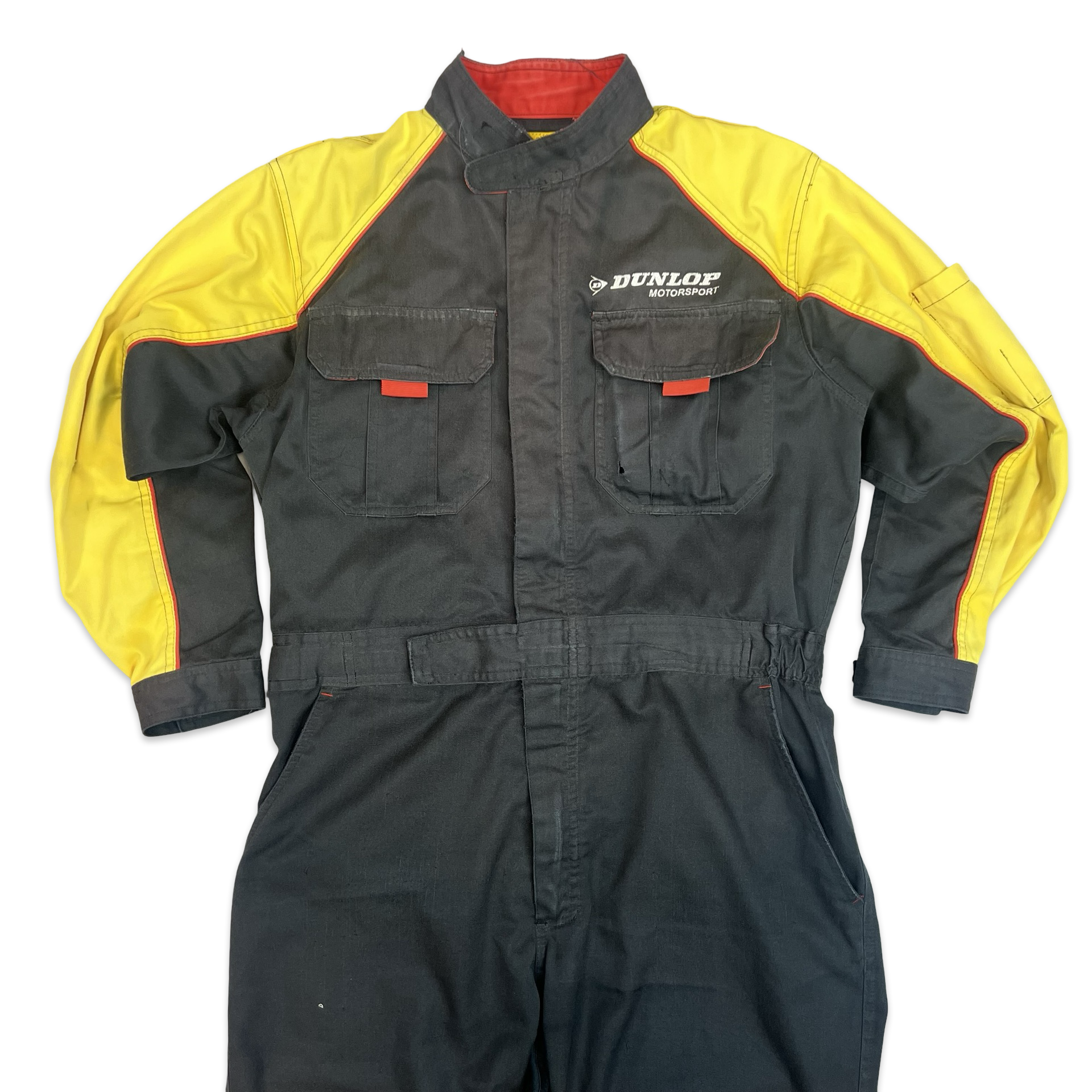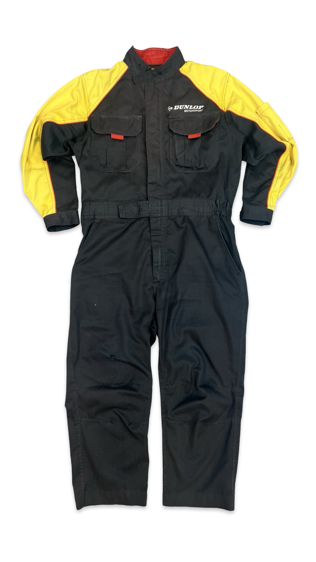 Japanese imported preloved Dunlop technician jumpsuit in brown and yellow with zip-up front. Some moderate signs of wear as to be expected with preloved workwear, including heel bite and some small holes, pictured.
