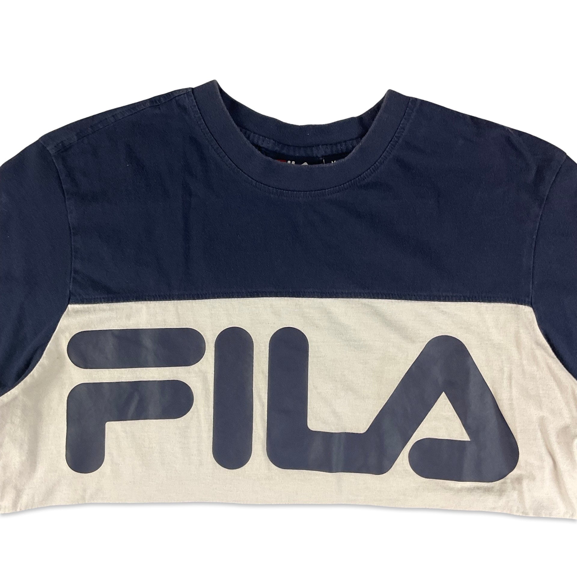 Preloved FILA navy, white, and light blue tee with large front logo graphic print.
