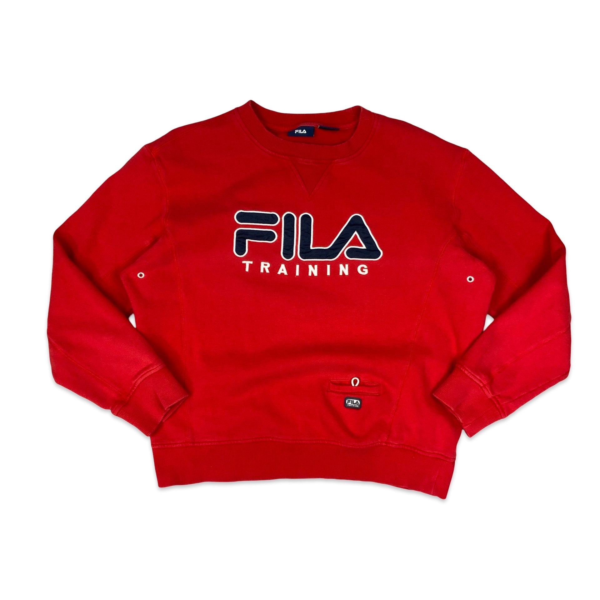 Preloved FILA red spell out sweatshirt with small pocket detail.