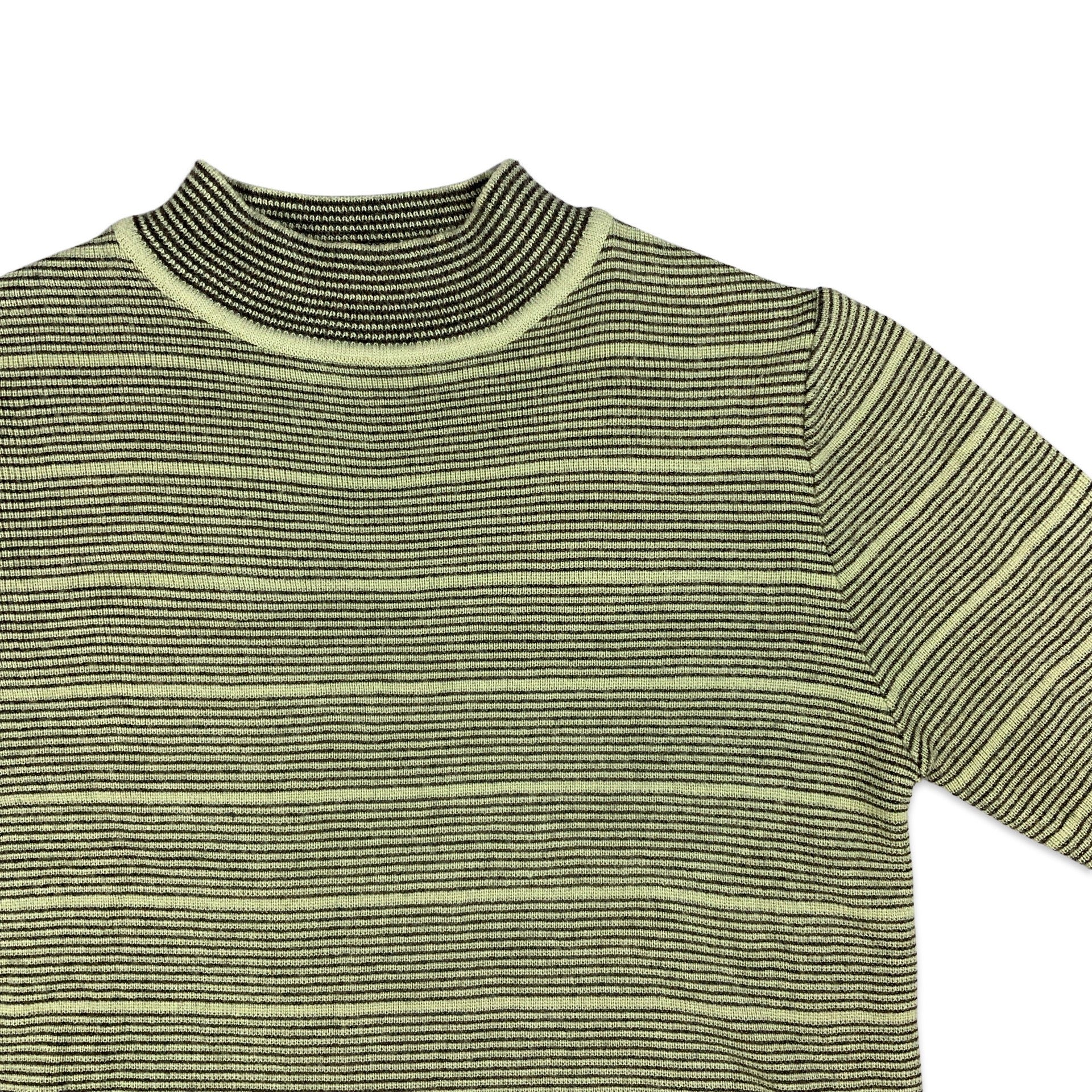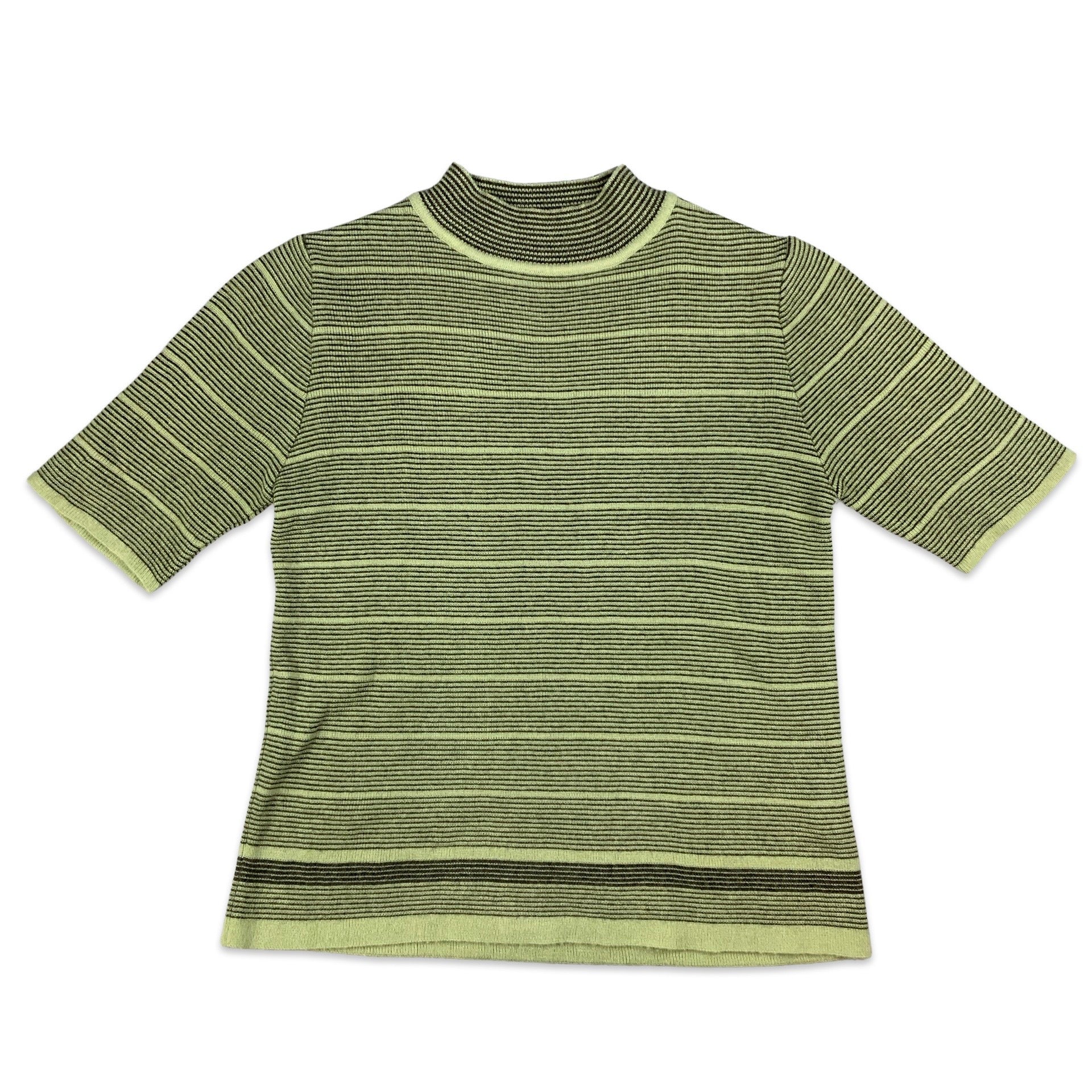 Preloved green and black striped knitted short sleeve jumper with mock neck. Some stretch to the material.
