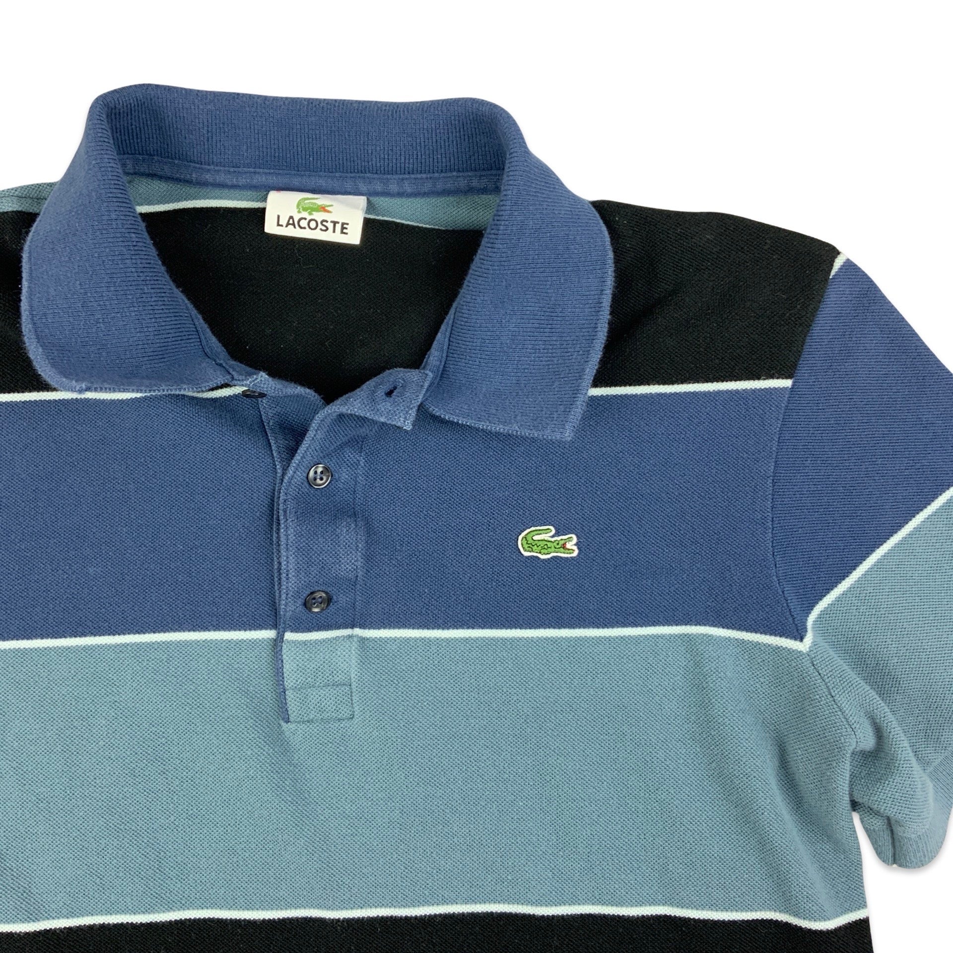 Preloved Lacoste men's polo shirt in large stripes of shades of blue.