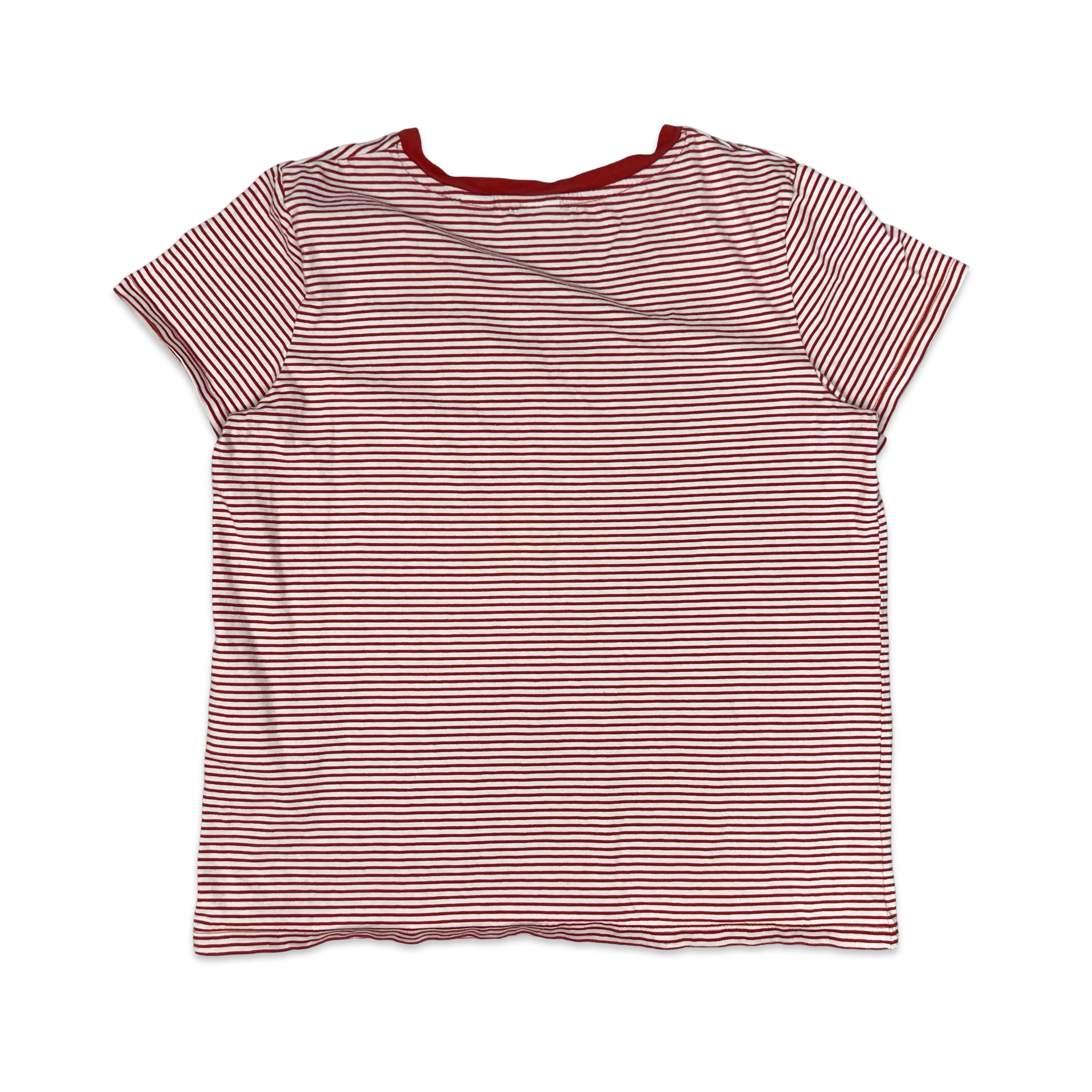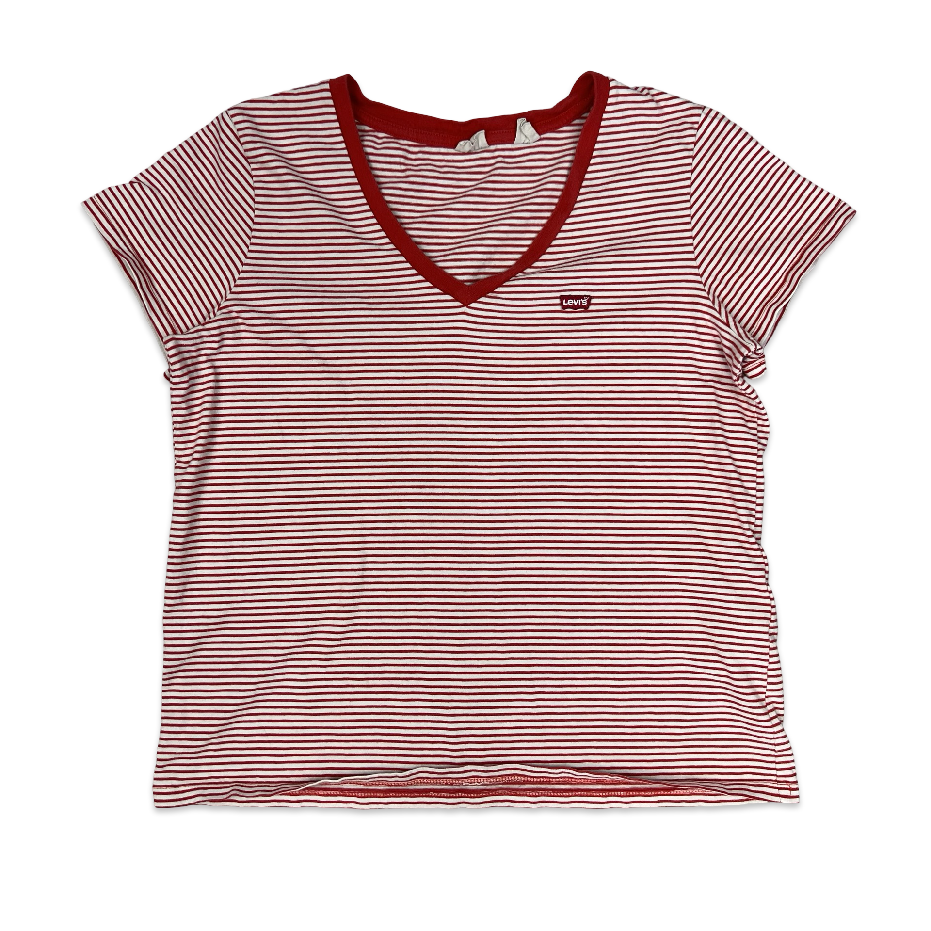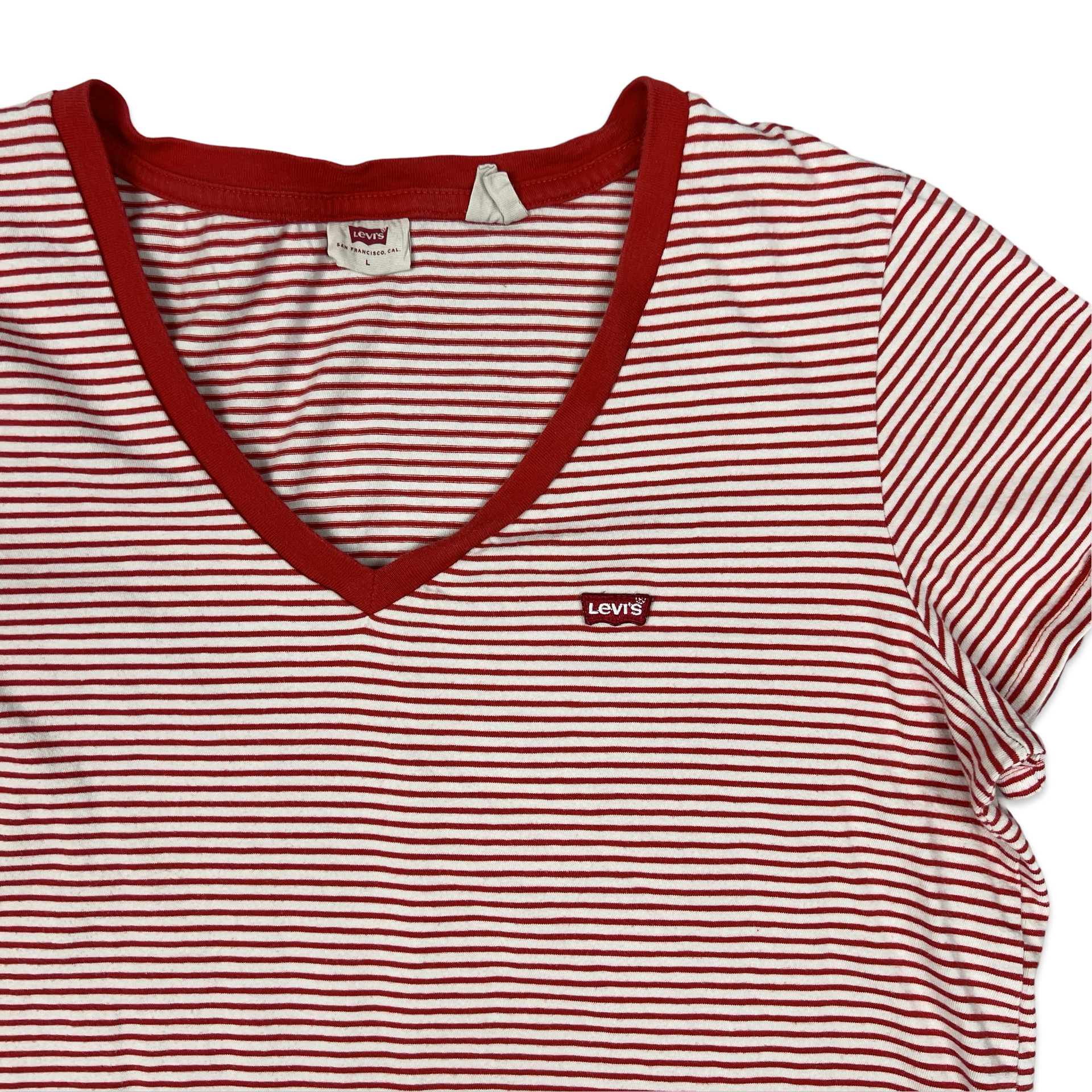 Preloved Levi's women's red and white striped V-neck t-shirt with small logo patch on chest.