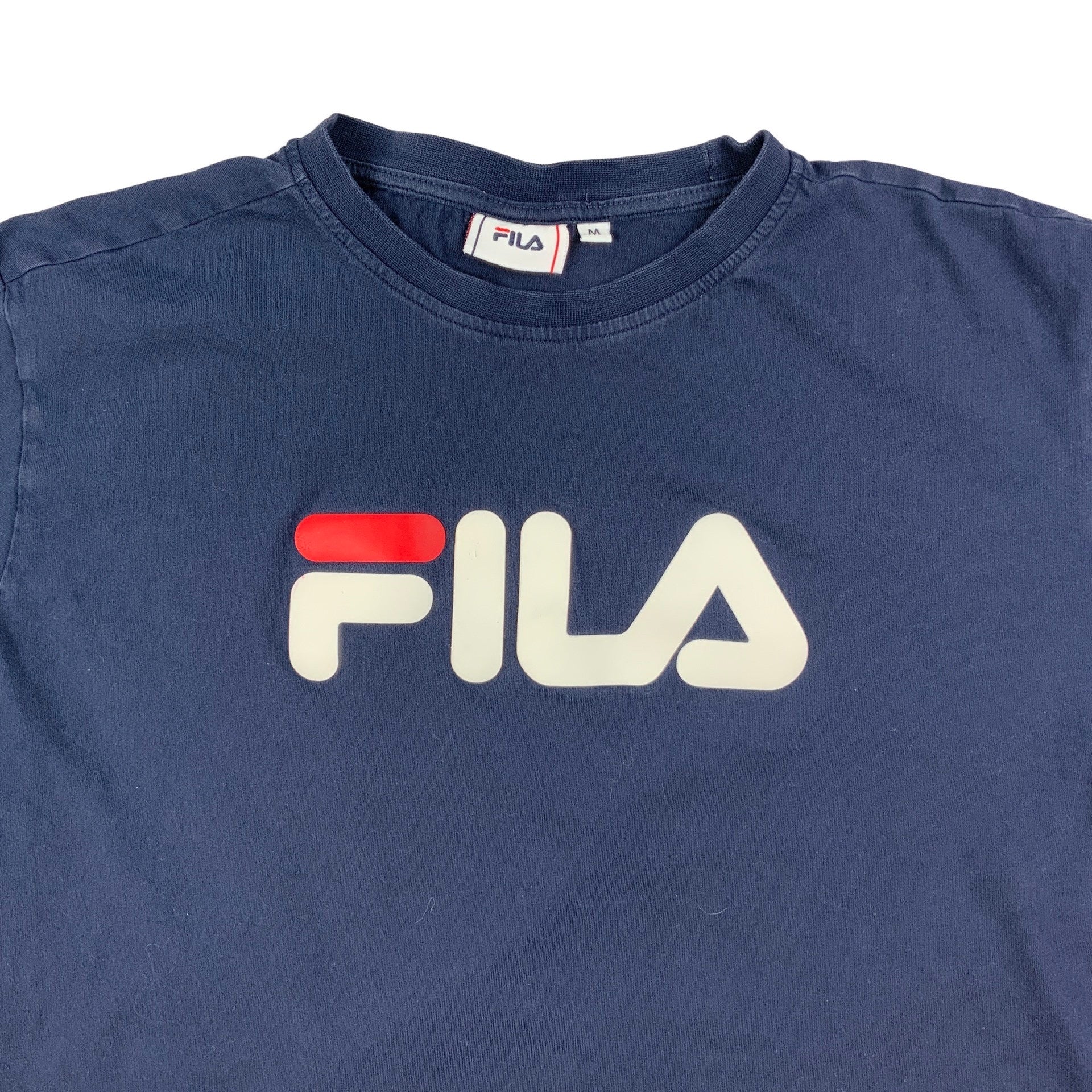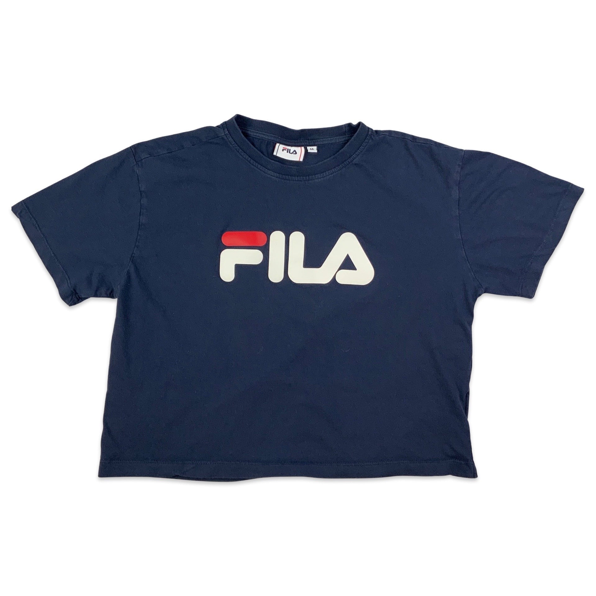 Preloved women's FILA navy cropped tee with front spell out graphic print.