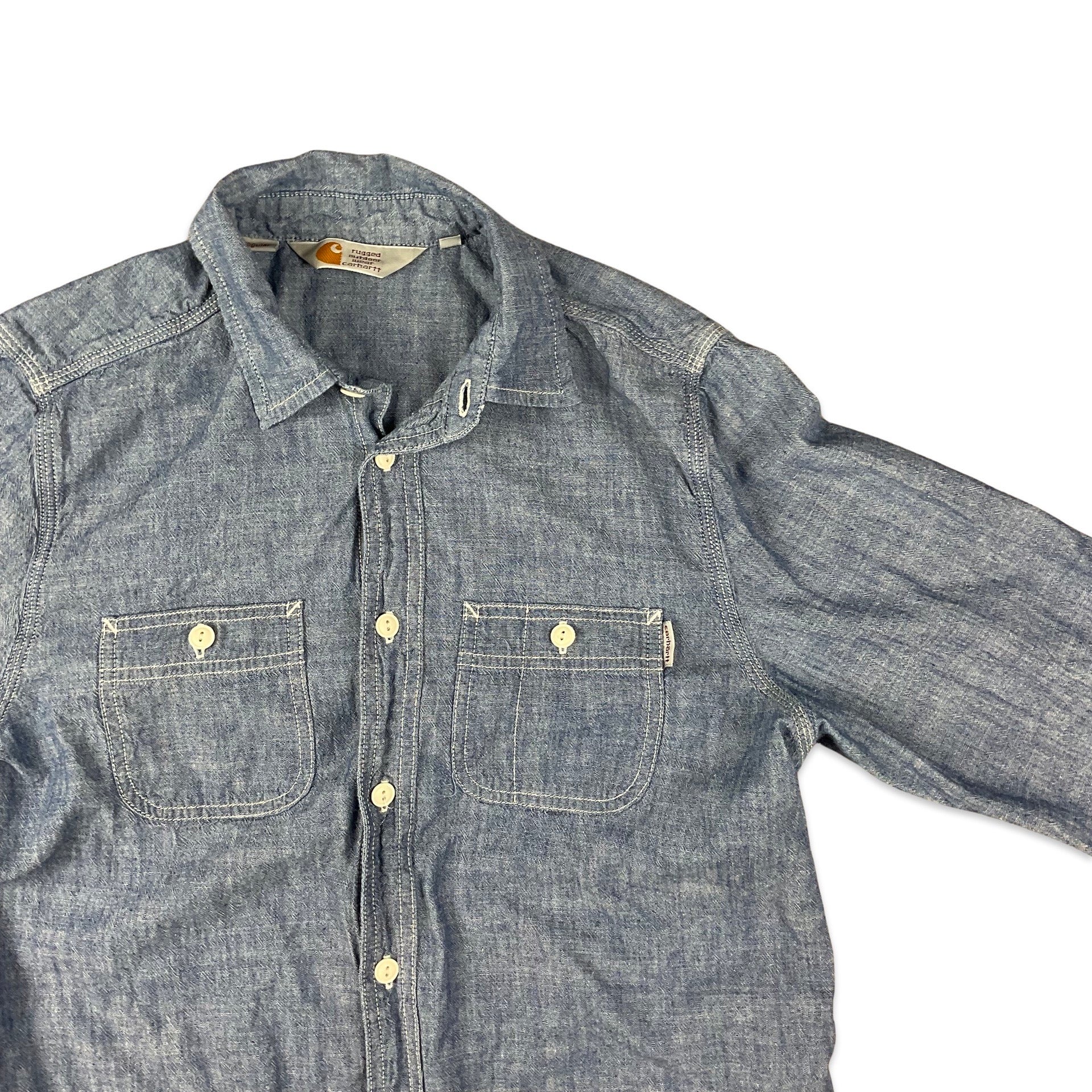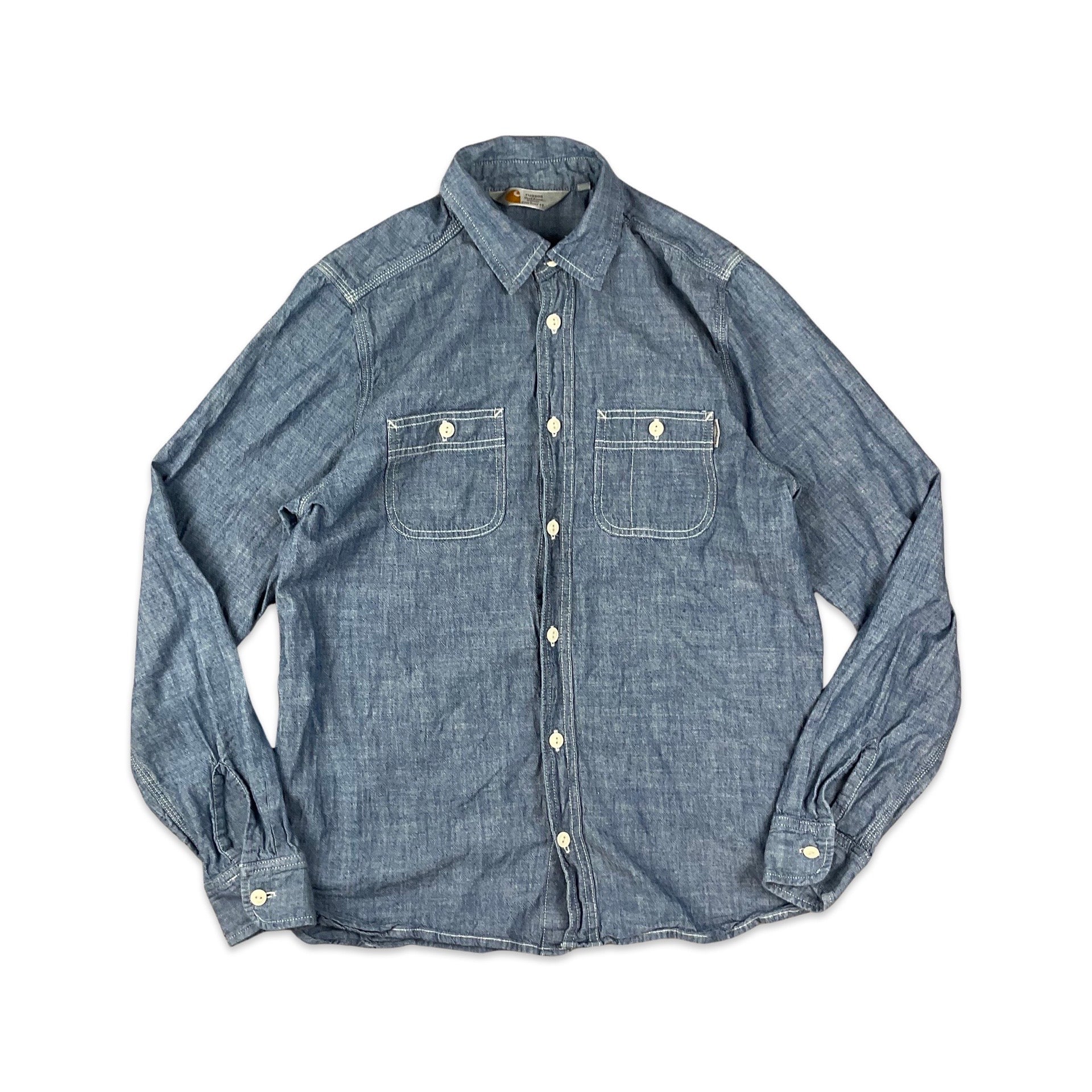 Preloved Carhartt blue chambray button-up shirt with buttoned chest pockets.