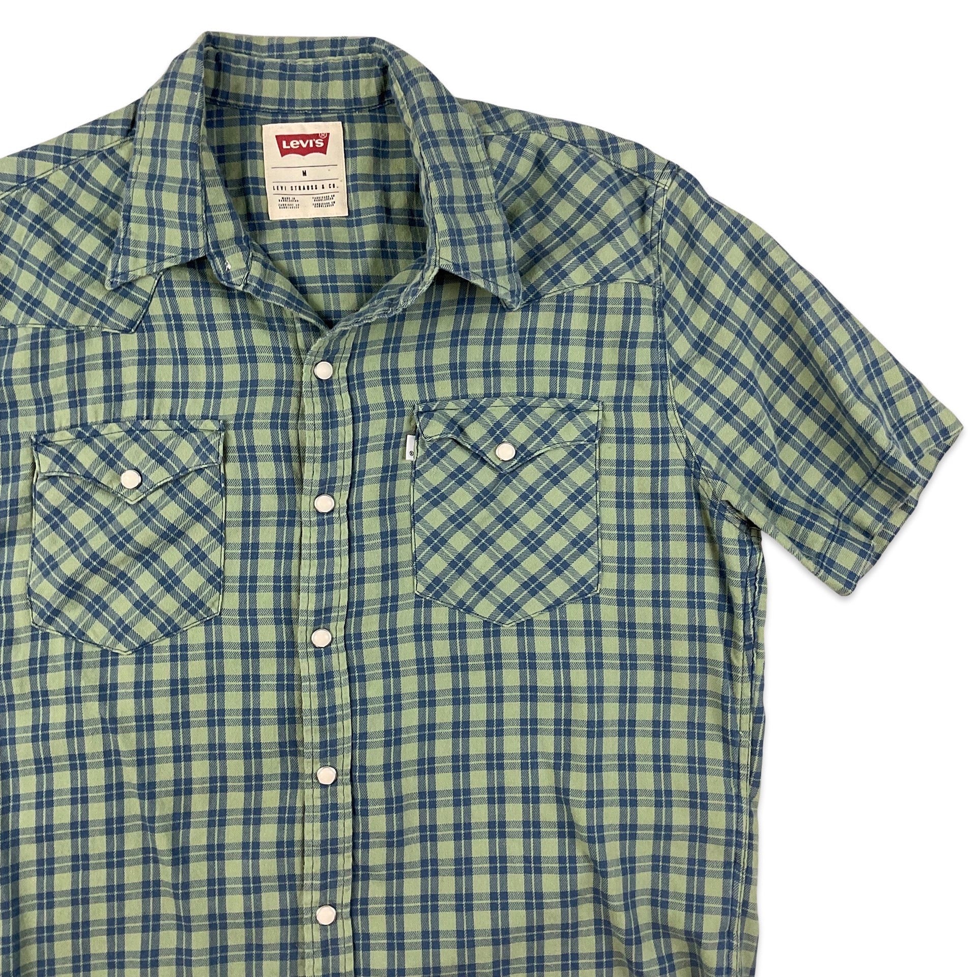 Preloved mens Levi's green and blue western shirt with pearl snapper front opening. Blank white tab.