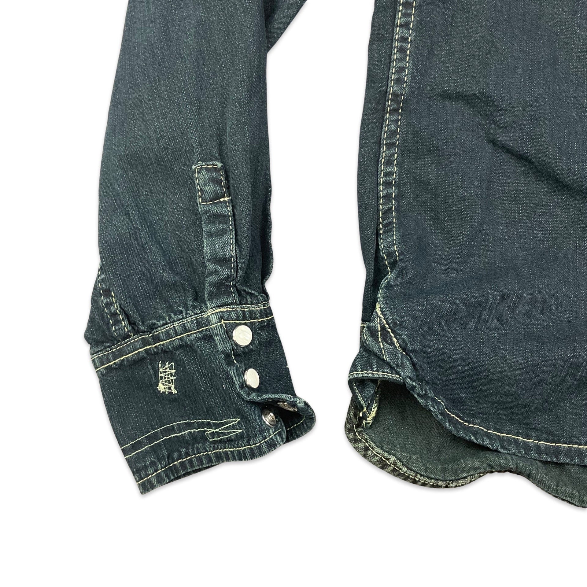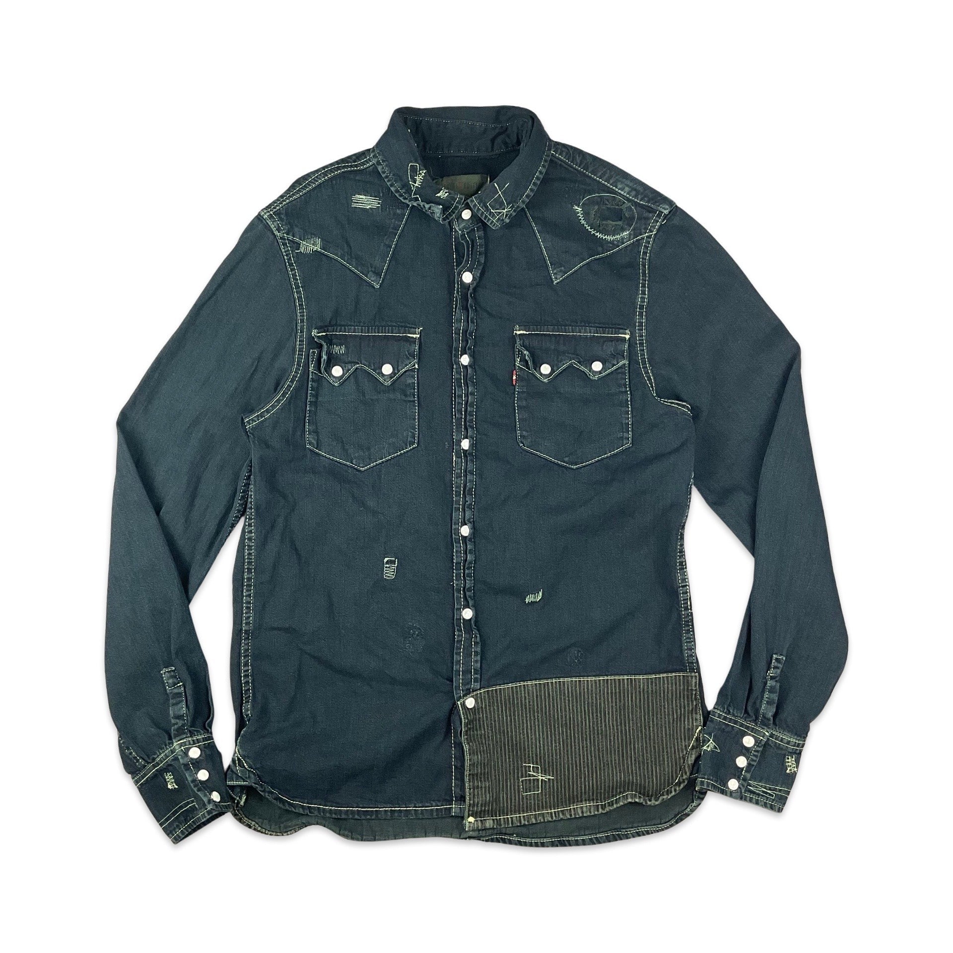 Preloved black denim shirt made in collaboration between Levi's and Roots. Western yoke detailing with faux distressing and repairs, including pinstripe patches and pearl snapper front opening. One snapper in the cuff (pictured) is non functional.