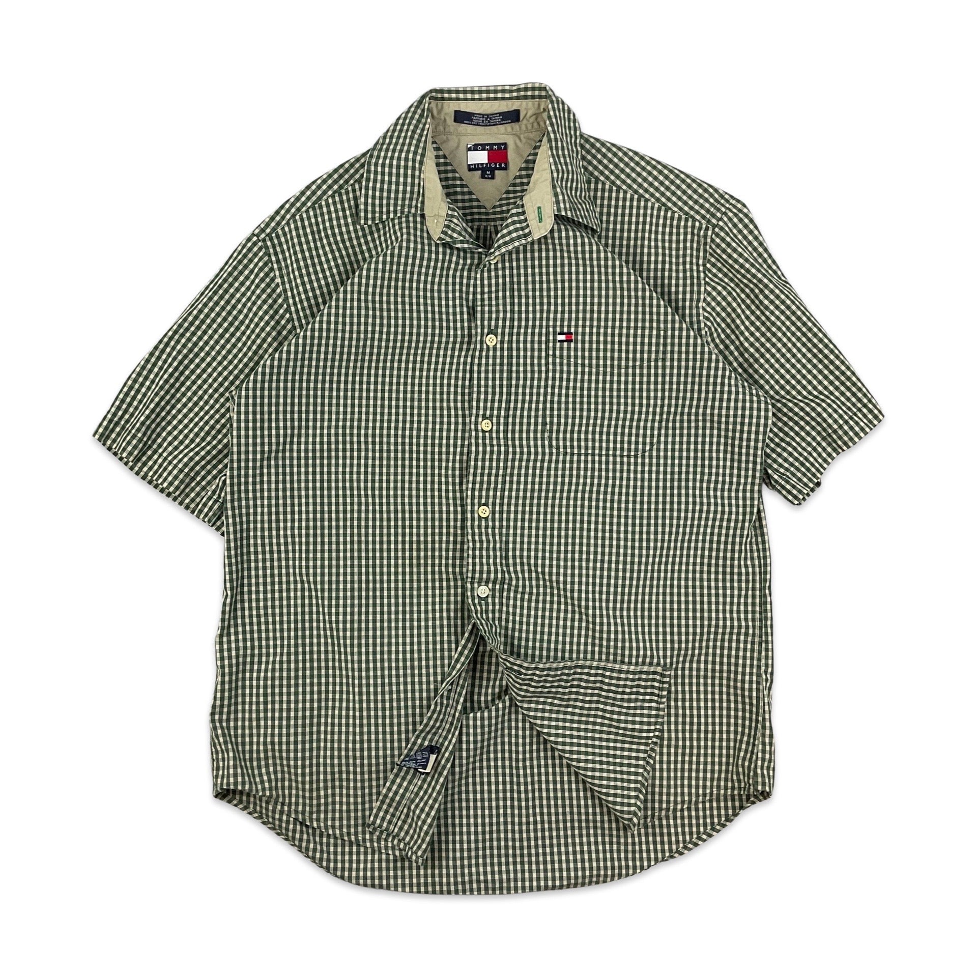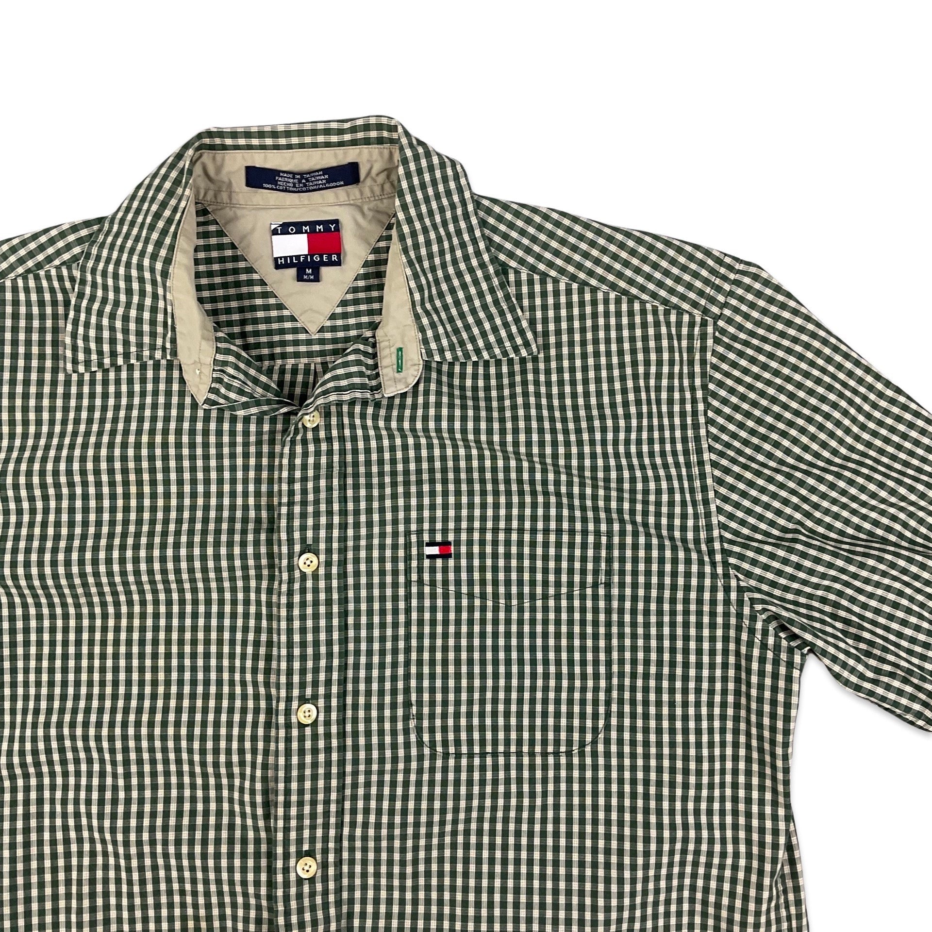 Vintage mens 90s Tommy Hilfiger button-up short sleeved shirt in a green plaid pattern with one chest pocket.