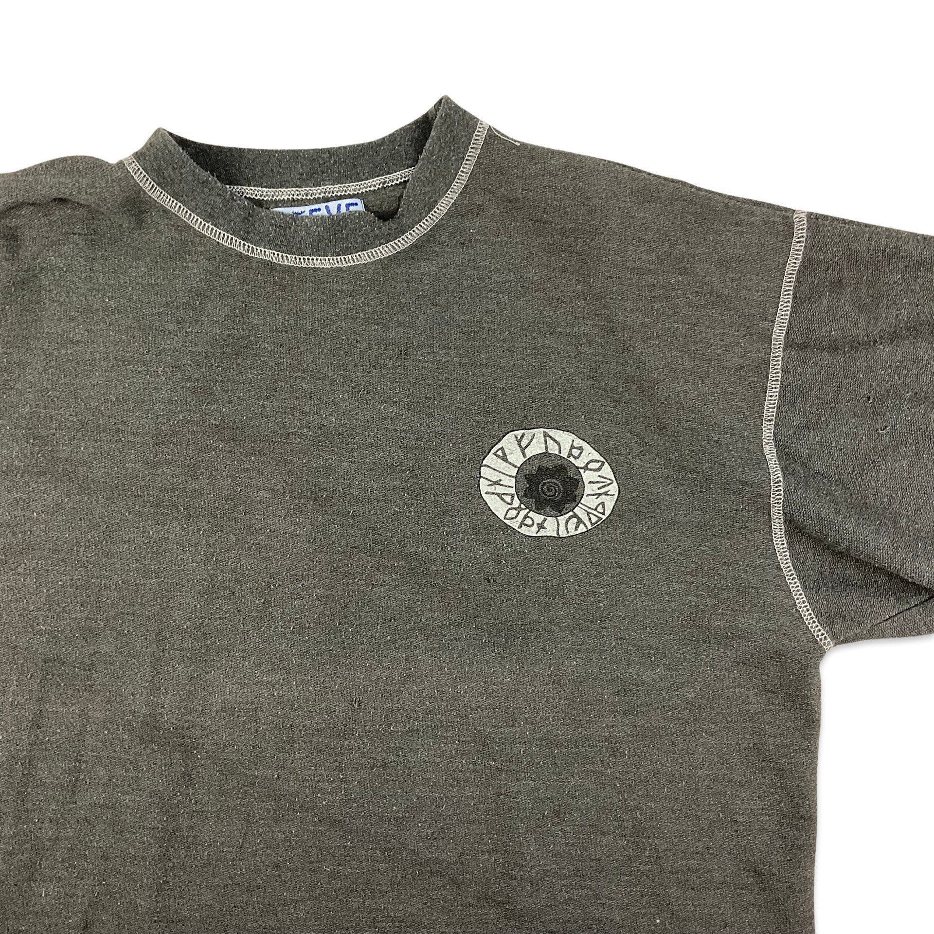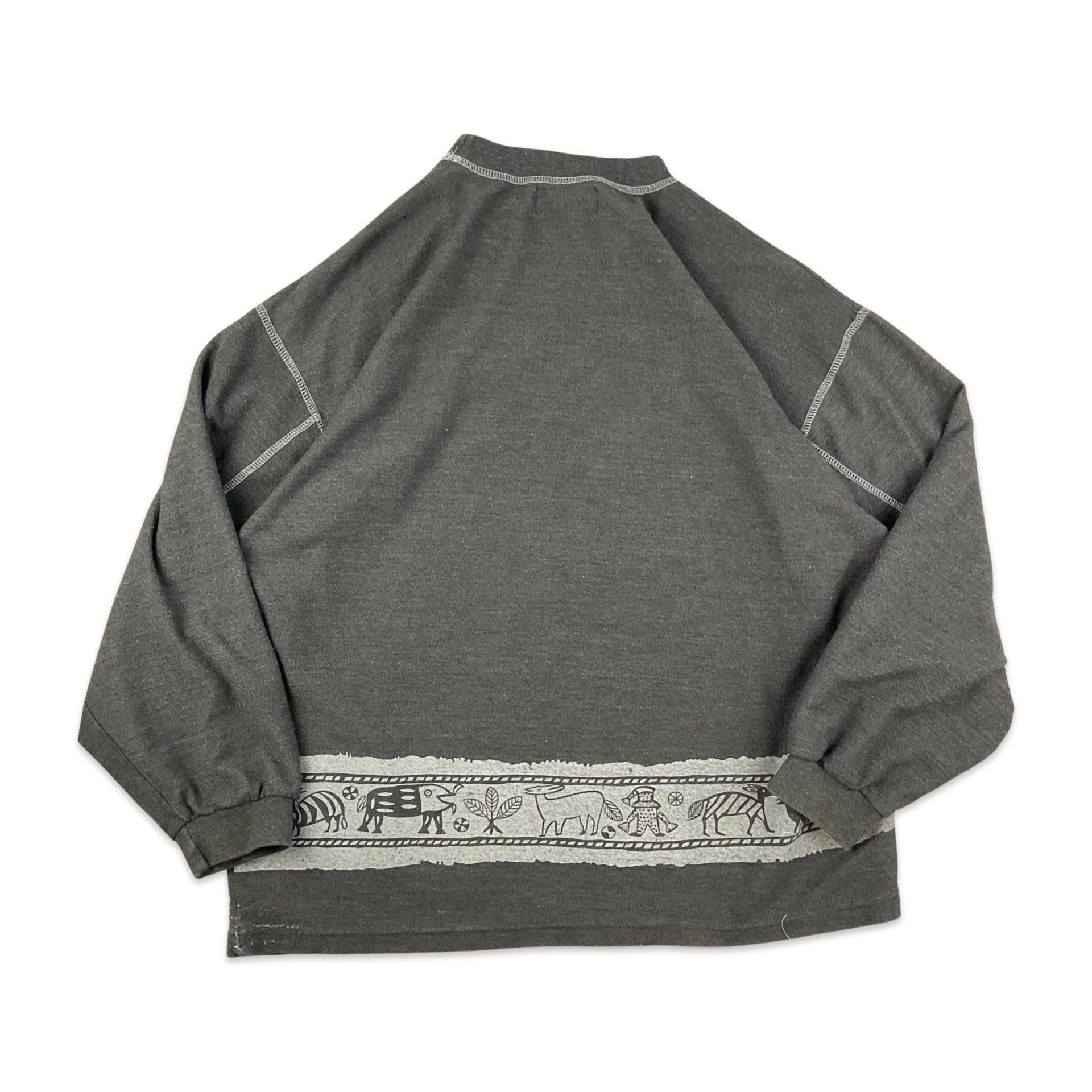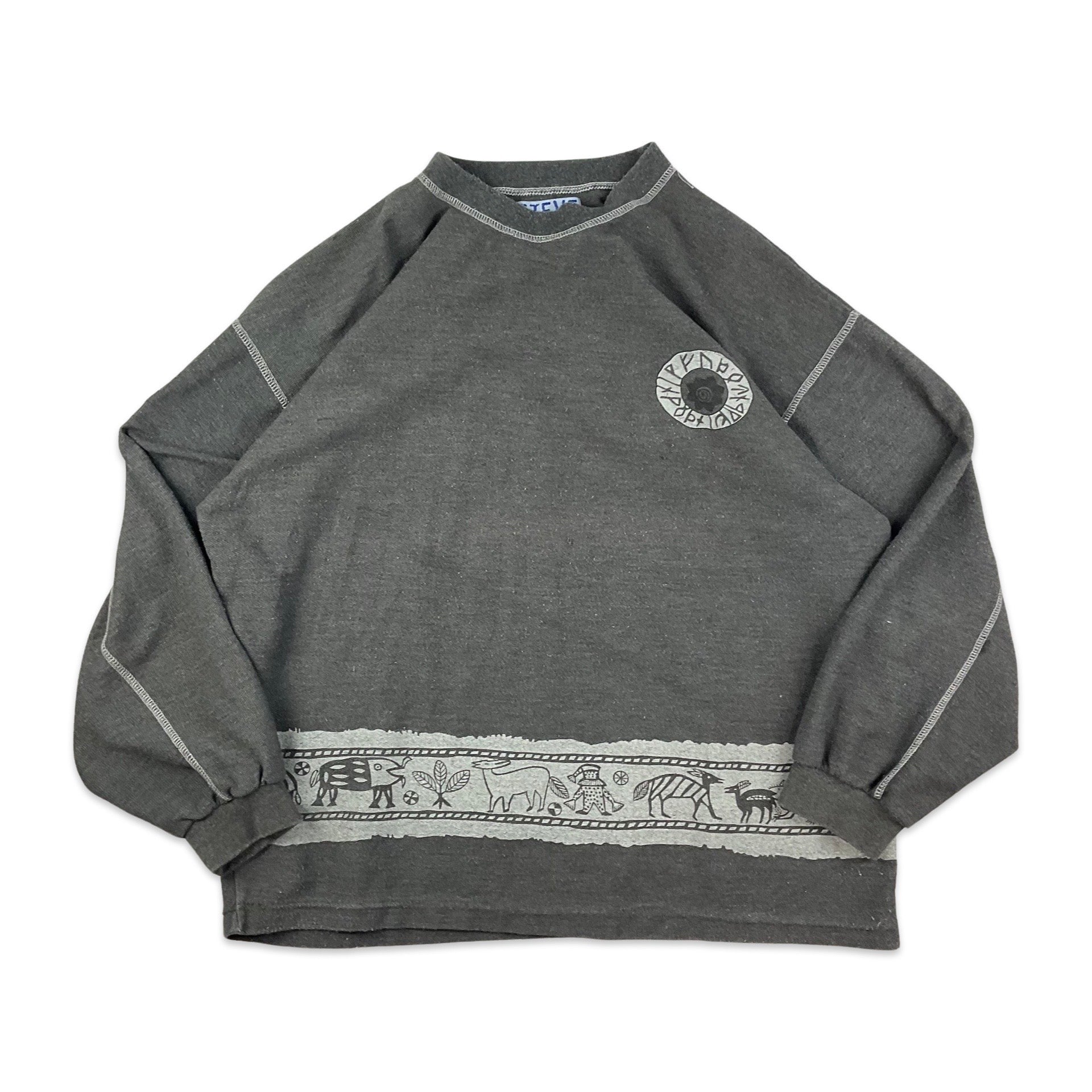Vintage men's lightweight grey sweatshirt with repeated hieroglyphic pattern towards hem.