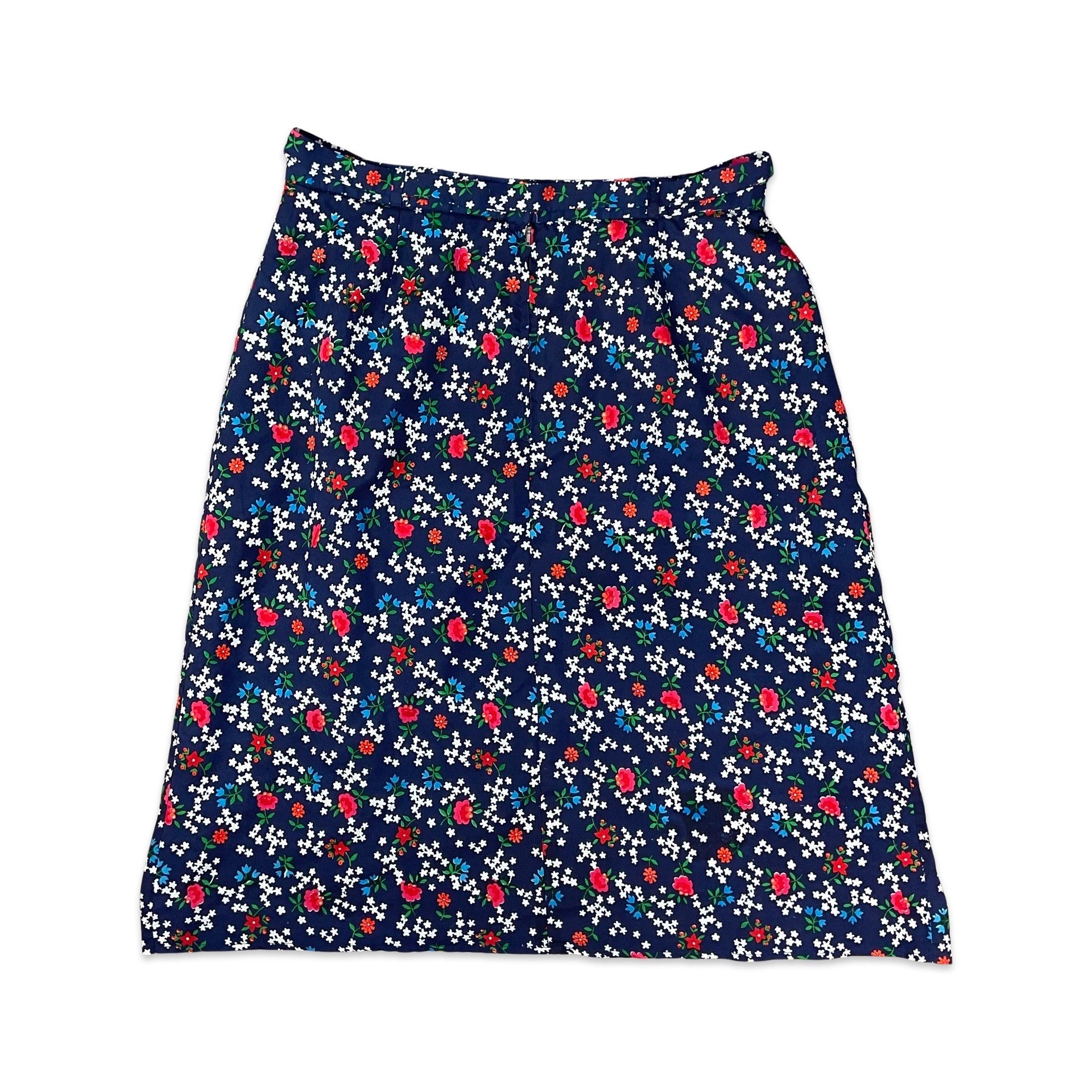 Vintage navy A-line midi skirt with repeating floral pattern in white, green, red, and blue. Matching tie belt and zip fastening.