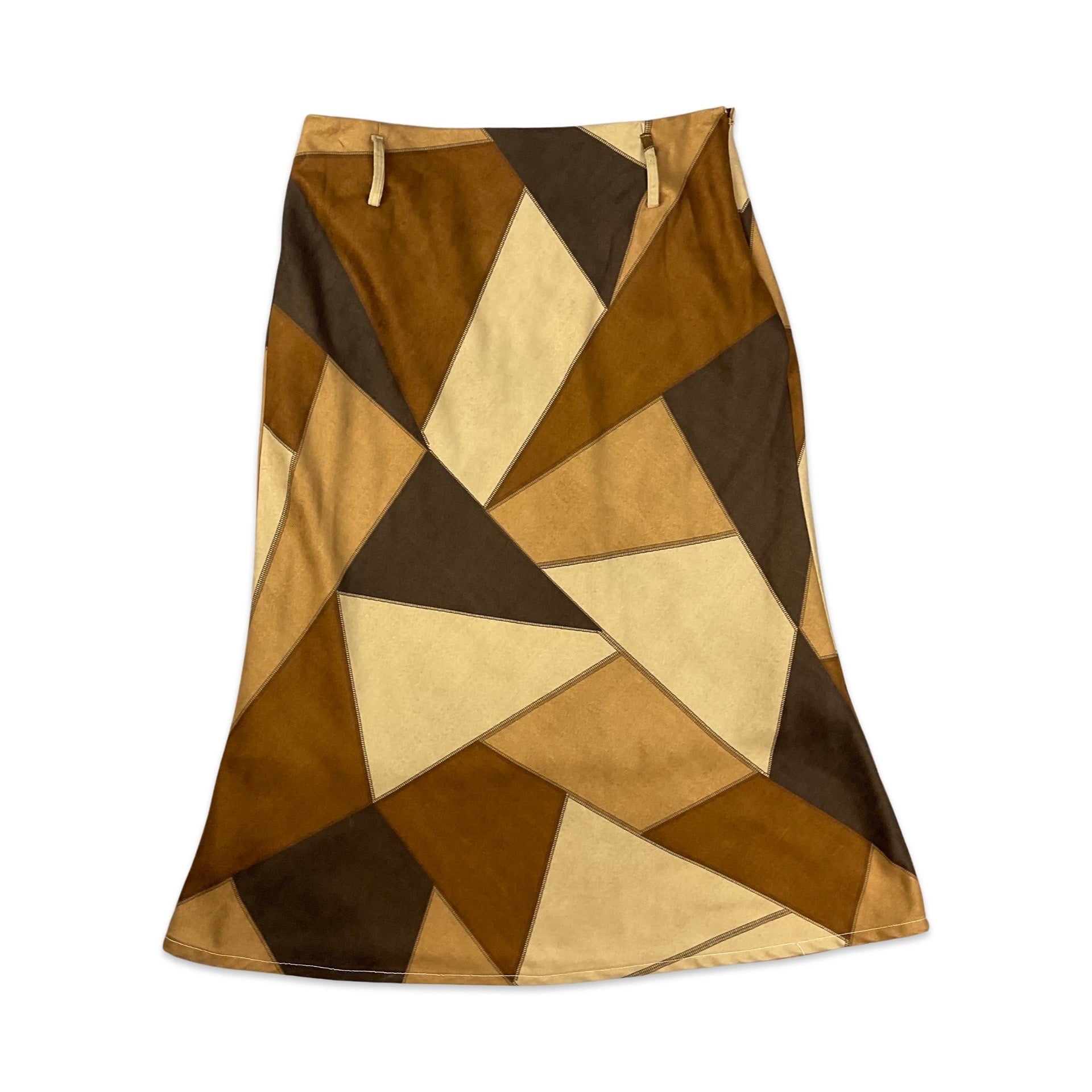 Vintage patchwork style faux suede look brown maxi skirt with belt loops and zip fastening.