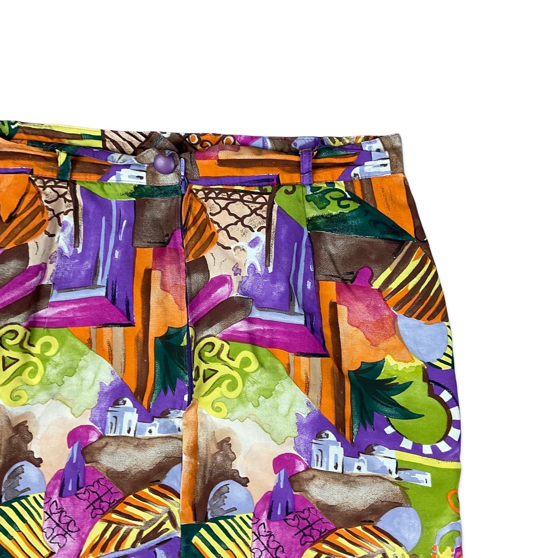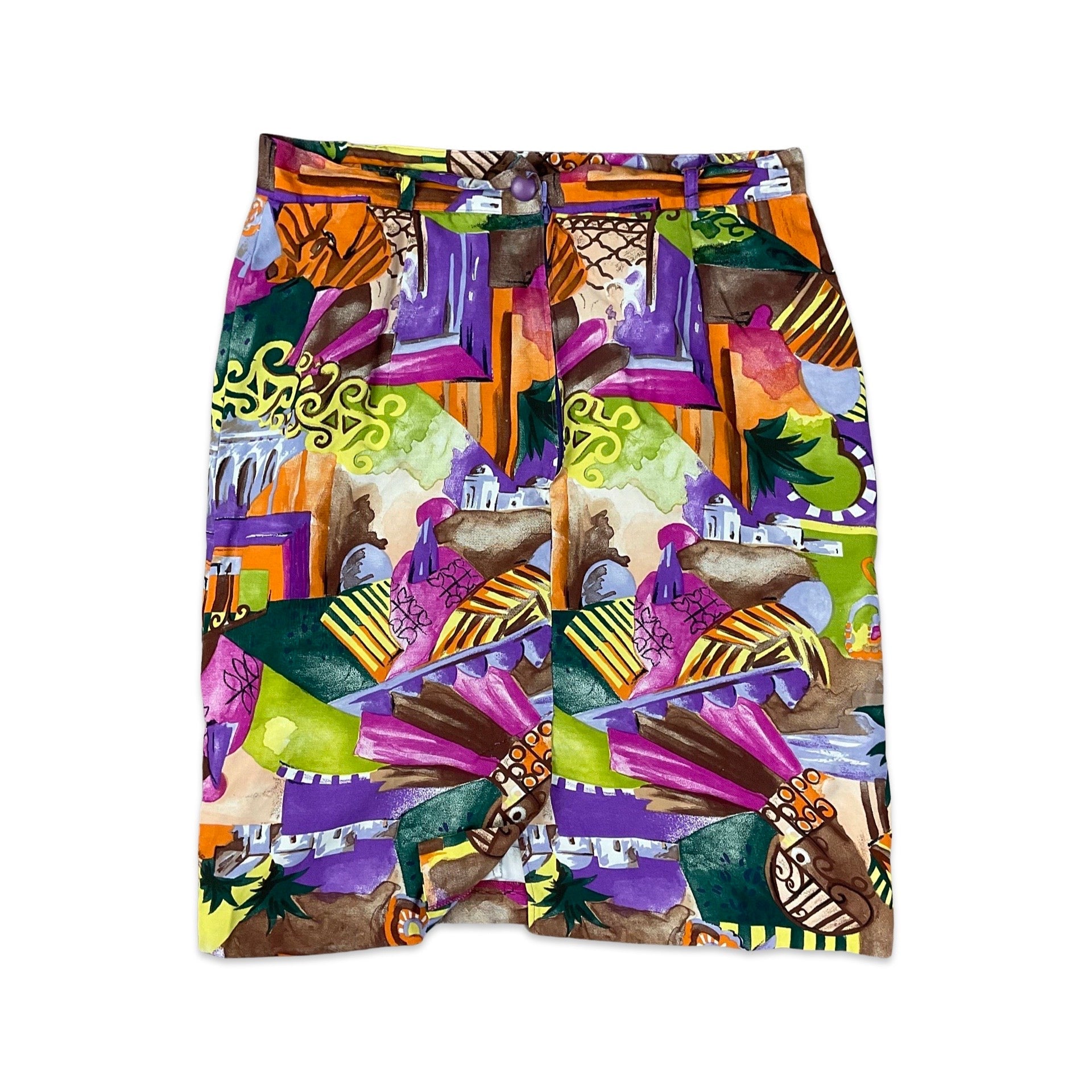 Vintage 80s midi skirt with loud colourful abstract print and belt loops. Zip fastening.