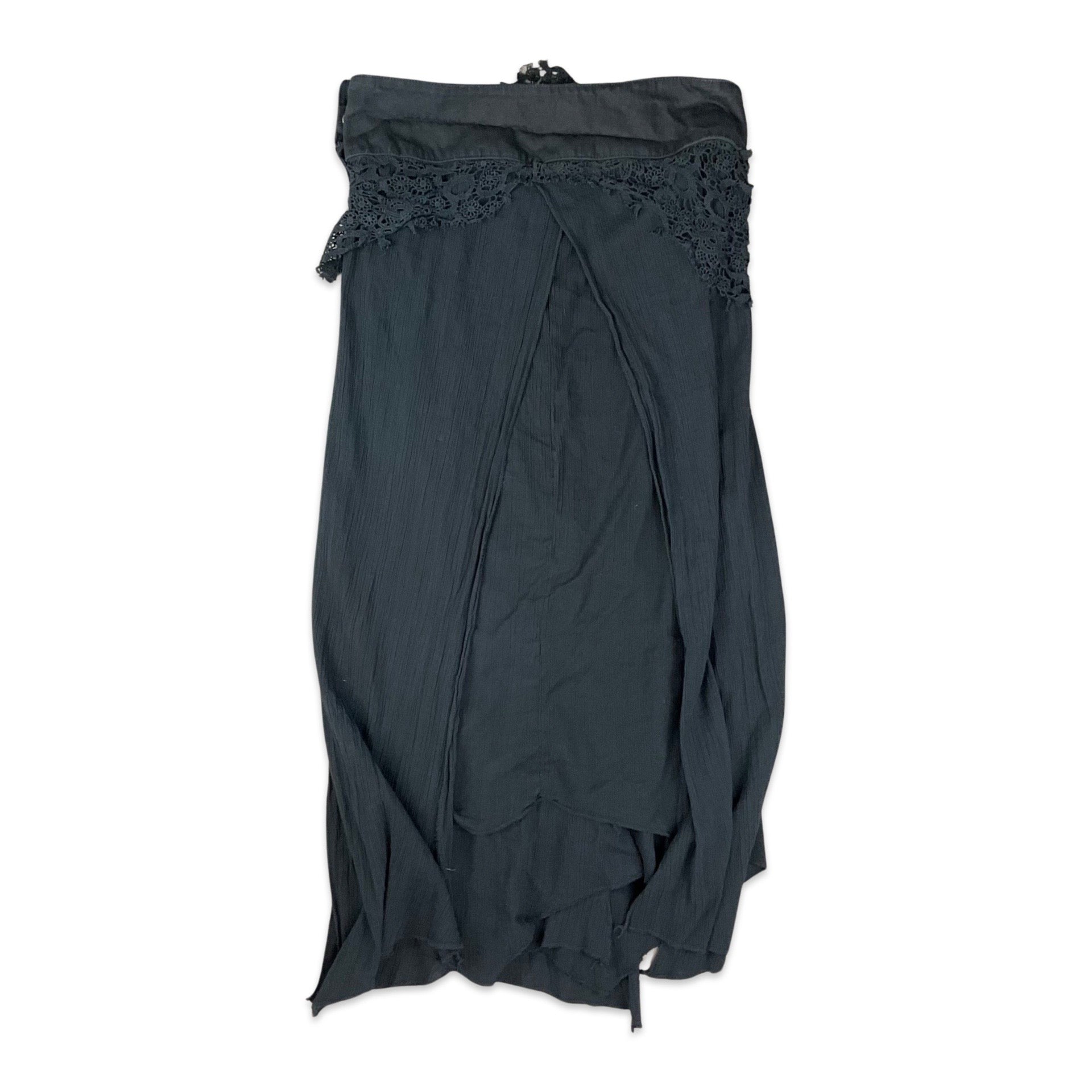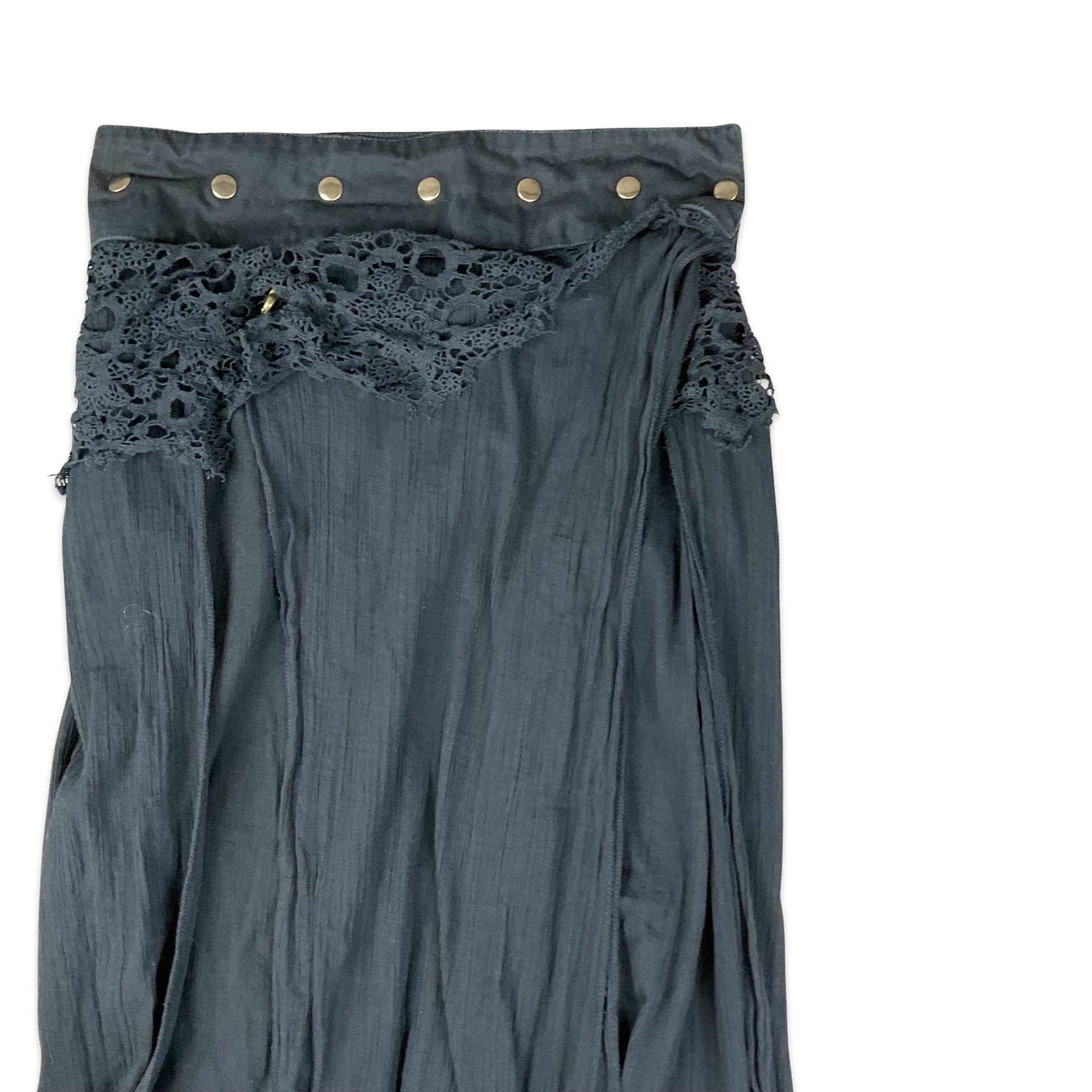 Vintage black long skirt with lace detailing, studs, and asymmetric design.