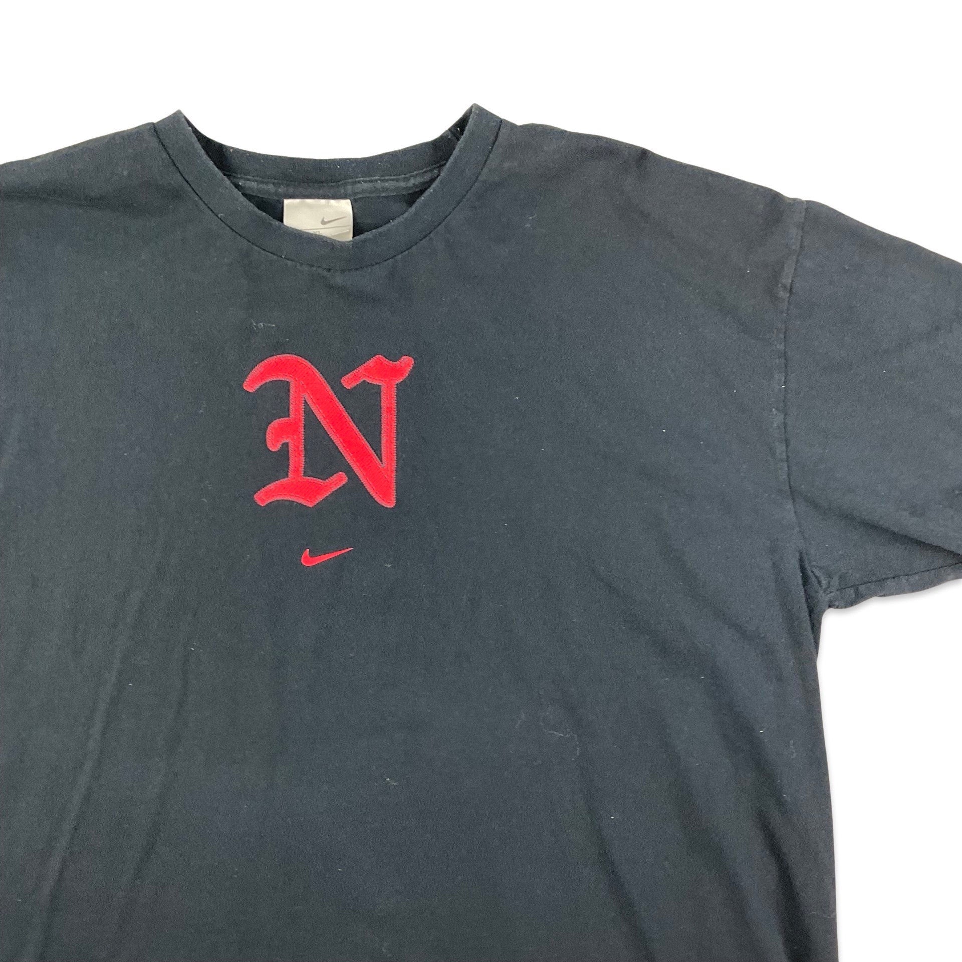 Vintage men's Y2K Nike long sleeve black tee with sleeve spell out and front swoosh / "N" print.