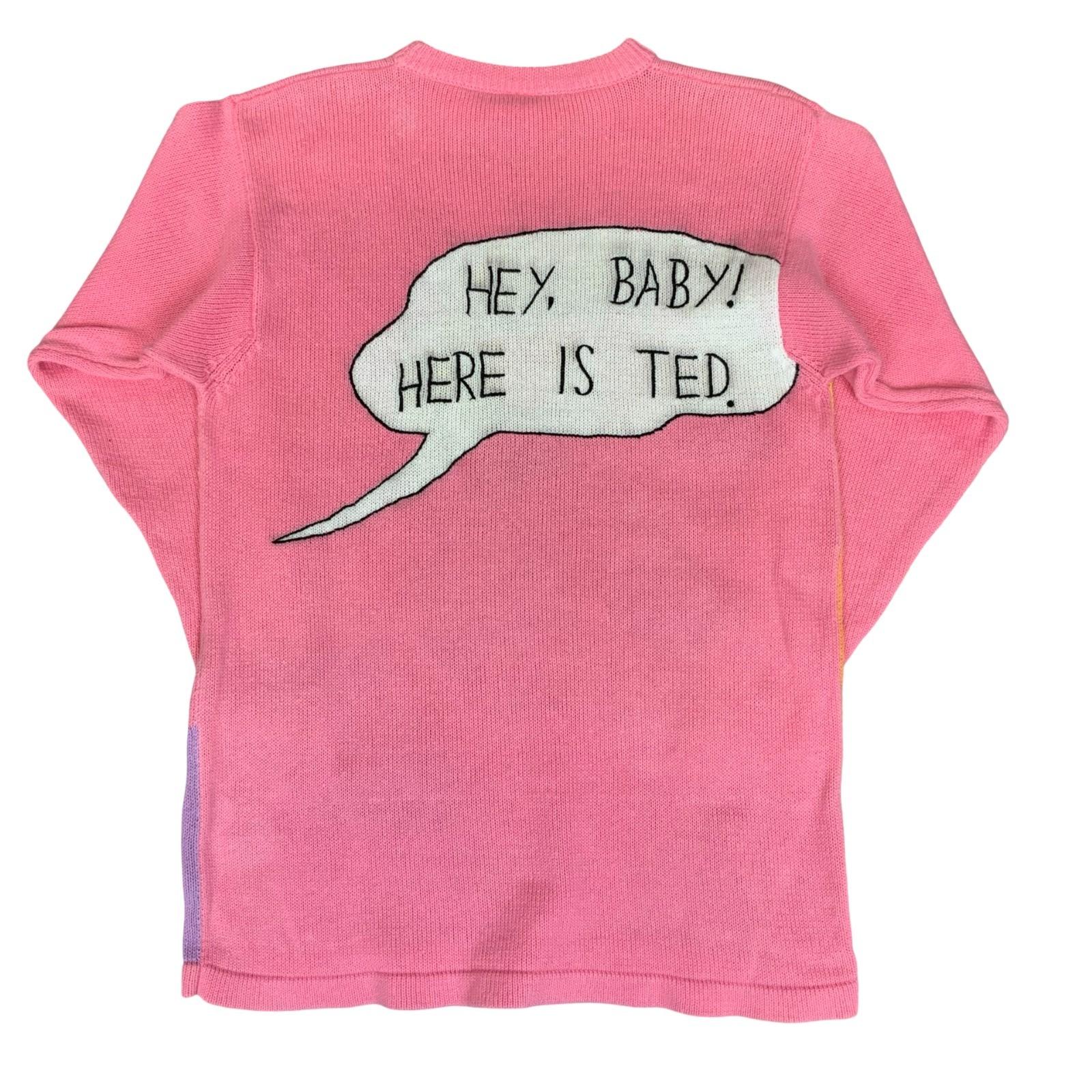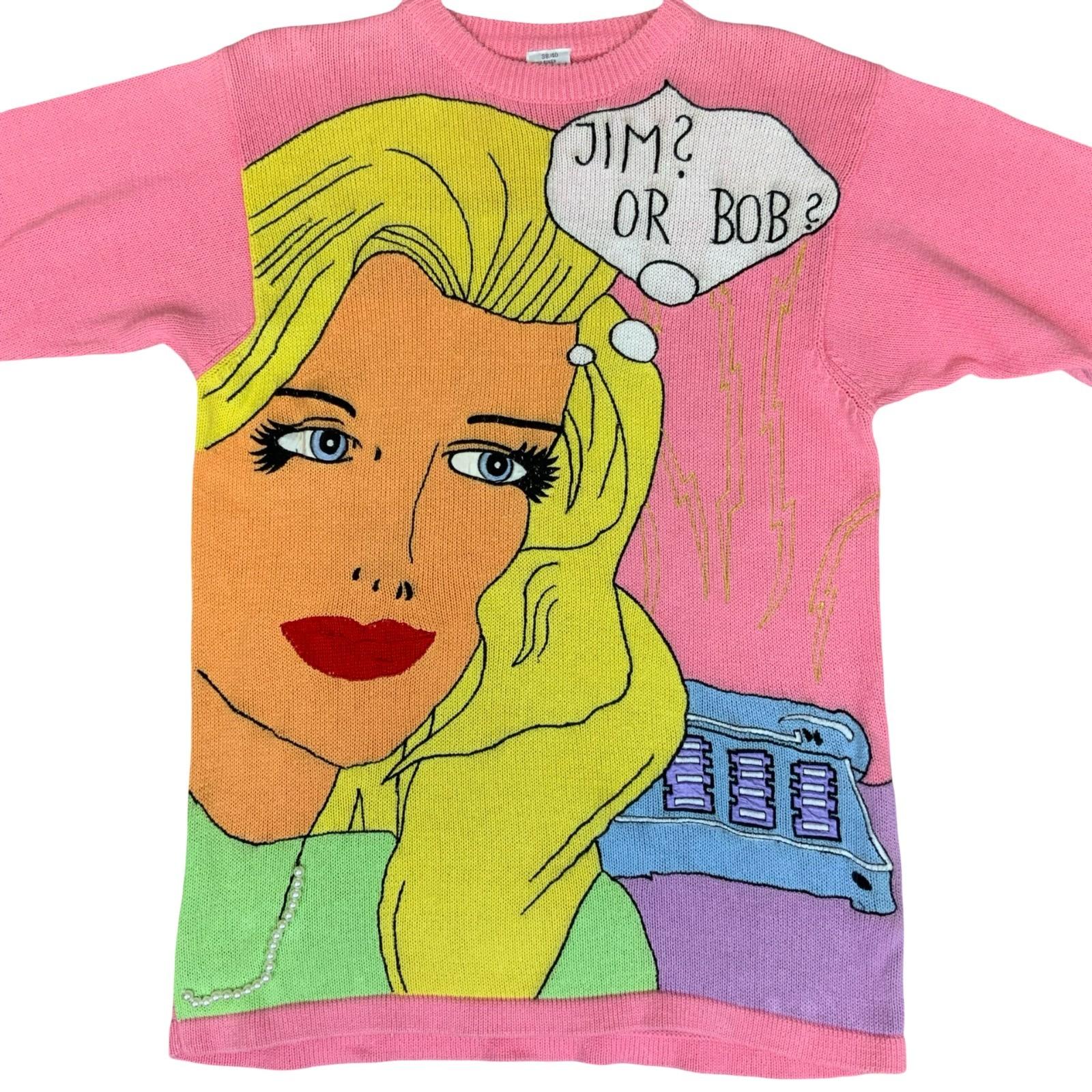 This is a pop art style jumper featuring a cartoon illustration of a blonde woman with a speech bubble that says "Jim? or Bob?", next to a phone, with the speech bubble repeated again on the back saying "Hey, Baby! Here is Ted."