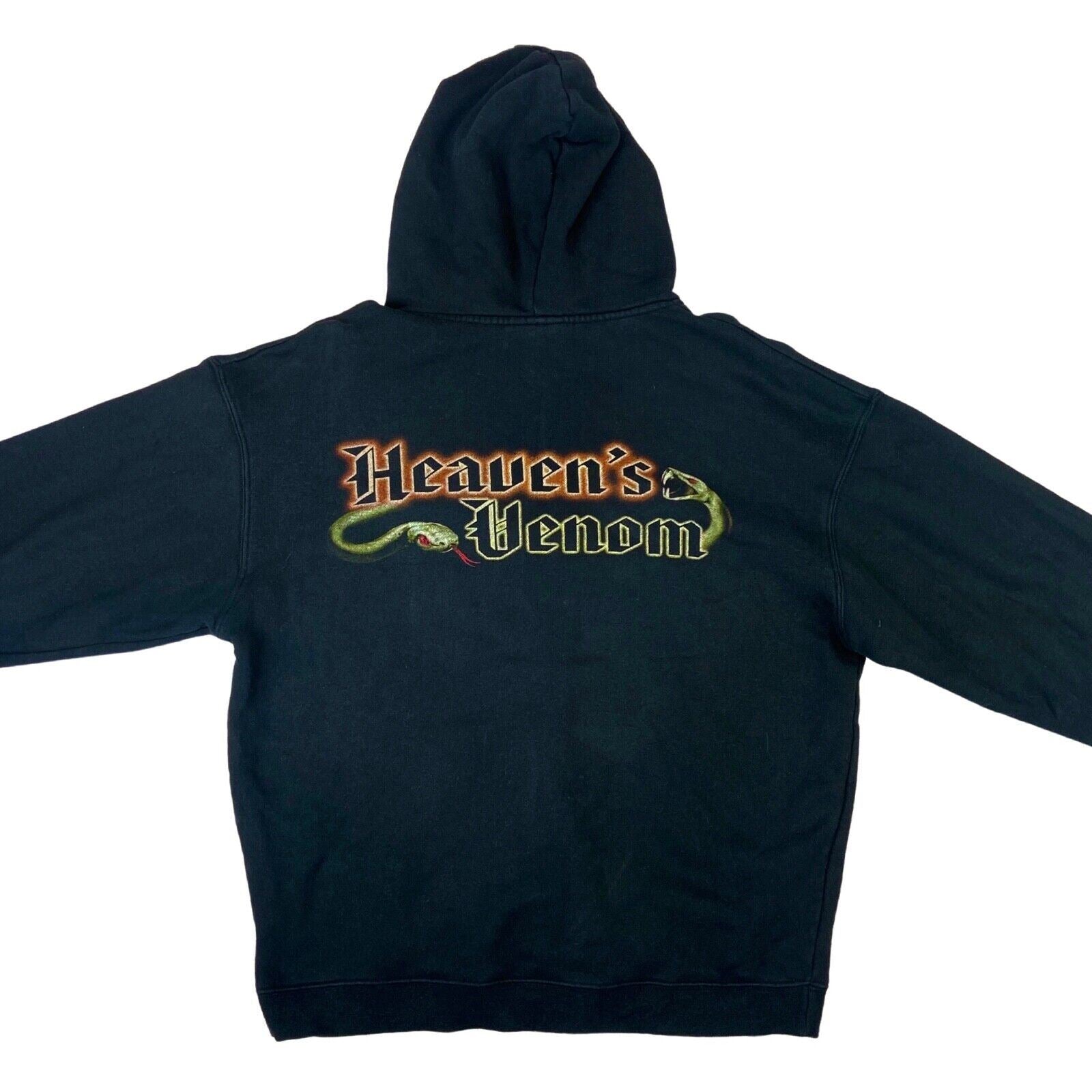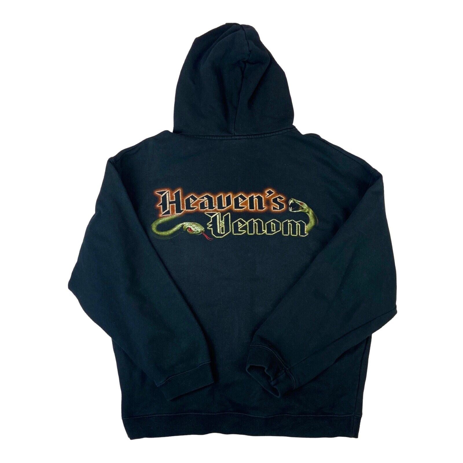 The main features include; a full front zip, two open front pockets, a large front printed graphic of the album artwork, a classic lined hood with a drawstring, the back graphic reads "Heaven's Venom" with two snakes.