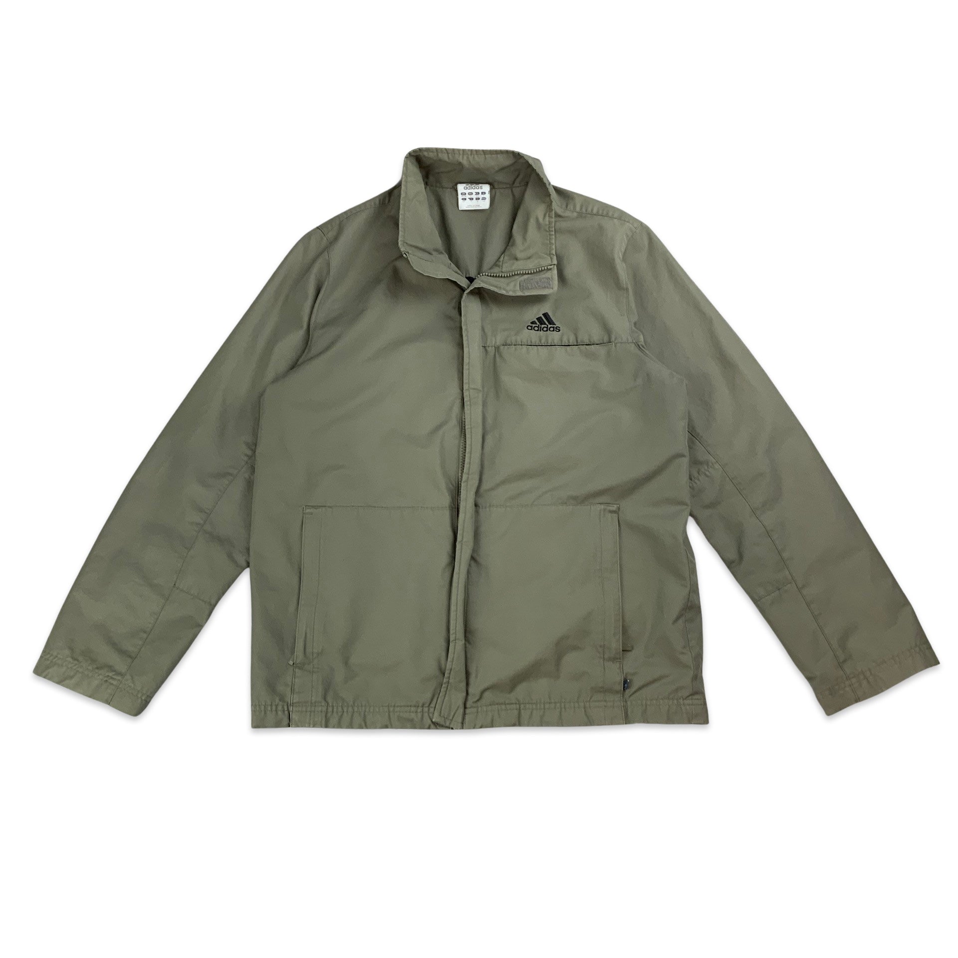 Men’s 2002 Adidas jacket. Khaki green with black logo and lining. Velcro & zip fastening. 3 front pockets.