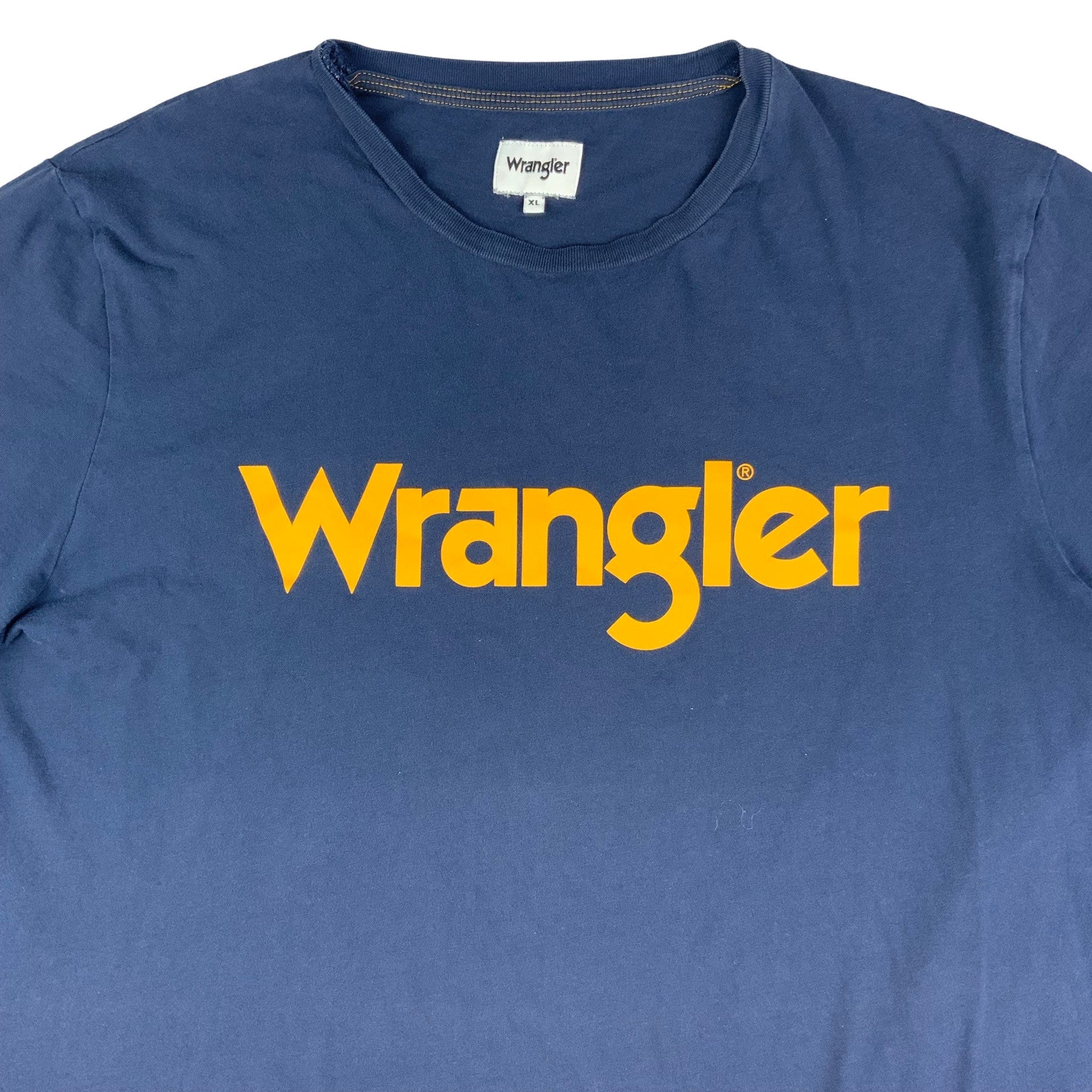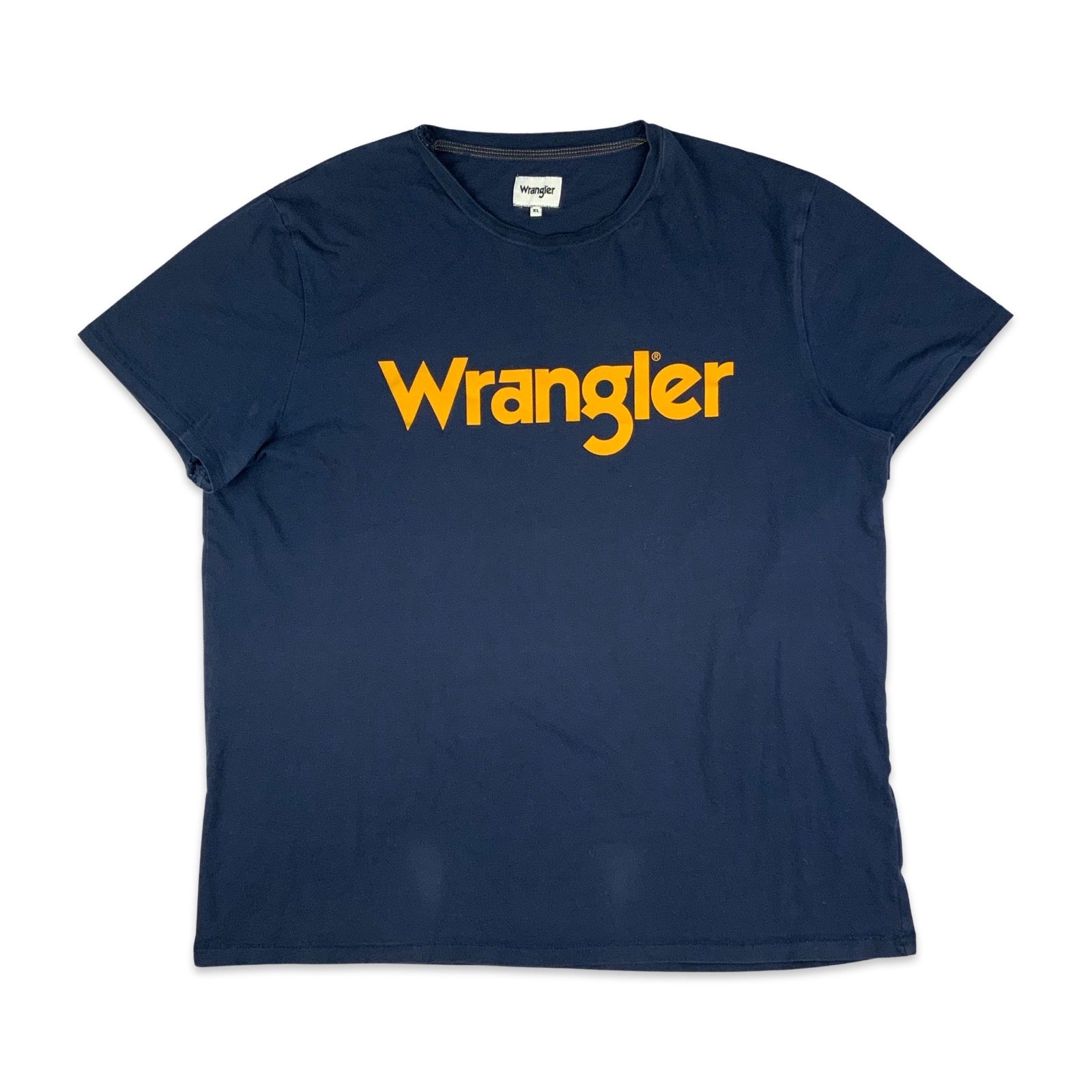 Men’s preloved 2019 Wrangler tshirt. Navy with mustard yellow printed logo on front. 100% Cotton.