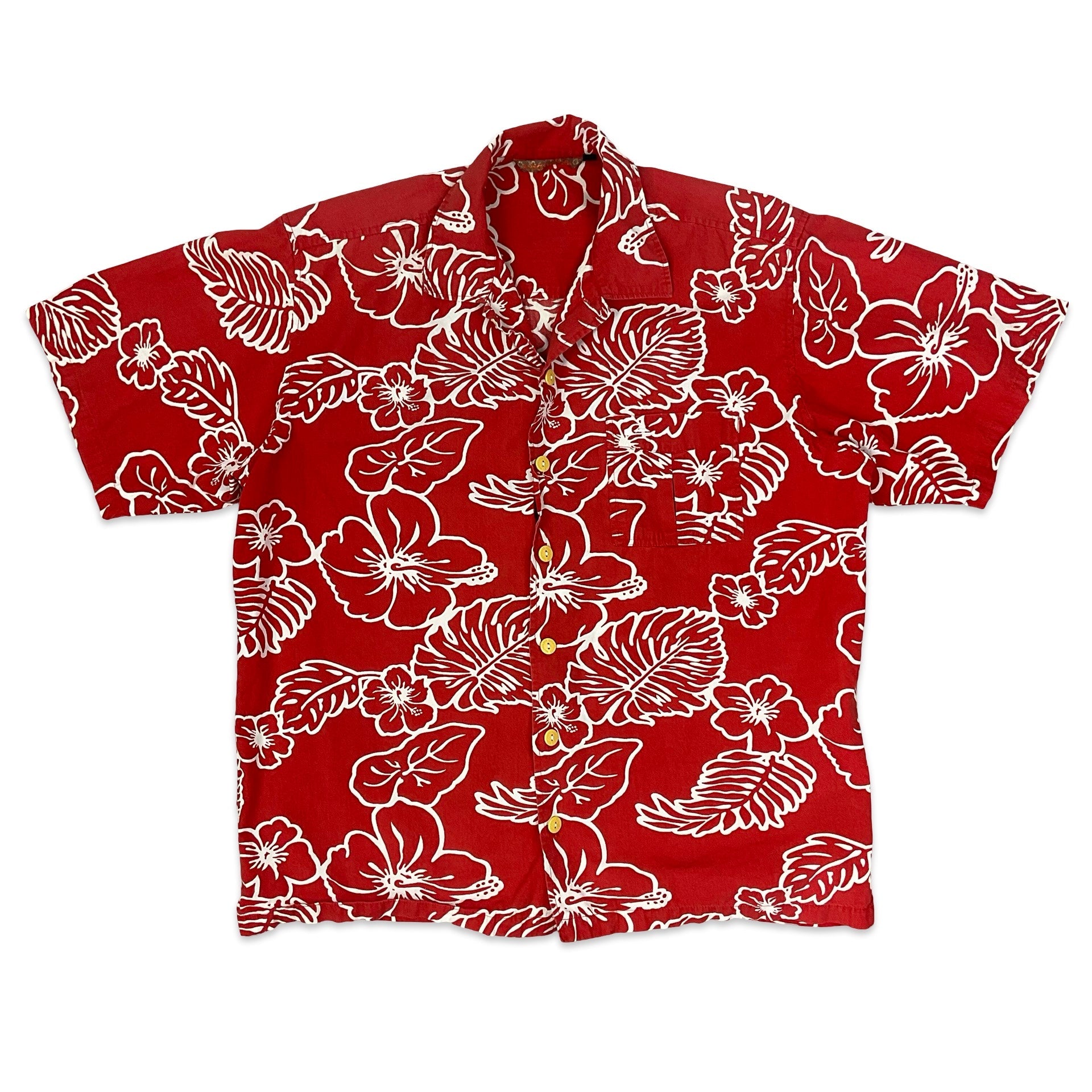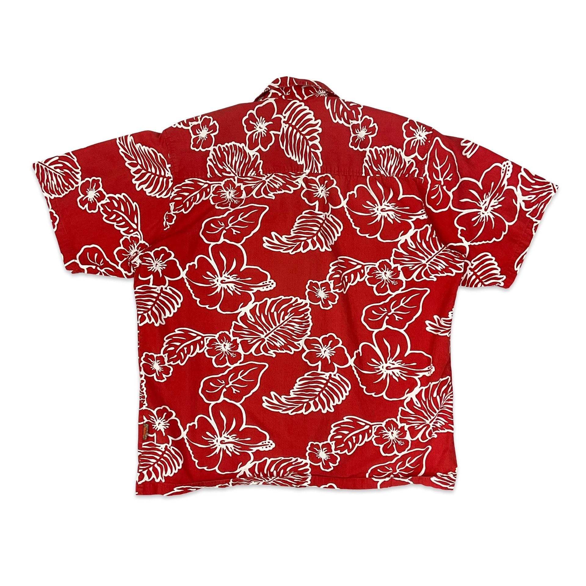 Preloved QuikSilver red and white floral print short sleeved shirt.