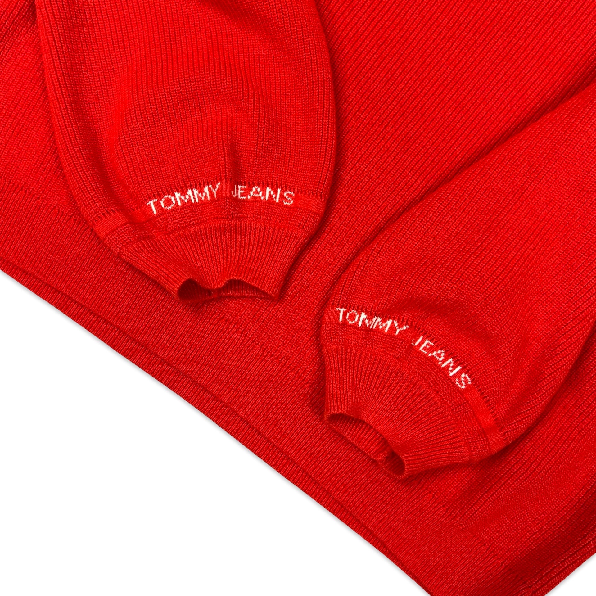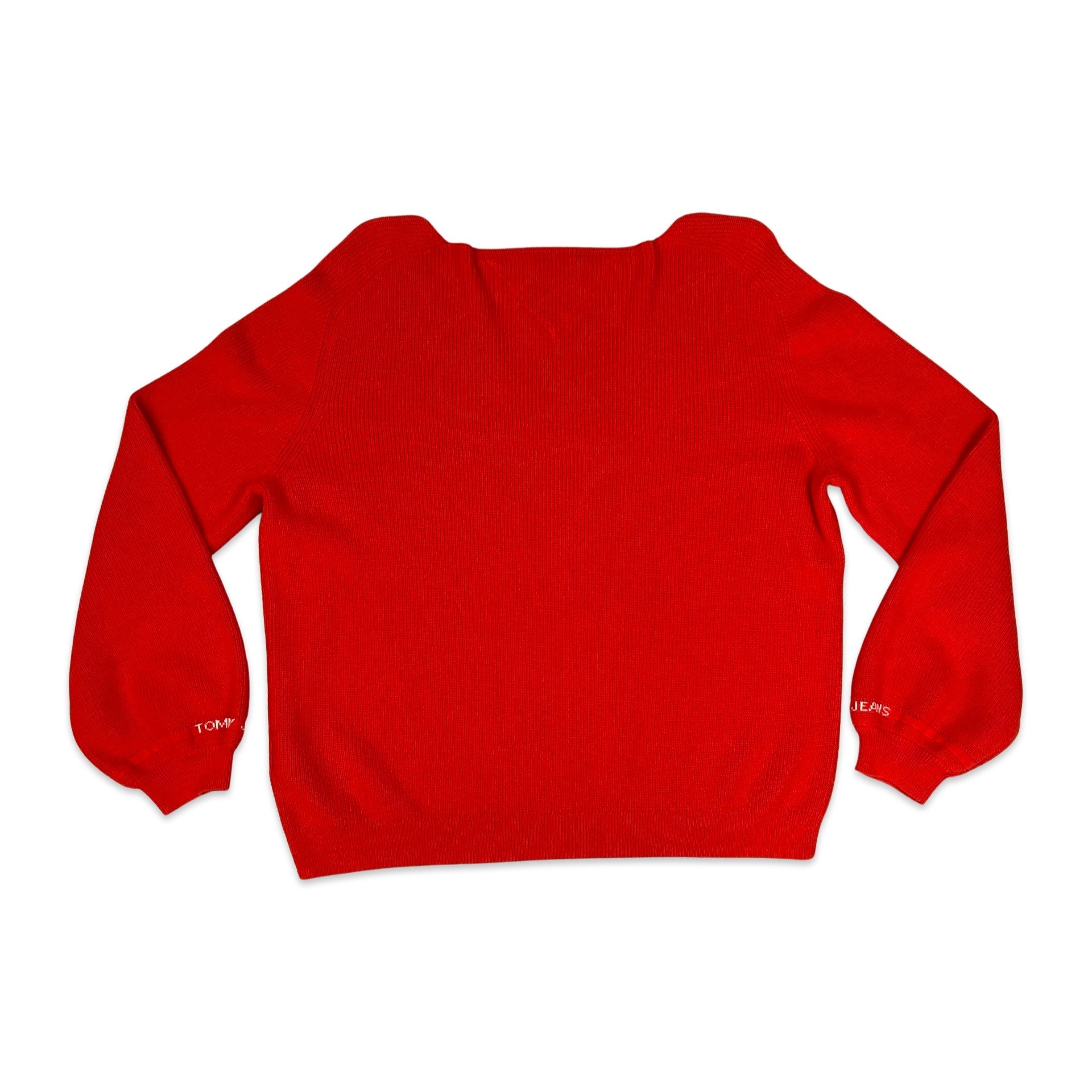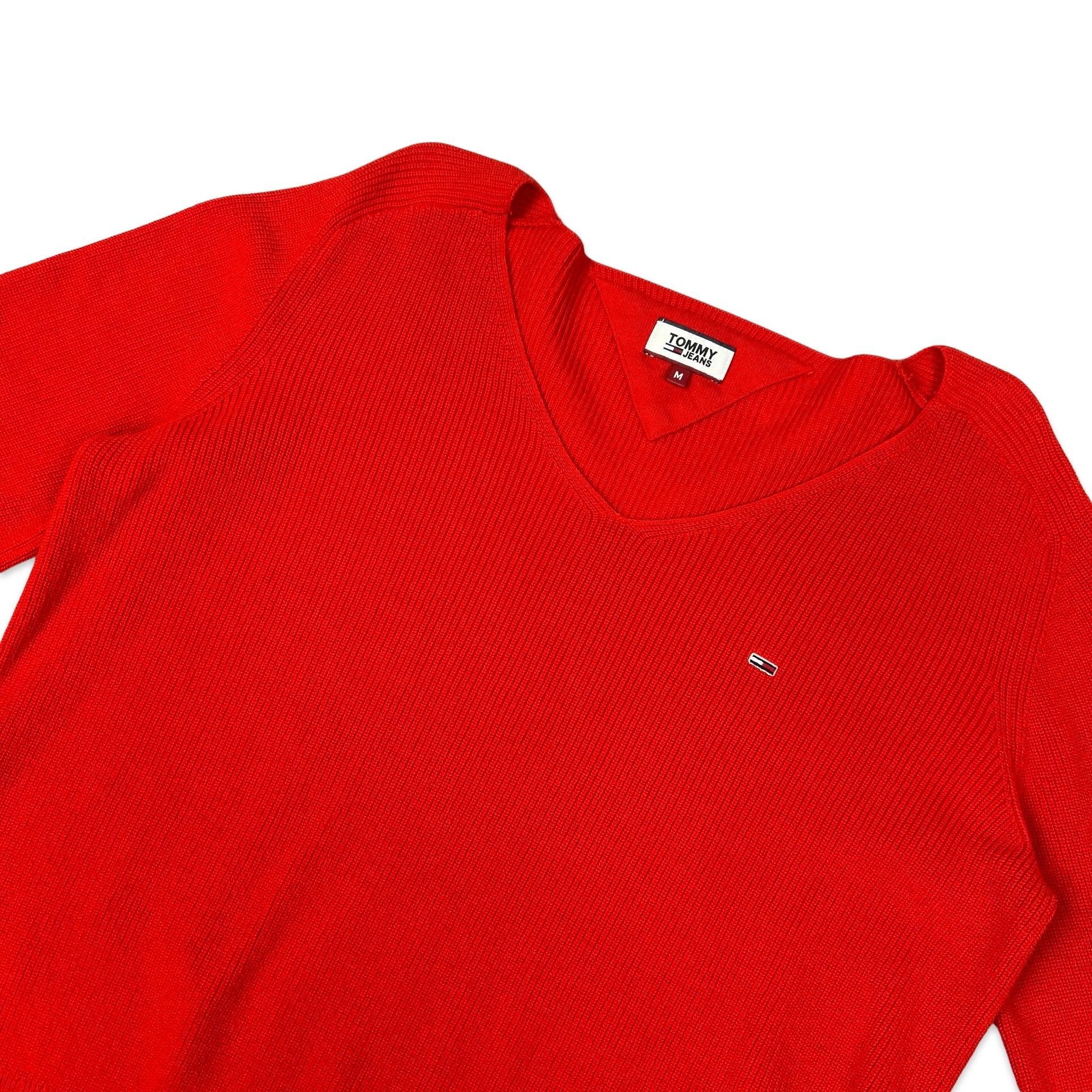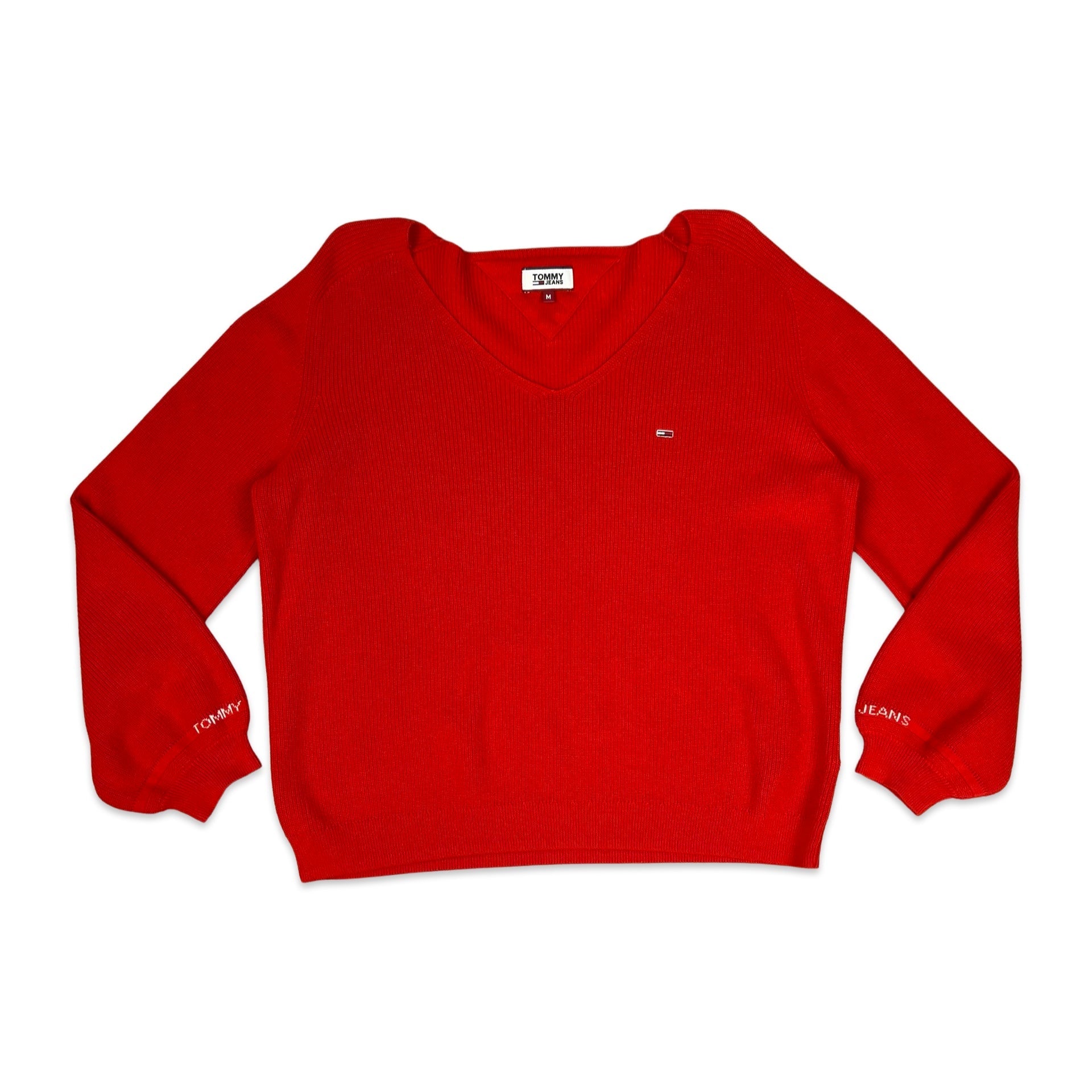 Preloved Tommy jeans red knit women's jumper with wide V-neck and cuff spell outs.