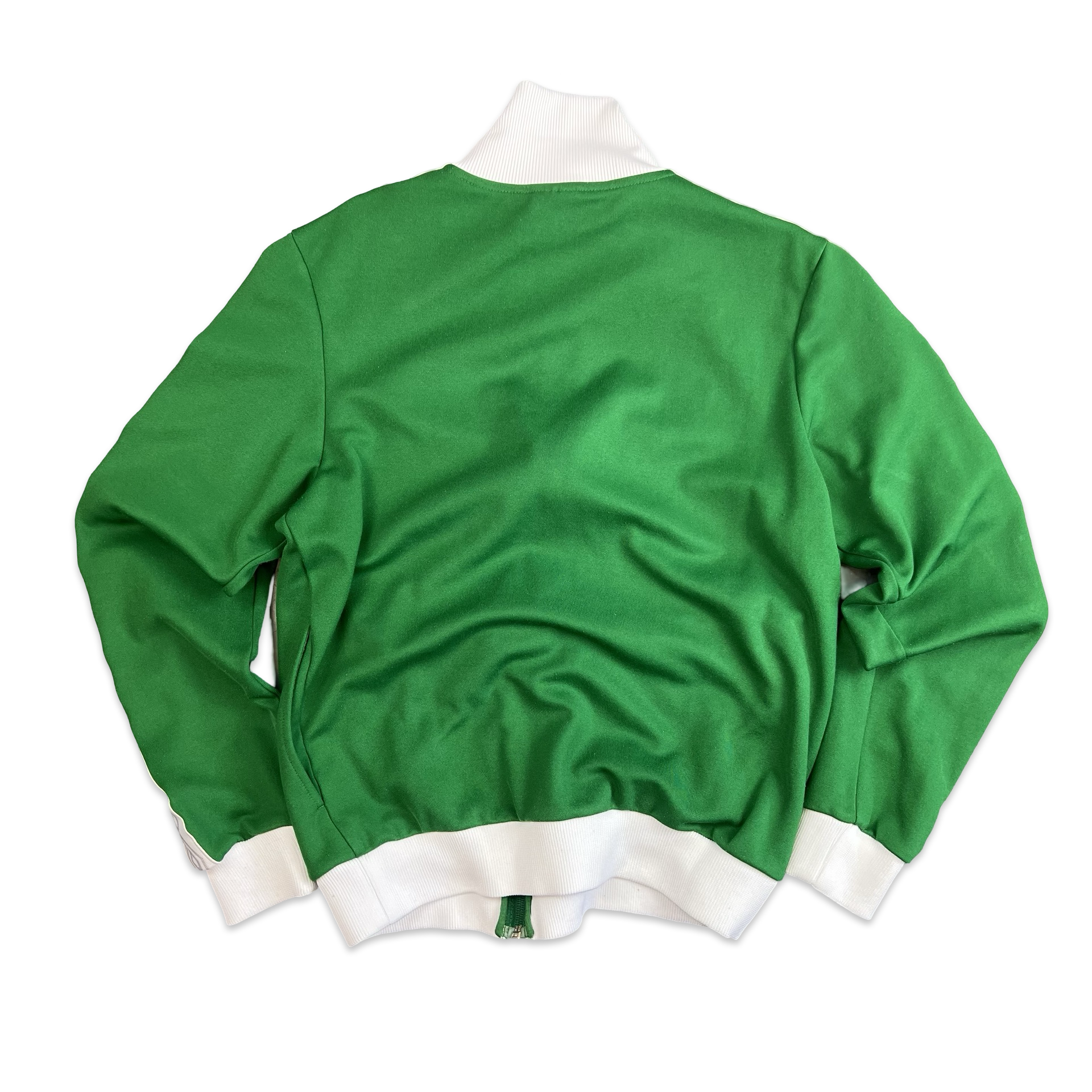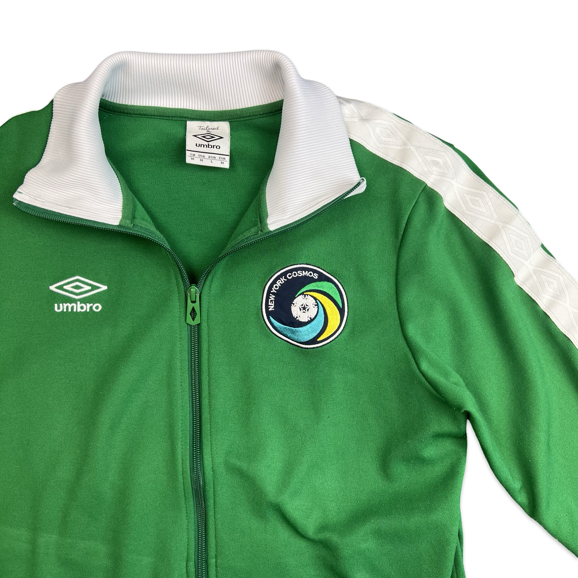 Retro Tailored by Umbro green and white zip-up track jacket with New York Cosmos football team branding.